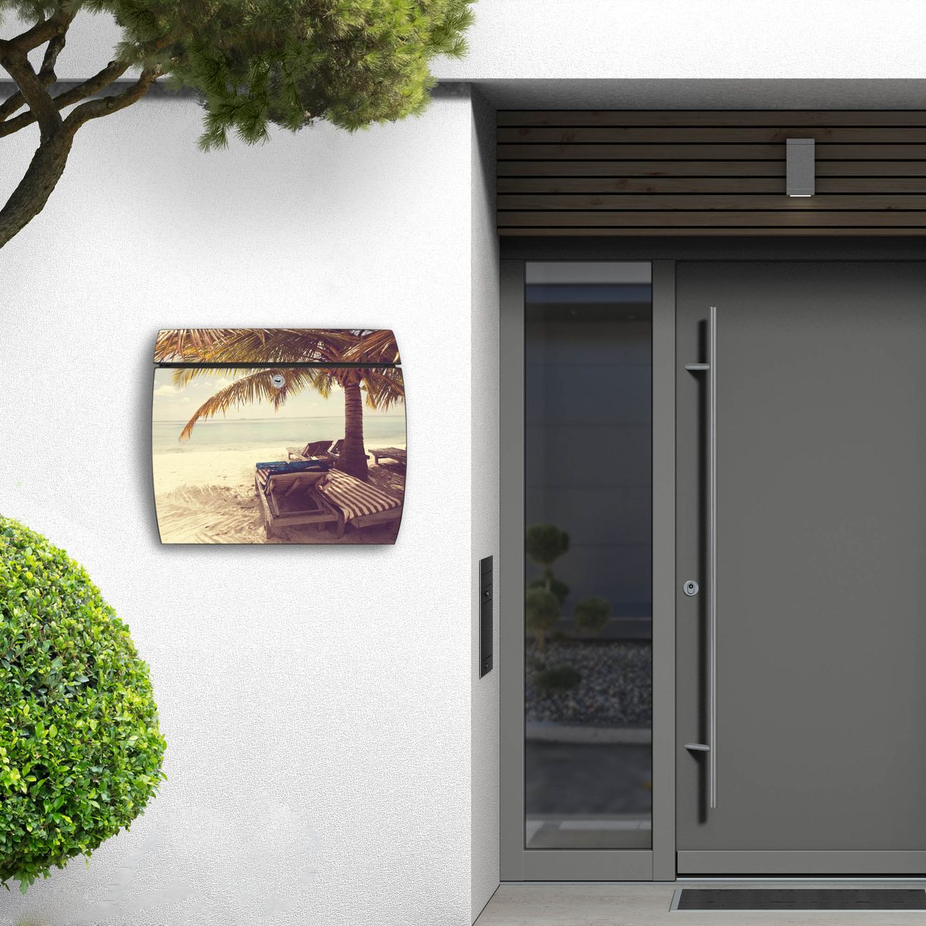 FUNKTION: DESIGN: Das Burg Wächter Modell Toscana mit Motiv Südseestrand hat ein sehr ansprechendes und zeitloses Design und ist besonderes wetterfest. Heben Sie Sich von der tristen grauen Masse ab, ohne auf Funktionalität zu verzichten. Wir bieten Ihnen ebenfalls Namensschilder, bereits beschriftet oder frei zu beschriften, und verschiedene selbst gestaltete Bitte-Keine-Werbung-Aufkleber. DETAILS: Der Postkasten besteht aus vollflächig verzinktem Stahl welcher in Anthrazit oder Weiß lackiert wurde oder aus Edelstahl (je nach gewählter Variante). Das Motiv besteht aus einer wetter- und UV-festen Folie, die mit einem Schutzlaminat überzogen ist, durch die Ihren Briefkasten zusätzlich vor Kratzern geschützt ist und auf den Briefkasten kaschiert wurde. Sie erhalten zu Ihrem neuen Design Briefkasten 2 Schlüssel sowie das passende Montagematerial. BANJADO: Ihr Briefkasten wird von Burg Wächter in Deutschland gefertigt und in unserer kleinen Manufaktur von Hand veredelt. Die Motivfolie ist lösungsmittelfrei und schutzlaminiert, dies sorgt für einen langen Halt. Wir legen großen Wert auf die Verbindung von Funktionalität und Design. Sie erhalten besondere Handarbeit aus Sachsen und Made in Germany.