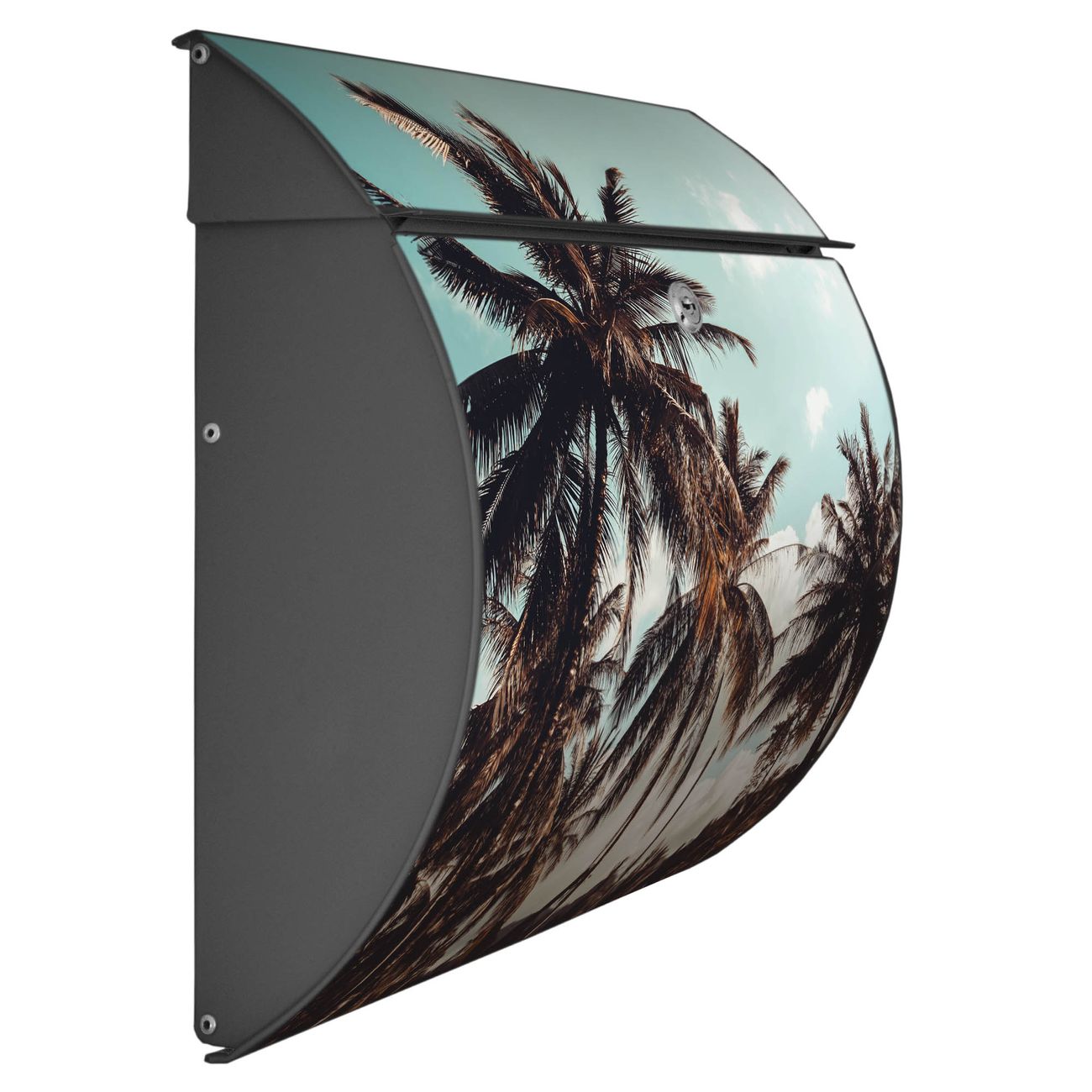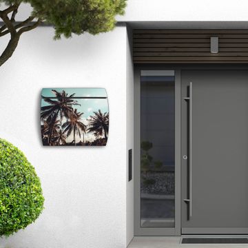 Der geschwungene Burg Wächter Briefkasten Toscana mit Motiv Unter Palmen bietet Ihnen mit seinem großen Fassungsvermögen genügend Platz auch für große A4 Sendungen. Auf Wunsch können Sie bei uns den passenden Standfuß bestellen und so aus dem Wandbriefkasten einen Standbriefkasten machen. Der integrierte Öffnungsstopp ermöglicht eine einfache Handhabung beim Entnehmen der Post.