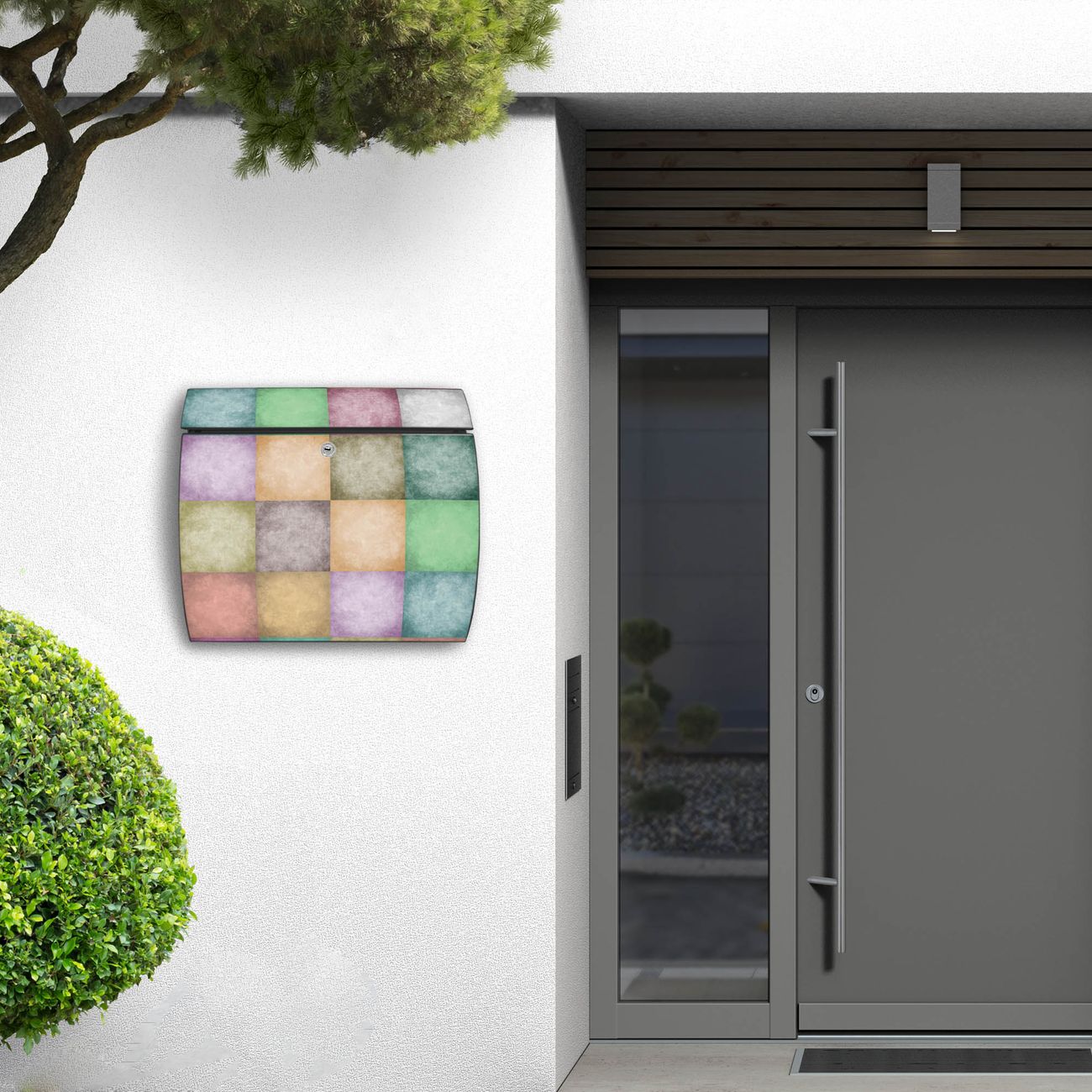 FUNKTION: DESIGN: Das Burg Wächter Modell Toscana mit Motiv Verwaschene Quadrate hat ein sehr ansprechendes und zeitloses Design und ist besonderes wetterfest. Heben Sie Sich von der tristen grauen Masse ab, ohne auf Funktionalität zu verzichten. Wir bieten Ihnen ebenfalls Namensschilder, bereits beschriftet oder frei zu beschriften, und verschiedene selbst gestaltete Bitte-Keine-Werbung-Aufkleber. DETAILS: Der Postkasten besteht aus vollflächig verzinktem Stahl welcher in Anthrazit oder Weiß lackiert wurde oder aus Edelstahl (je nach gewählter Variante). Das Motiv besteht aus einer wetter- und UV-festen Folie, die mit einem Schutzlaminat überzogen ist, durch die Ihren Briefkasten zusätzlich vor Kratzern geschützt ist und auf den Briefkasten kaschiert wurde. Sie erhalten zu Ihrem neuen Design Briefkasten 2 Schlüssel sowie das passende Montagematerial. BANJADO: Ihr Briefkasten wird von Burg Wächter in Deutschland gefertigt und in unserer kleinen Manufaktur von Hand veredelt. Die Motivfolie ist lösungsmittelfrei und schutzlaminiert, dies sorgt für einen langen Halt. Wir legen großen Wert auf die Verbindung von Funktionalität und Design. Sie erhalten besondere Handarbeit aus Sachsen und Made in Germany.