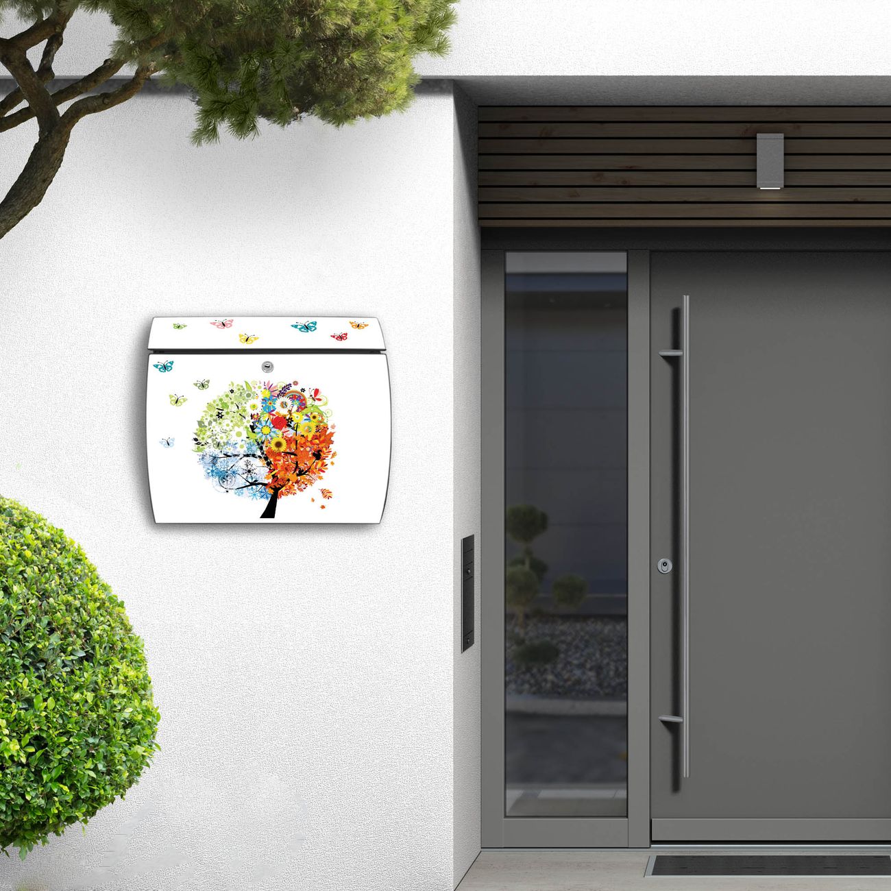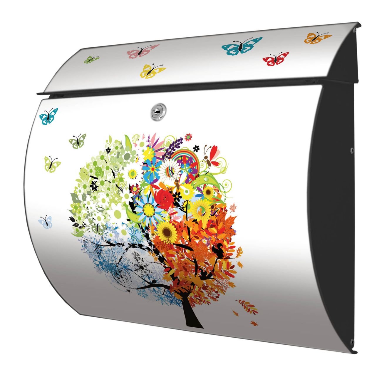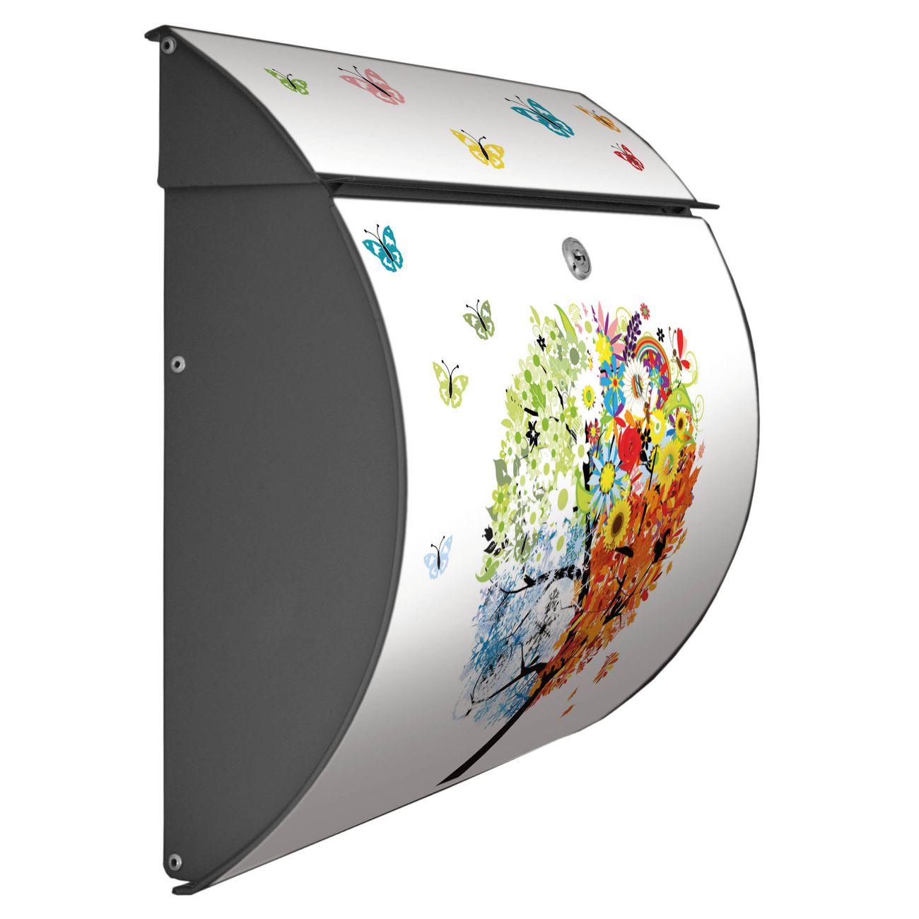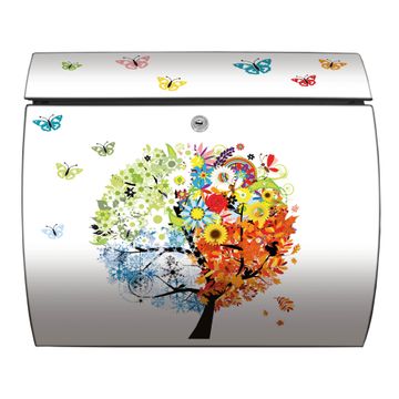 FUNKTION: DESIGN: Das Burg Wächter Modell Toscana mit Motiv Vier Jahreszeiten hat ein sehr ansprechendes und zeitloses Design und ist besonderes wetterfest. Heben Sie Sich von der tristen grauen Masse ab, ohne auf Funktionalität zu verzichten. Wir bieten Ihnen ebenfalls Namensschilder, bereits beschriftet oder frei zu beschriften, und verschiedene selbst gestaltete Bitte-Keine-Werbung-Aufkleber. DETAILS: Der Postkasten besteht aus vollflächig verzinktem Stahl welcher in Anthrazit oder Weiß lackiert wurde oder aus Edelstahl (je nach gewählter Variante). Das Motiv besteht aus einer wetter- und UV-festen Folie, die mit einem Schutzlaminat überzogen ist, durch die Ihren Briefkasten zusätzlich vor Kratzern geschützt ist und auf den Briefkasten kaschiert wurde. Sie erhalten zu Ihrem neuen Design Briefkasten 2 Schlüssel sowie das passende Montagematerial. BANJADO: Ihr Briefkasten wird von Burg Wächter in Deutschland gefertigt und in unserer kleinen Manufaktur von Hand veredelt. Die Motivfolie ist lösungsmittelfrei und schutzlaminiert, dies sorgt für einen langen Halt. Wir legen großen Wert auf die Verbindung von Funktionalität und Design. Sie erhalten besondere Handarbeit aus Sachsen und Made in Germany.