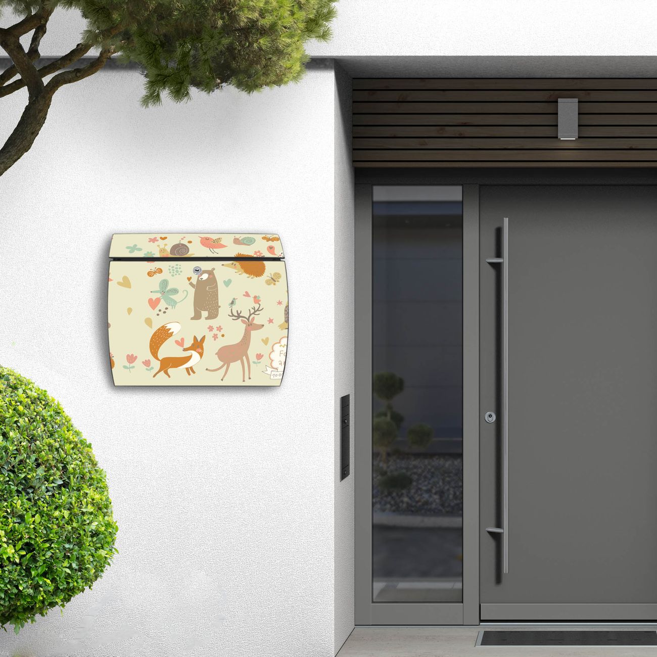 FUNKTION: DESIGN: Das Burg Wächter Modell Toscana mit Motiv Waldtiere hat ein sehr ansprechendes und zeitloses Design und ist besonderes wetterfest. Heben Sie Sich von der tristen grauen Masse ab, ohne auf Funktionalität zu verzichten. Wir bieten Ihnen ebenfalls Namensschilder, bereits beschriftet oder frei zu beschriften, und verschiedene selbst gestaltete Bitte-Keine-Werbung-Aufkleber. DETAILS: Der Postkasten besteht aus vollflächig verzinktem Stahl welcher in Anthrazit oder Weiß lackiert wurde oder aus Edelstahl (je nach gewählter Variante). Das Motiv besteht aus einer wetter- und UV-festen Folie, die mit einem Schutzlaminat überzogen ist, durch die Ihren Briefkasten zusätzlich vor Kratzern geschützt ist und auf den Briefkasten kaschiert wurde. Sie erhalten zu Ihrem neuen Design Briefkasten 2 Schlüssel sowie das passende Montagematerial. BANJADO: Ihr Briefkasten wird von Burg Wächter in Deutschland gefertigt und in unserer kleinen Manufaktur von Hand veredelt. Die Motivfolie ist lösungsmittelfrei und schutzlaminiert, dies sorgt für einen langen Halt. Wir legen großen Wert auf die Verbindung von Funktionalität und Design. Sie erhalten besondere Handarbeit aus Sachsen und Made in Germany.