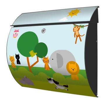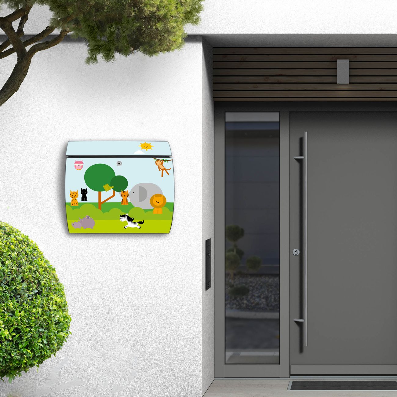 Der geschwungene Burg Wächter Briefkasten Toscana mit Motiv Wilde Tiere bietet Ihnen mit seinem großen Fassungsvermögen genügend Platz auch für große A4 Sendungen. Auf Wunsch können Sie bei uns den passenden Standfuß bestellen und so aus dem Wandbriefkasten einen Standbriefkasten machen. Der integrierte Öffnungsstopp ermöglicht eine einfache Handhabung beim Entnehmen der Post.