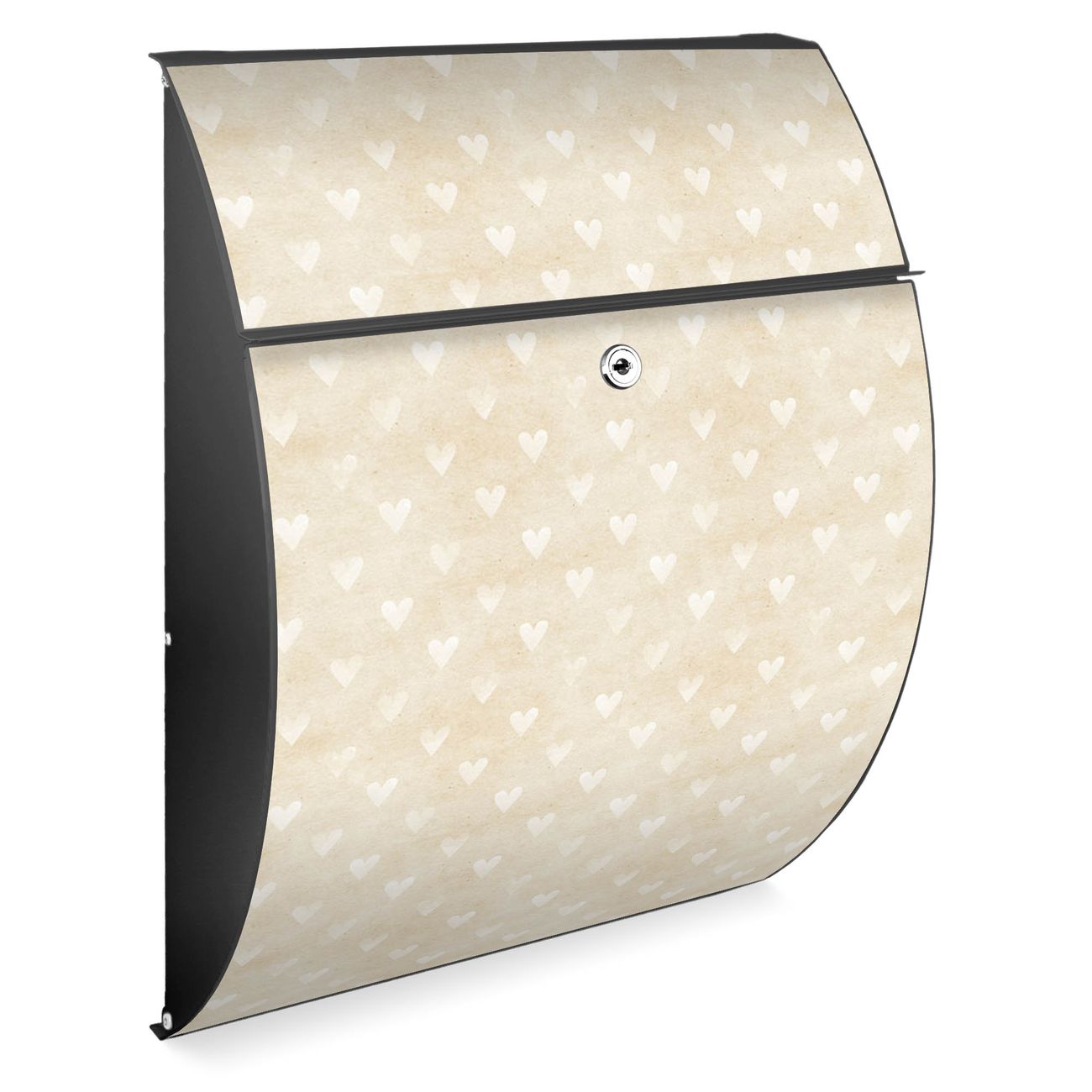 FUNKTION: DESIGN: Das Modell Riviera mit Motiv Beige Herzen hat ein sehr ansprechendes und zeitloses Design. Heben Sie Sich von der tristen grauen Masse ab, ohne auf Funktionalität zu verzichten. Der integrierte Öffnungsstopp ermöglicht eine einfache Handhabung beim Entnehmen der Post. DETAILS: Der Postkasten besteht aus vollflächig verzinktem Stahl welcher in Anthrazit lackiert wurde. Das Motiv besteht aus einer wetter- und UV-festen Folie, die mit einem Schutzlaminat überzogen ist, durch die Ihren Briefkasten zusätzlich vor Kratzern geschützt ist. Sie erhalten 2 Schlüssel sowie das passende Montagematerial. NUTZEN: Sie können den Briefkasten sowohl als Wandbriefkasten montieren oder einen passenden Ständer kaufen und als Standbriefkasten einbetonieren. Die Größe bietet genügend Platz für Sendungen aller Art, der Einwurf fasst auch größere A4 Sendungen. BANJADO: Ihr Briefkasten wird in Sachsen in einer kleinen Manufaktur von Hand veredelt. Die Motivfolie ist lösungsmittelfrei und schutzlaminiert, dies sorgt für einen langen Halt. Wir legen großen Wert auf die Verbindung von Funktionalität und Design. Sie erhalten Handarbeit aus Sachsen.