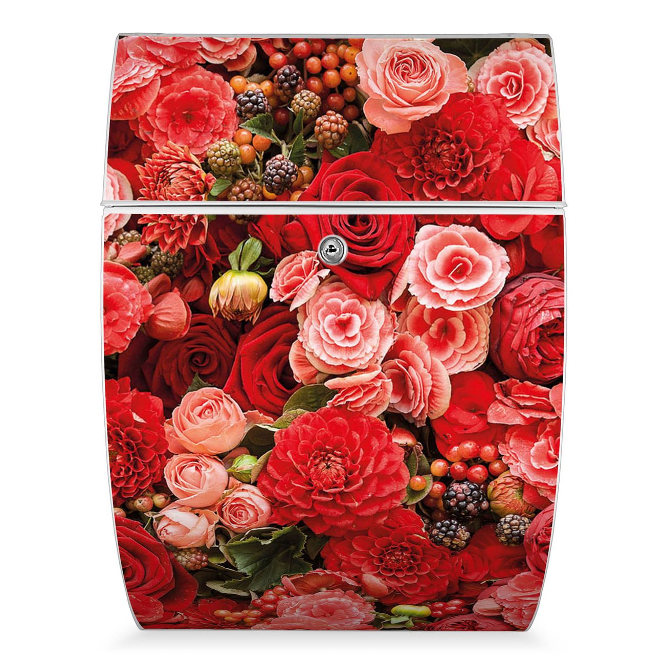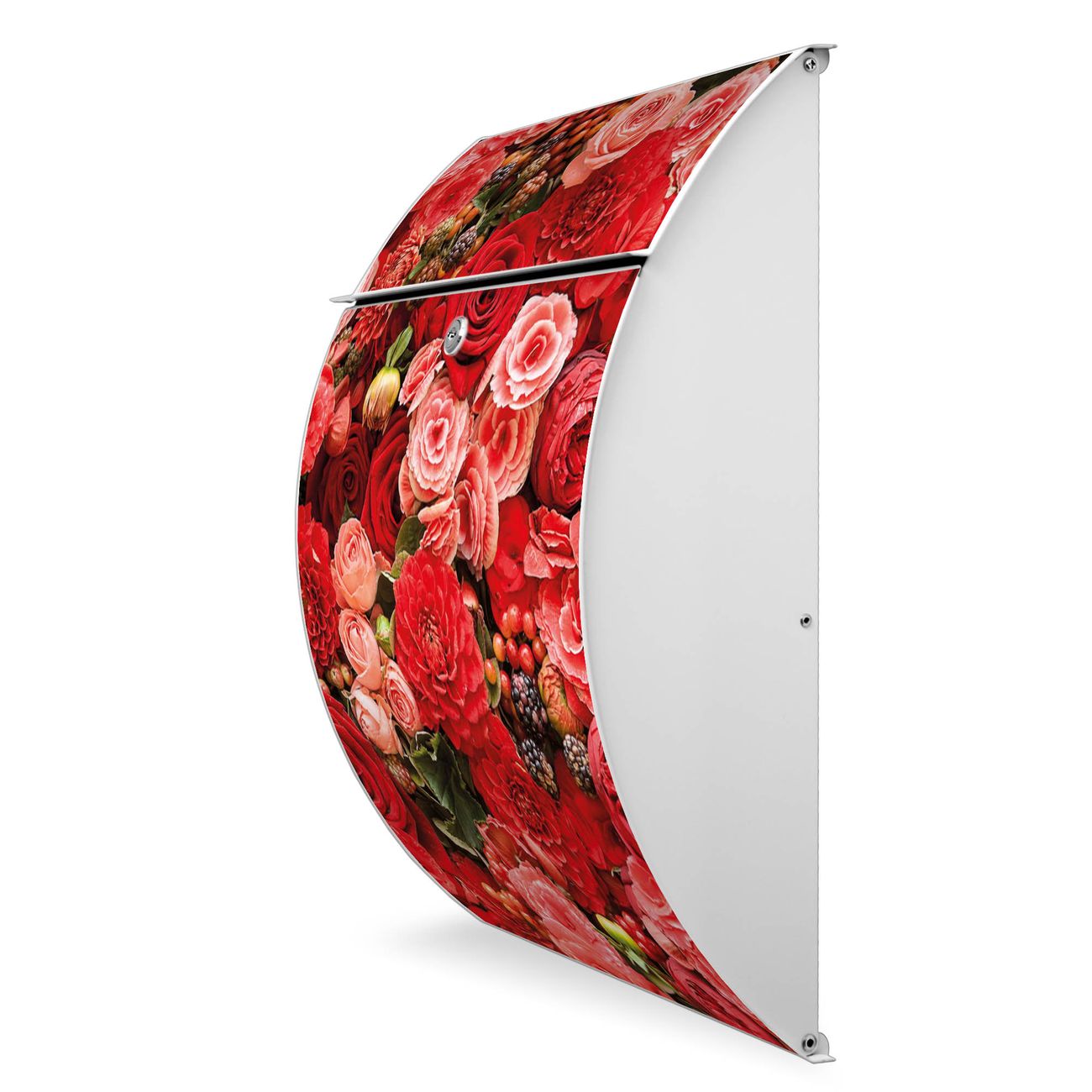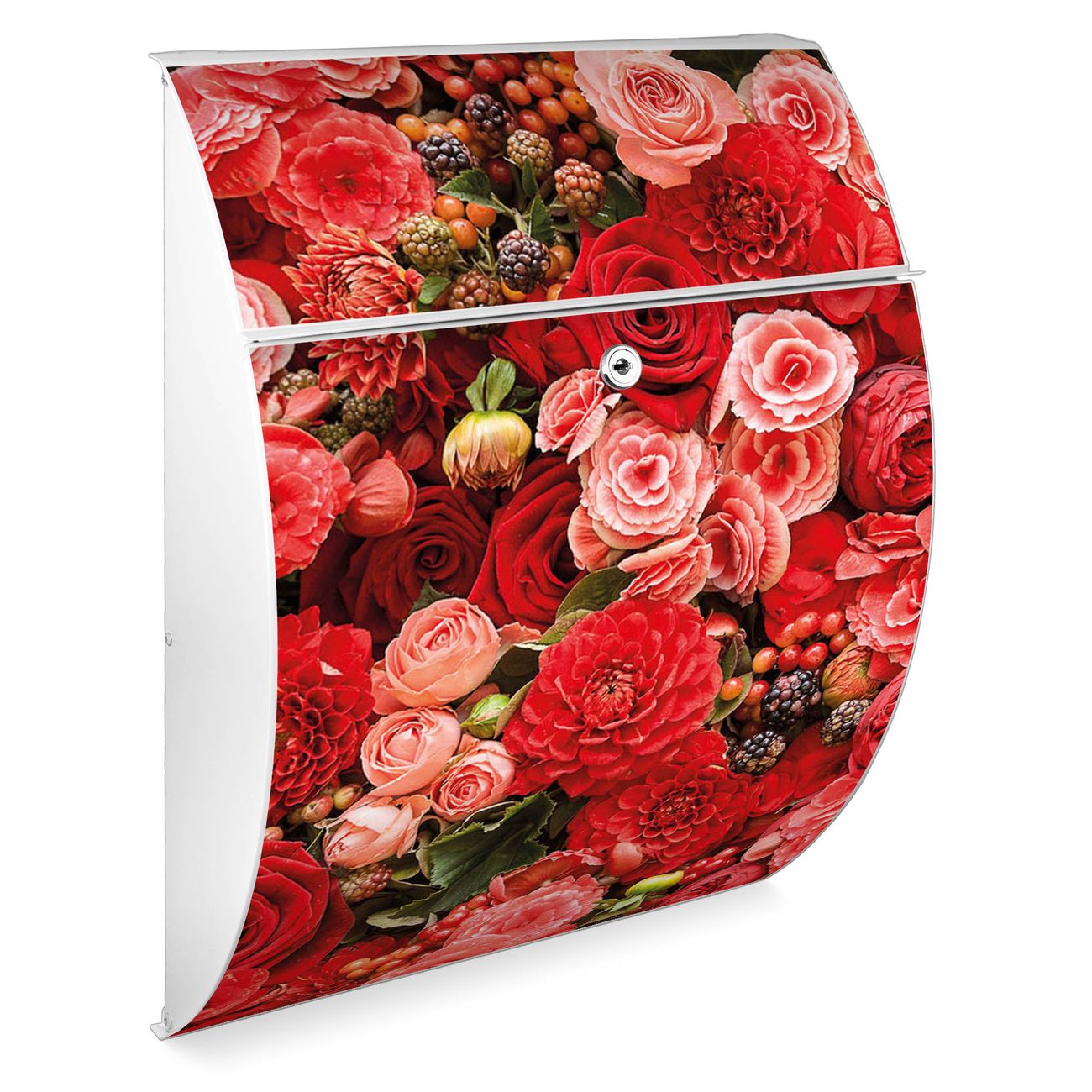 Der weiße Burg Wächter Design Briefkasten mit Motiv Bouquet in Rot bietet Ihnen mit seinem Fassungsvermögen genügend Platz auch für große A4 Sendungen. Auf Wunsch können Sie bei uns auch den passenden Ständer kaufen und so aus dem Wandbriefkasten einen Standbriefkasten machen.