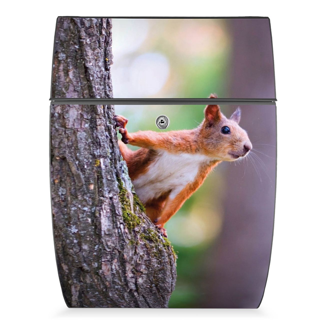 FUNKTION: DESIGN: Das Modell Riviera mit Motiv Eichhörnchen hat ein sehr ansprechendes und zeitloses Design. Heben Sie Sich von der tristen grauen Masse ab, ohne auf Funktionalität zu verzichten. Der integrierte Öffnungsstopp ermöglicht eine einfache Handhabung beim Entnehmen der Post. DETAILS: Der Postkasten besteht aus vollflächig verzinktem Stahl welcher in Anthrazit lackiert wurde. Das Motiv besteht aus einer wetter- und UV-festen Folie, die mit einem Schutzlaminat überzogen ist, durch die Ihren Briefkasten zusätzlich vor Kratzern geschützt ist. Sie erhalten 2 Schlüssel sowie das passende Montagematerial. NUTZEN: Sie können den Briefkasten sowohl als Wandbriefkasten montieren oder einen passenden Ständer kaufen und als Standbriefkasten einbetonieren. Die Größe bietet genügend Platz für Sendungen aller Art, der Einwurf fasst auch größere A4 Sendungen. BANJADO: Ihr Briefkasten wird in Sachsen in einer kleinen Manufaktur von Hand veredelt. Die Motivfolie ist lösungsmittelfrei und schutzlaminiert, dies sorgt für einen langen Halt. Wir legen großen Wert auf die Verbindung von Funktionalität und Design. Sie erhalten Handarbeit aus Sachsen.