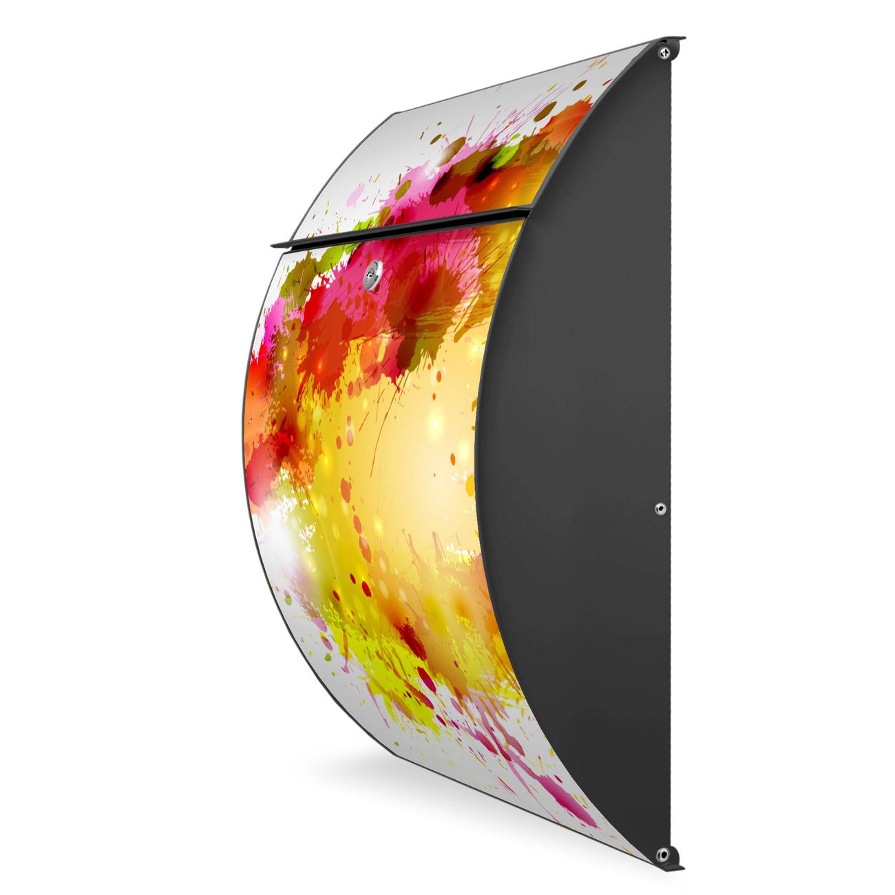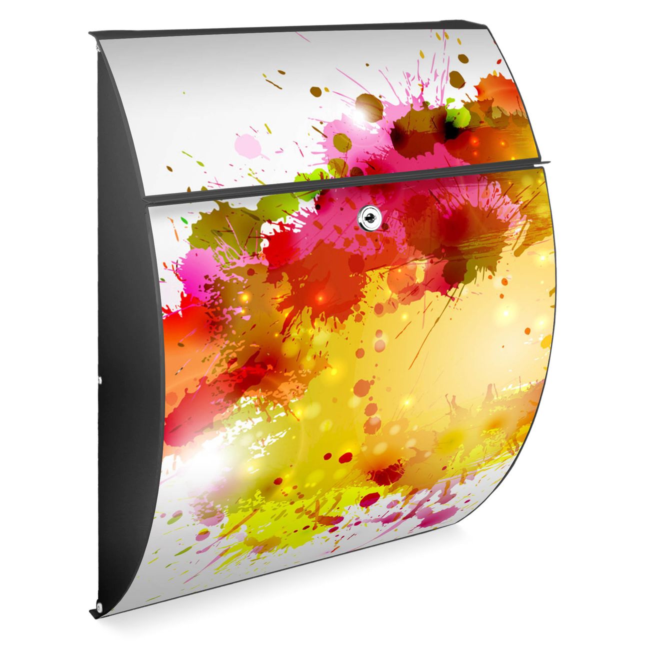 FUNKTION: DESIGN: Das Modell Riviera mit Motiv Farbkleckse hat ein sehr ansprechendes und zeitloses Design. Heben Sie Sich von der tristen grauen Masse ab, ohne auf Funktionalität zu verzichten. Der integrierte Öffnungsstopp ermöglicht eine einfache Handhabung beim Entnehmen der Post. DETAILS: Der Postkasten besteht aus vollflächig verzinktem Stahl welcher in Anthrazit lackiert wurde. Das Motiv besteht aus einer wetter- und UV-festen Folie, die mit einem Schutzlaminat überzogen ist, durch die Ihren Briefkasten zusätzlich vor Kratzern geschützt ist. Sie erhalten 2 Schlüssel sowie das passende Montagematerial. NUTZEN: Sie können den Briefkasten sowohl als Wandbriefkasten montieren oder einen passenden Ständer kaufen und als Standbriefkasten einbetonieren. Die Größe bietet genügend Platz für Sendungen aller Art, der Einwurf fasst auch größere A4 Sendungen. BANJADO: Ihr Briefkasten wird in Sachsen in einer kleinen Manufaktur von Hand veredelt. Die Motivfolie ist lösungsmittelfrei und schutzlaminiert, dies sorgt für einen langen Halt. Wir legen großen Wert auf die Verbindung von Funktionalität und Design. Sie erhalten Handarbeit aus Sachsen.