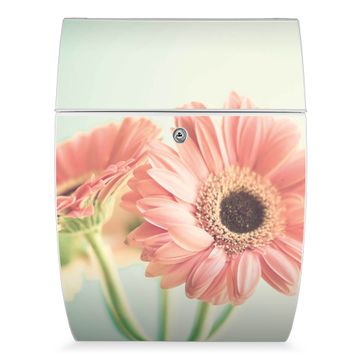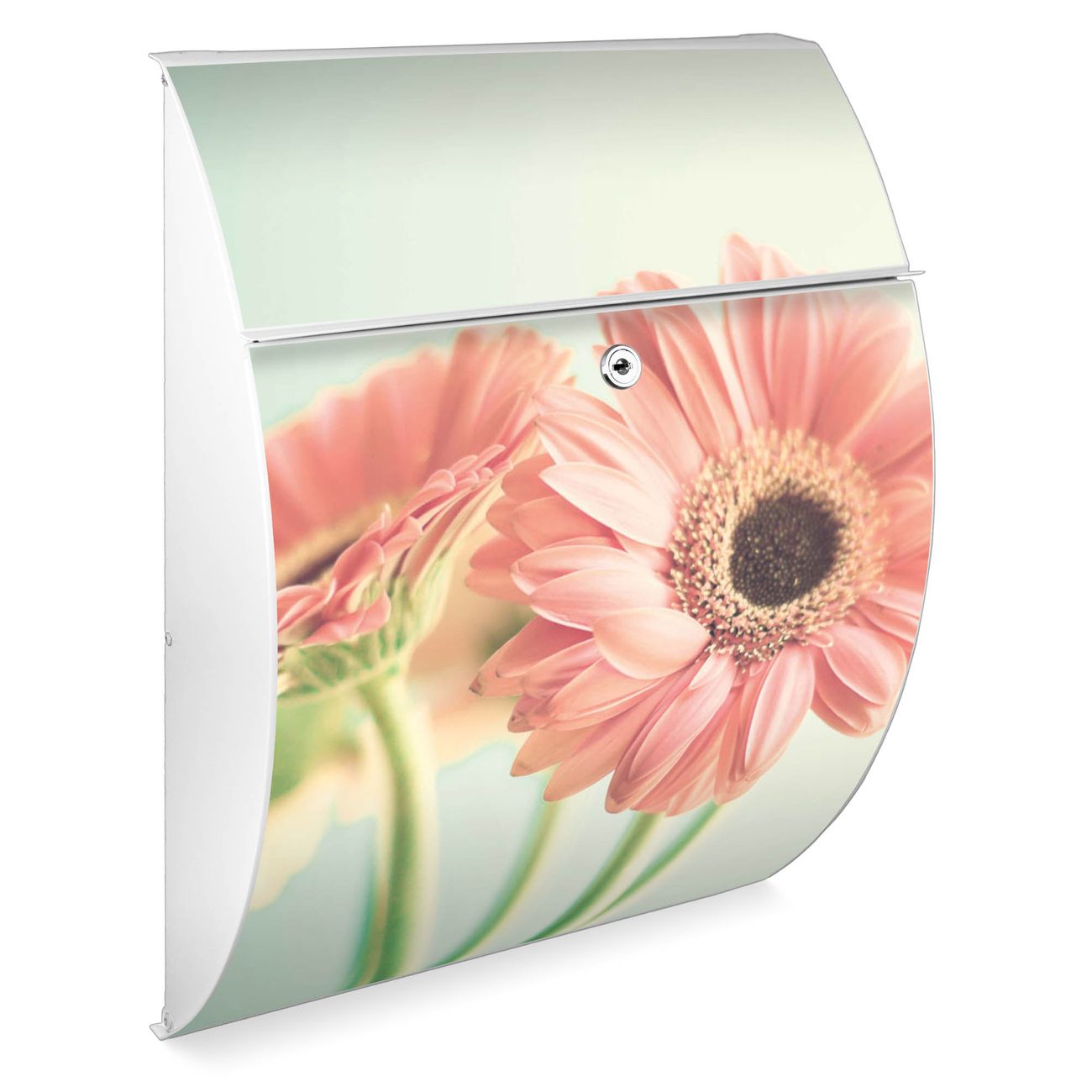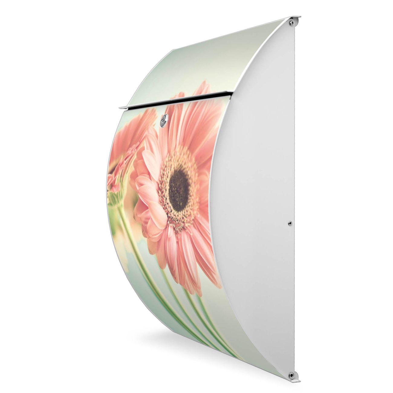 Der weiße Burg Wächter Design Briefkasten mit Motiv Fünf Gerbera bietet Ihnen mit seinem Fassungsvermögen genügend Platz auch für große A4 Sendungen. Auf Wunsch können Sie bei uns auch den passenden Ständer kaufen und so aus dem Wandbriefkasten einen Standbriefkasten machen.