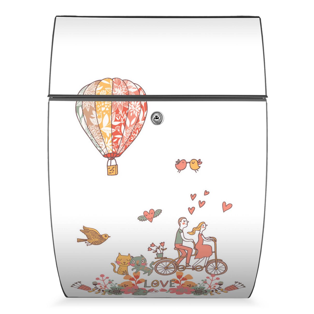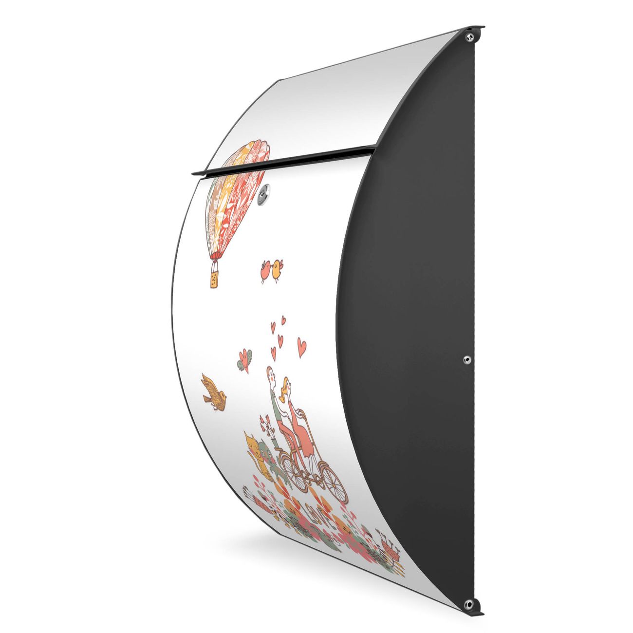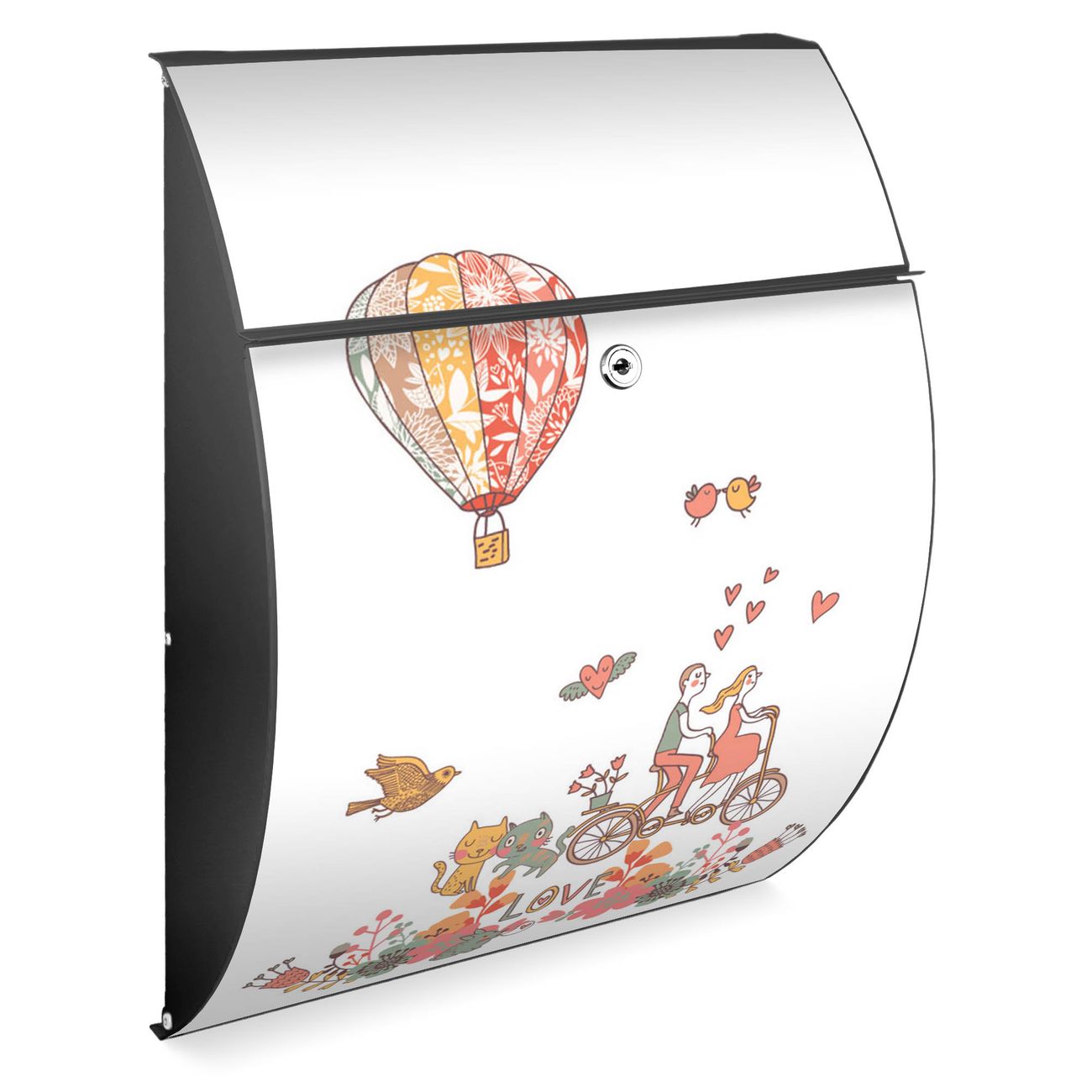 FUNKTION: DESIGN: Das Modell Riviera mit Motiv Love hat ein sehr ansprechendes und zeitloses Design. Heben Sie Sich von der tristen grauen Masse ab, ohne auf Funktionalität zu verzichten. Der integrierte Öffnungsstopp ermöglicht eine einfache Handhabung beim Entnehmen der Post. DETAILS: Der Postkasten besteht aus vollflächig verzinktem Stahl welcher in Anthrazit lackiert wurde. Das Motiv besteht aus einer wetter- und UV-festen Folie, die mit einem Schutzlaminat überzogen ist, durch die Ihren Briefkasten zusätzlich vor Kratzern geschützt ist. Sie erhalten 2 Schlüssel sowie das passende Montagematerial. NUTZEN: Sie können den Briefkasten sowohl als Wandbriefkasten montieren oder einen passenden Ständer kaufen und als Standbriefkasten einbetonieren. Die Größe bietet genügend Platz für Sendungen aller Art, der Einwurf fasst auch größere A4 Sendungen. BANJADO: Ihr Briefkasten wird in Sachsen in einer kleinen Manufaktur von Hand veredelt. Die Motivfolie ist lösungsmittelfrei und schutzlaminiert, dies sorgt für einen langen Halt. Wir legen großen Wert auf die Verbindung von Funktionalität und Design. Sie erhalten Handarbeit aus Sachsen.