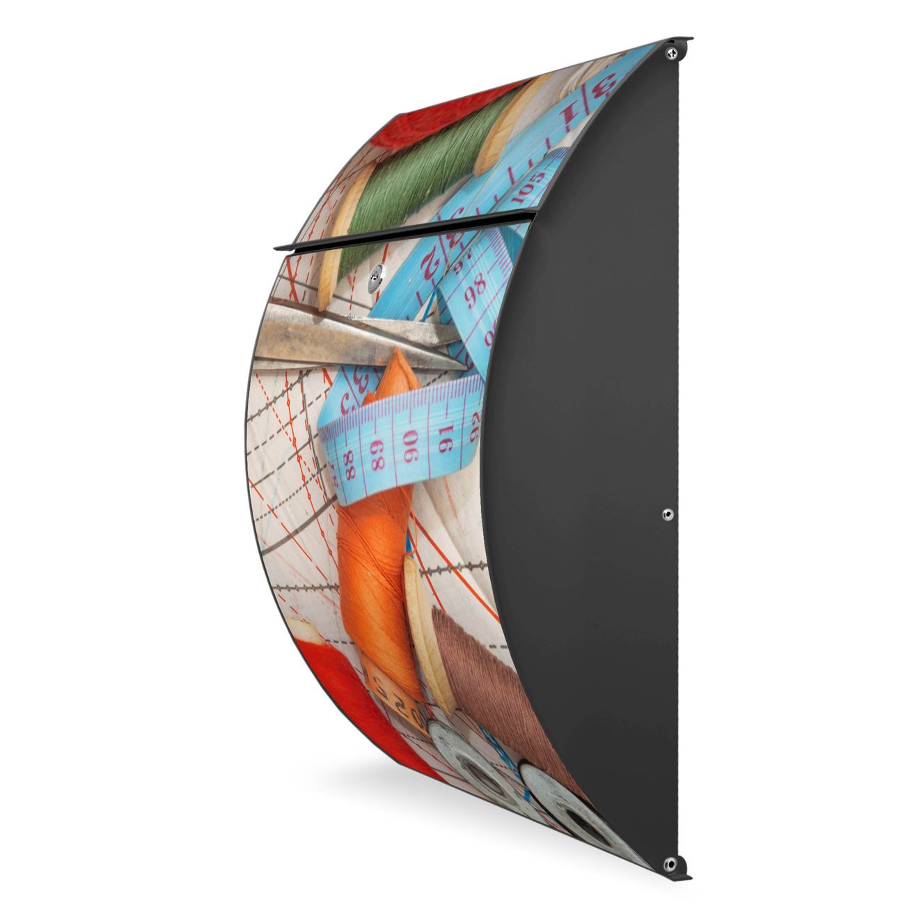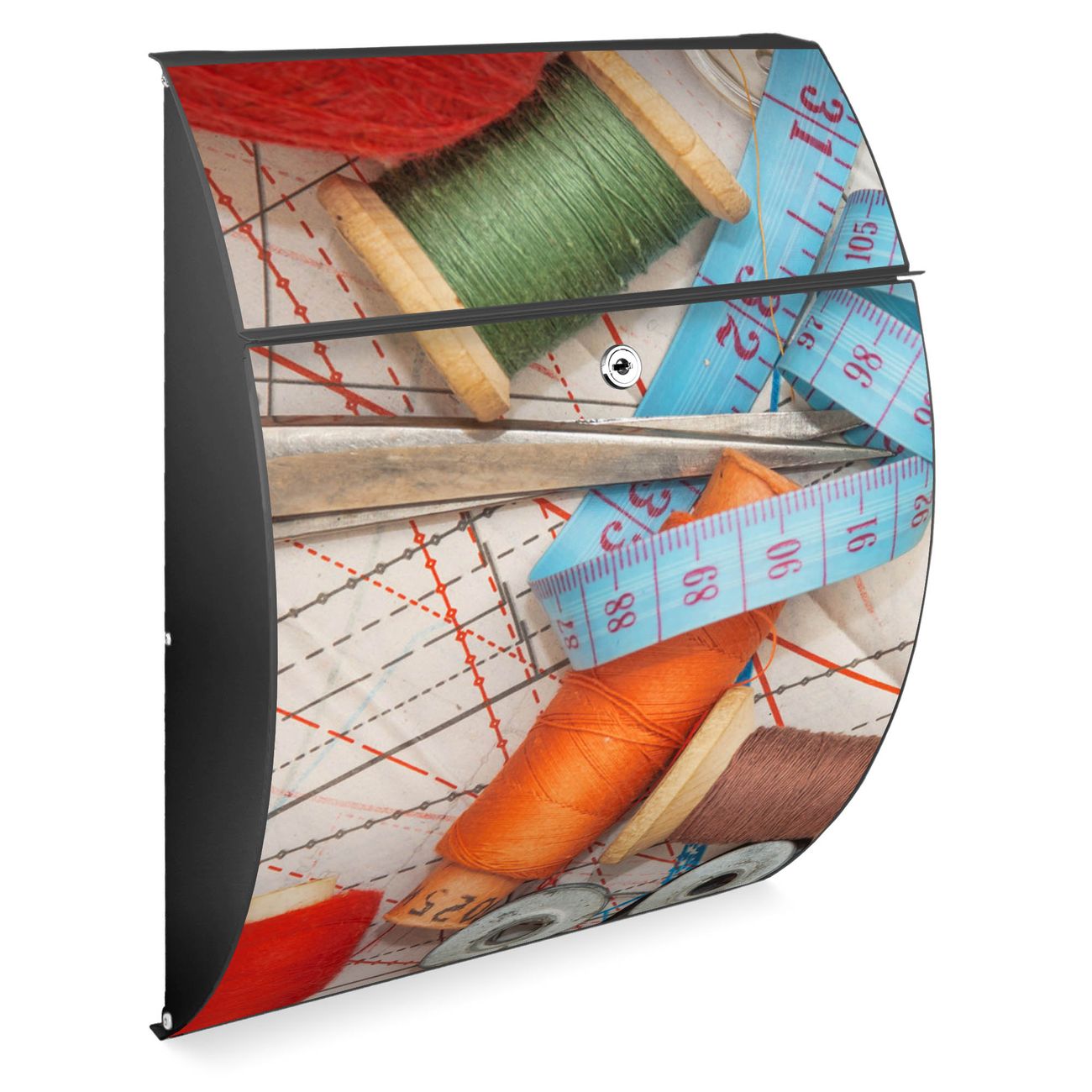FUNKTION: DESIGN: Das Modell Riviera mit Motiv Nähen hat ein sehr ansprechendes und zeitloses Design. Heben Sie Sich von der tristen grauen Masse ab, ohne auf Funktionalität zu verzichten. Der integrierte Öffnungsstopp ermöglicht eine einfache Handhabung beim Entnehmen der Post. DETAILS: Der Postkasten besteht aus vollflächig verzinktem Stahl welcher in Anthrazit lackiert wurde. Das Motiv besteht aus einer wetter- und UV-festen Folie, die mit einem Schutzlaminat überzogen ist, durch die Ihren Briefkasten zusätzlich vor Kratzern geschützt ist. Sie erhalten 2 Schlüssel sowie das passende Montagematerial. NUTZEN: Sie können den Briefkasten sowohl als Wandbriefkasten montieren oder einen passenden Ständer kaufen und als Standbriefkasten einbetonieren. Die Größe bietet genügend Platz für Sendungen aller Art, der Einwurf fasst auch größere A4 Sendungen. BANJADO: Ihr Briefkasten wird in Sachsen in einer kleinen Manufaktur von Hand veredelt. Die Motivfolie ist lösungsmittelfrei und schutzlaminiert, dies sorgt für einen langen Halt. Wir legen großen Wert auf die Verbindung von Funktionalität und Design. Sie erhalten Handarbeit aus Sachsen.