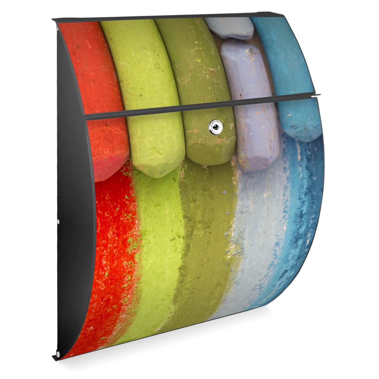 FUNKTION: DESIGN: Das Modell Riviera mit Motiv Regenbogenkreide hat ein sehr ansprechendes und zeitloses Design. Heben Sie Sich von der tristen grauen Masse ab, ohne auf Funktionalität zu verzichten. Der integrierte Öffnungsstopp ermöglicht eine einfache Handhabung beim Entnehmen der Post. DETAILS: Der Postkasten besteht aus vollflächig verzinktem Stahl welcher in Anthrazit lackiert wurde. Das Motiv besteht aus einer wetter- und UV-festen Folie, die mit einem Schutzlaminat überzogen ist, durch die Ihren Briefkasten zusätzlich vor Kratzern geschützt ist. Sie erhalten 2 Schlüssel sowie das passende Montagematerial. NUTZEN: Sie können den Briefkasten sowohl als Wandbriefkasten montieren oder einen passenden Ständer kaufen und als Standbriefkasten einbetonieren. Die Größe bietet genügend Platz für Sendungen aller Art, der Einwurf fasst auch größere A4 Sendungen. BANJADO: Ihr Briefkasten wird in Sachsen in einer kleinen Manufaktur von Hand veredelt. Die Motivfolie ist lösungsmittelfrei und schutzlaminiert, dies sorgt für einen langen Halt. Wir legen großen Wert auf die Verbindung von Funktionalität und Design. Sie erhalten Handarbeit aus Sachsen.