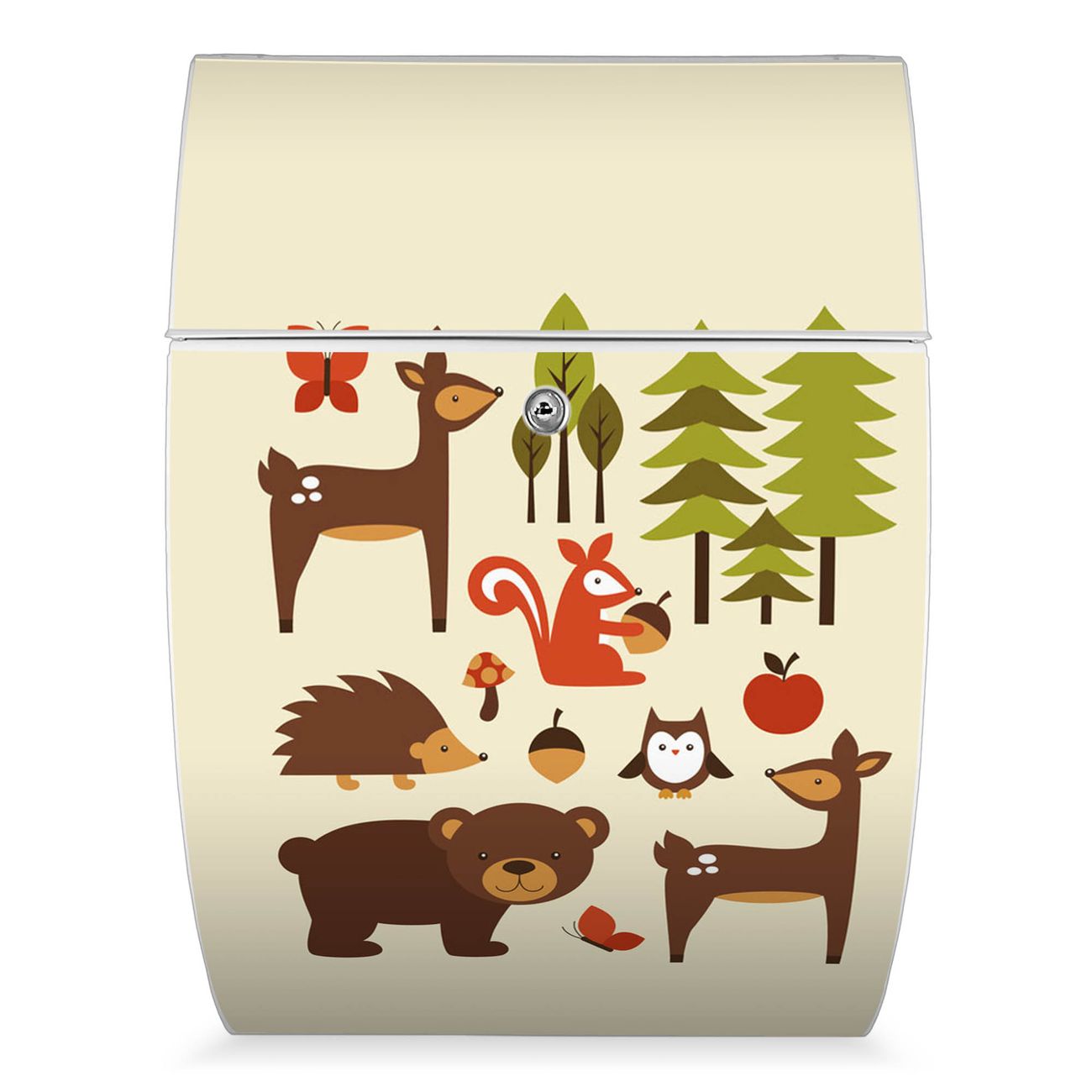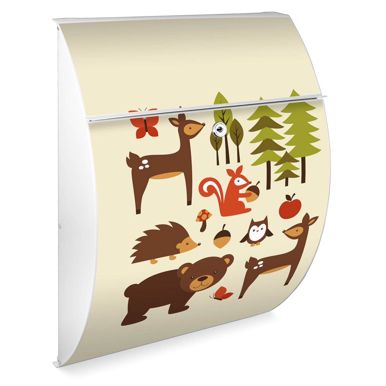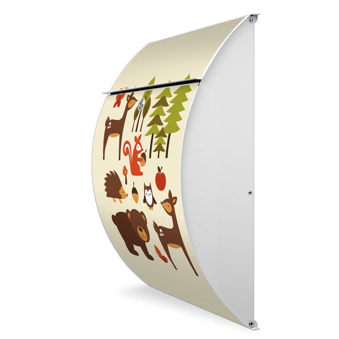 Der weiße Burg Wächter Design Briefkasten mit Motiv Waldfreunde bietet Ihnen mit seinem Fassungsvermögen genügend Platz auch für große A4 Sendungen. Auf Wunsch können Sie bei uns auch den passenden Ständer kaufen und so aus dem Wandbriefkasten einen Standbriefkasten machen.