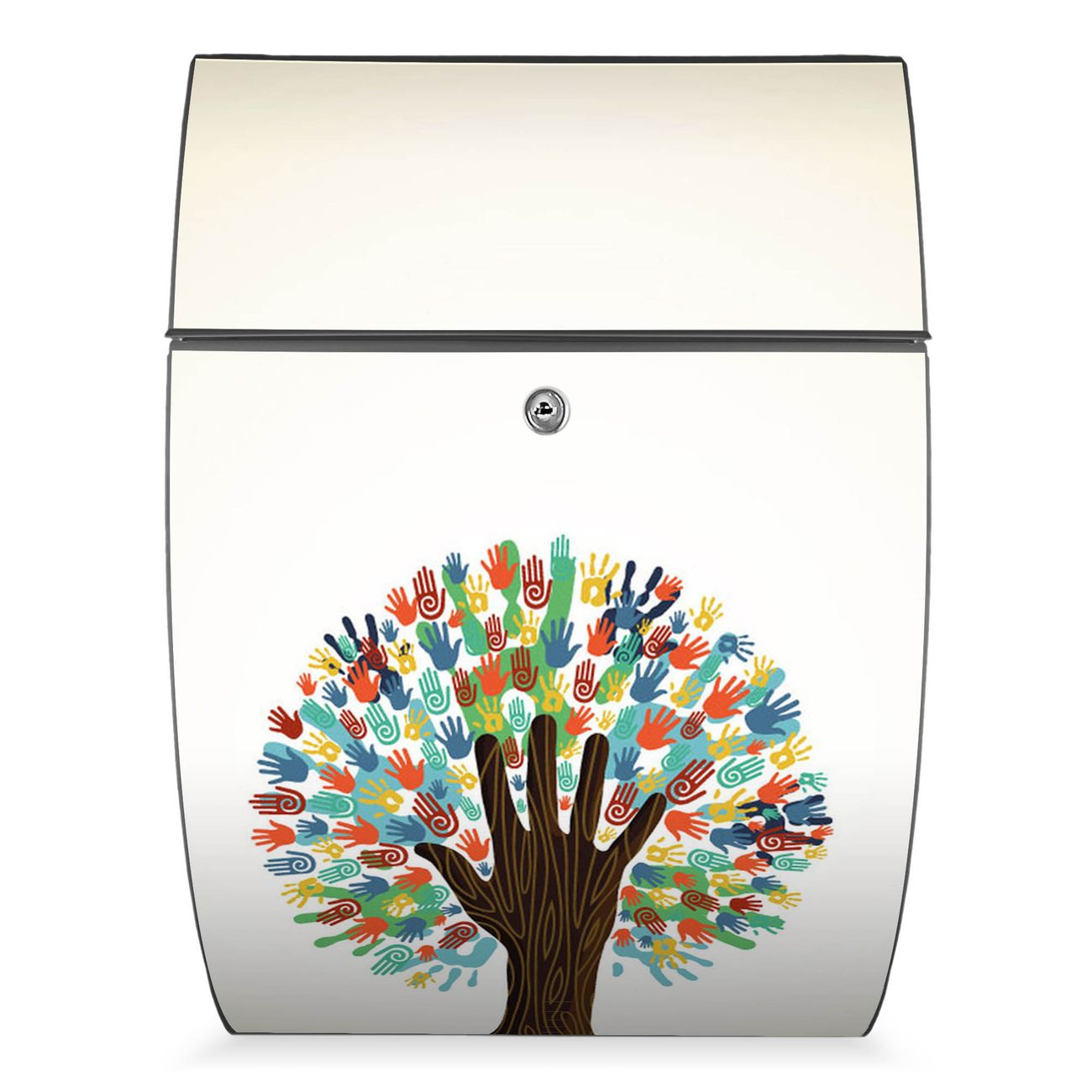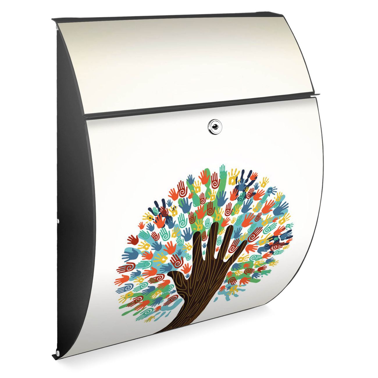 Der Burg Wächter Design Briefkasten mit Motiv We are the World bietet Ihnen mit seinem Fassungsvermögen genügend Platz auch für große A4 Sendungen. Auf Wunsch können Sie bei uns den passenden Ständer kaufen und so aus dem Wandbriefkasten einen Standbriefkasten machen.