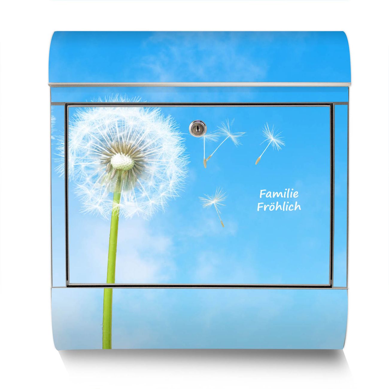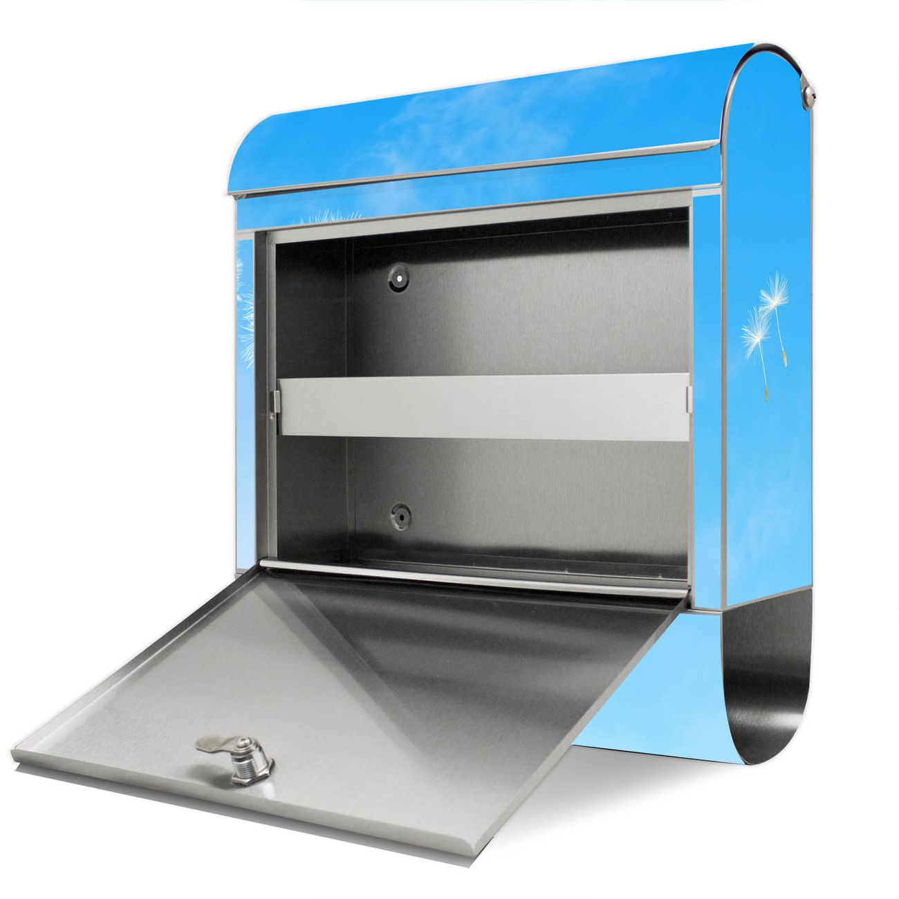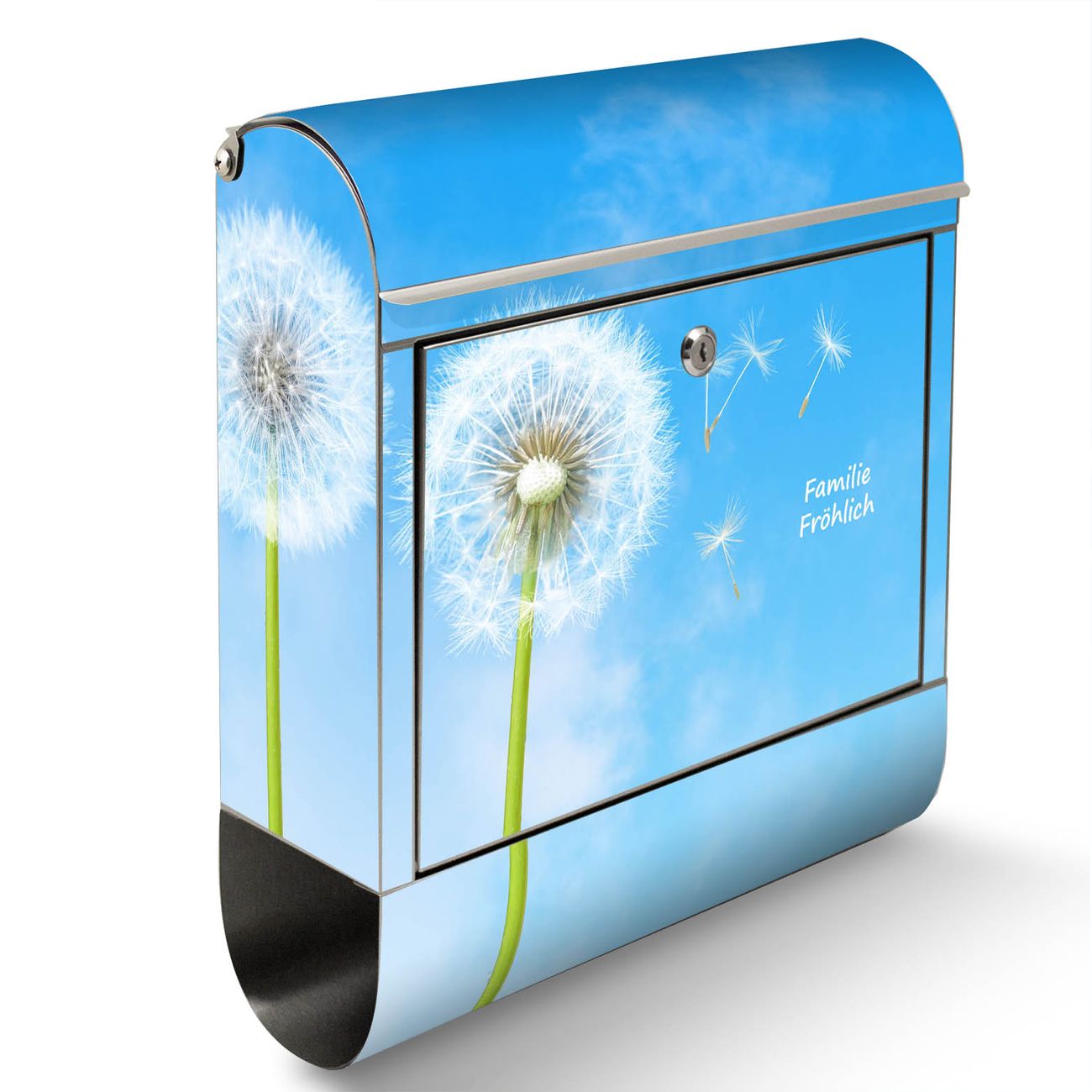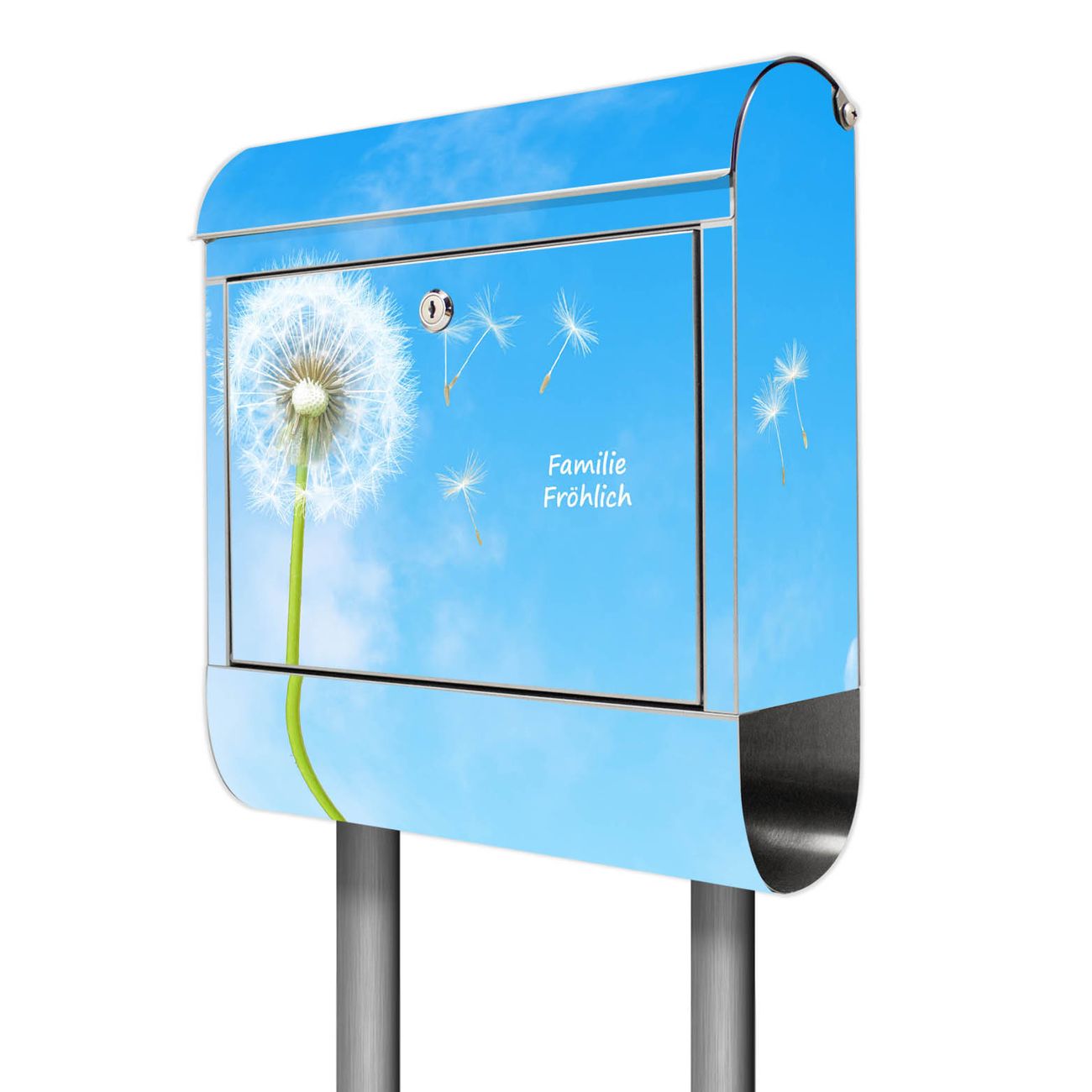 Der banjado Edelstahl Standbriefkasten mit Motiv Dandelion und eigenem Wunschtext bietet Ihnen mit seinem Fassungsvermögen genügend Platz auch für große A4 Sendungen. Das integrierte Zeitungsfach eignet sich hervorragend, um unkompliziert die Tageszeitung zu fassen.