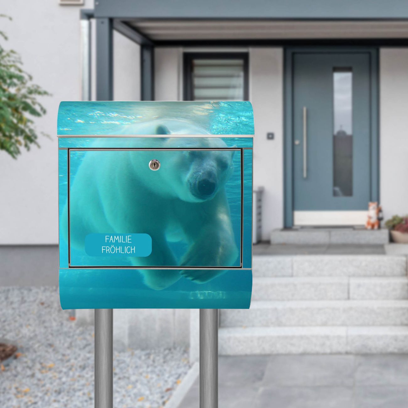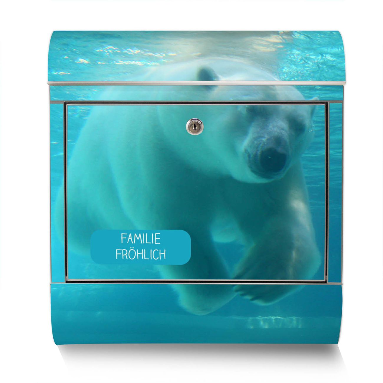 Der Motivstandbriefkasten hat ein sehr ansprechendes und ausgefallenes Design, damit entlocken Sie Ihren Nachbarn und dem Postboten ein Lächeln. Heben Sie Sich ab von der tristen grauen Masse, ohne auf Funktionalität zu verzichten. Der Briefkasten besteht aus hochwertigem 18/0 Edelstahl und die Wetter- und UV-resistenten Folie mit Eisbär unter Wasser Motiv ist zusätzlich mit einem Schutzlaminat überzogen. Der Standbriefkasten wird mit Montagematerial und zwei Schlüsseln geliefert.
