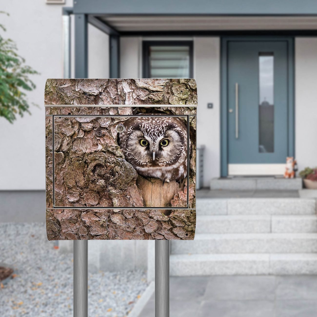 Der Motivstandbriefkasten hat ein sehr ansprechendes und ausgefallenes Design, damit entlocken Sie Ihren Nachbarn und dem Postboten ein Lächeln. Heben Sie Sich ab von der tristen grauen Masse, ohne auf Funktionalität zu verzichten. Der Briefkasten besteht aus hochwertigem 18/0 Edelstahl und die Wetter- und UV-resistenten Folie mit Eule Motiv ist zusätzlich mit einem Schutzlaminat überzogen. Der Standbriefkasten wird mit Montagematerial und zwei Schlüsseln geliefert.