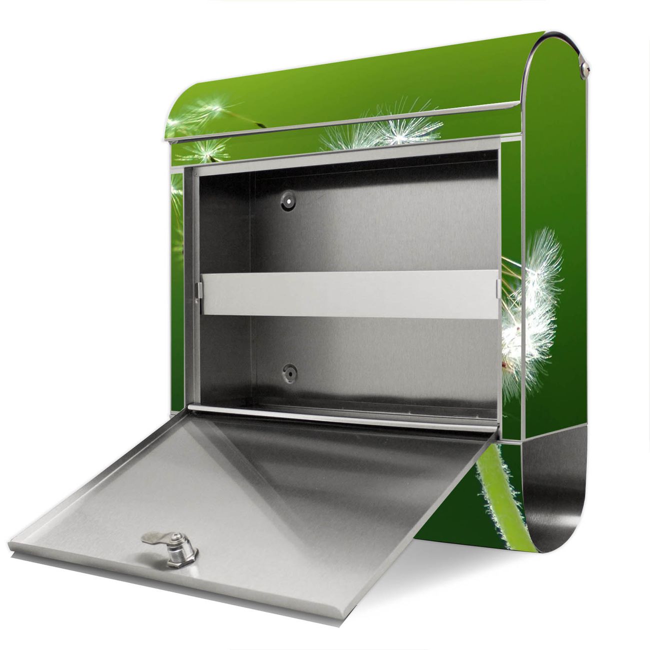 Der Motivstandbriefkasten hat ein sehr ansprechendes und ausgefallenes Design, damit entlocken Sie Ihren Nachbarn und dem Postboten ein Lächeln. Heben Sie Sich ab von der tristen grauen Masse, ohne auf Funktionalität zu verzichten. Der Briefkasten besteht aus hochwertigem 18/0 Edelstahl und die Wetter- und UV-resistenten Folie mit Pusteblume Motiv ist zusätzlich mit einem Schutzlaminat überzogen. Der Standbriefkasten wird mit Montagematerial und zwei Schlüsseln geliefert.