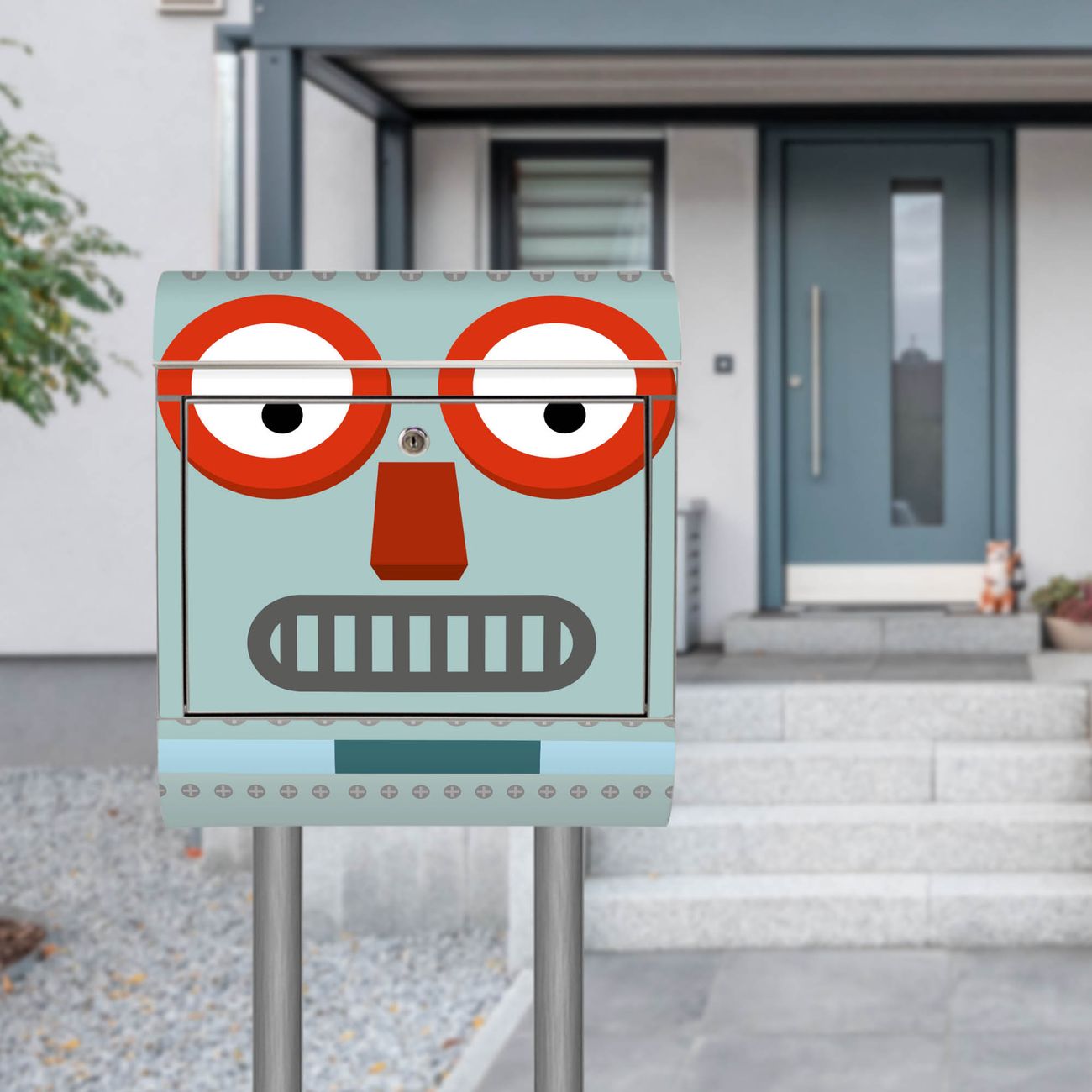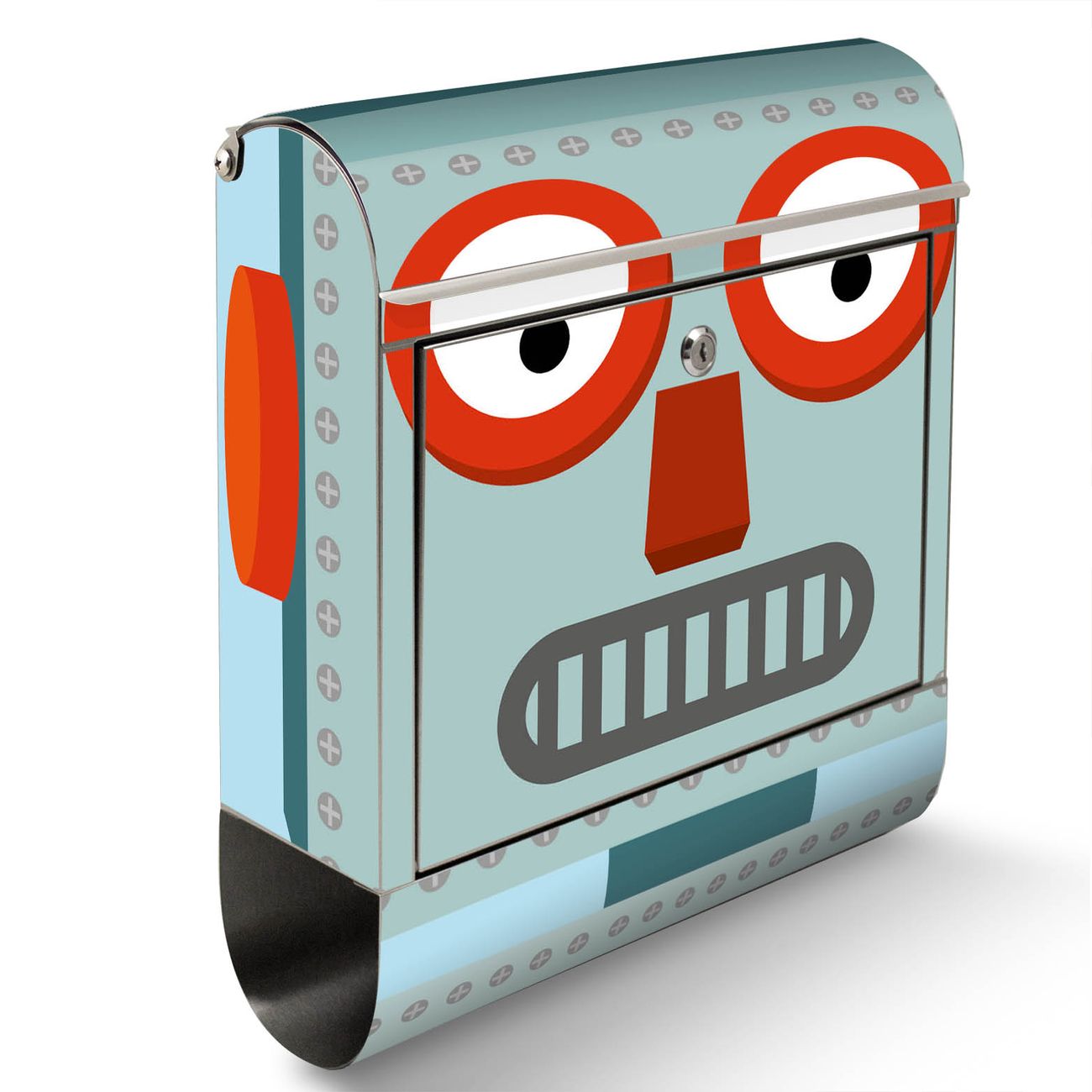 Der Motivstandbriefkasten hat ein sehr ansprechendes und ausgefallenes Design, damit entlocken Sie Ihren Nachbarn und dem Postboten ein Lächeln. Heben Sie Sich ab von der tristen grauen Masse, ohne auf Funktionalität zu verzichten. Der Briefkasten besteht aus hochwertigem 18/0 Edelstahl und die Wetter- und UV-resistenten Folie mit Shocked Robot Motiv ist zusätzlich mit einem Schutzlaminat überzogen. Der Standbriefkasten wird mit Montagematerial und zwei Schlüsseln geliefert.
