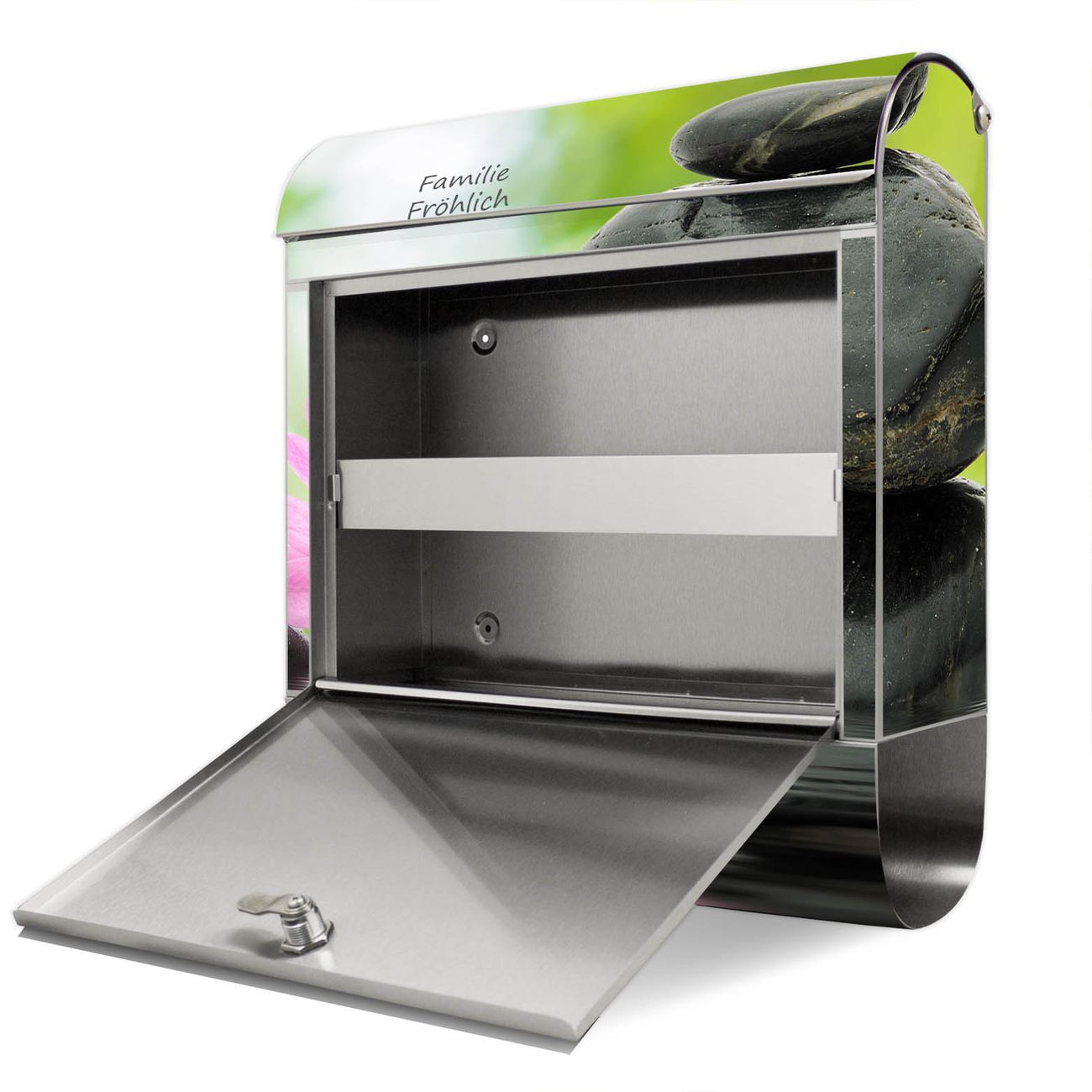 Der banjado Edelstahl Standbriefkasten mit Motiv Steine & Relax 2 und eigenem Wunschtext bietet Ihnen mit seinem Fassungsvermögen genügend Platz auch für große A4 Sendungen. Das integrierte Zeitungsfach eignet sich hervorragend, um unkompliziert die Tageszeitung zu fassen.