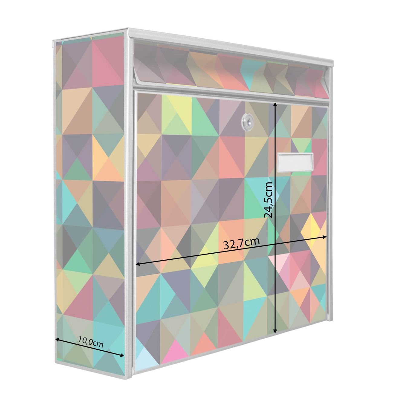 Die Größe des Briefkastens ist 36 x 32 x 10cm (BxHxT) groß. Das Motiv besteht aus einer wetter- und UV-festen Folie, die mit einem Schutzlaminat überzogen ist und Ihren Briefkasten zusätzlich vor Kratzern schützt. Sie erhalten 2 Schlüssel sowie das Montagematerial.
