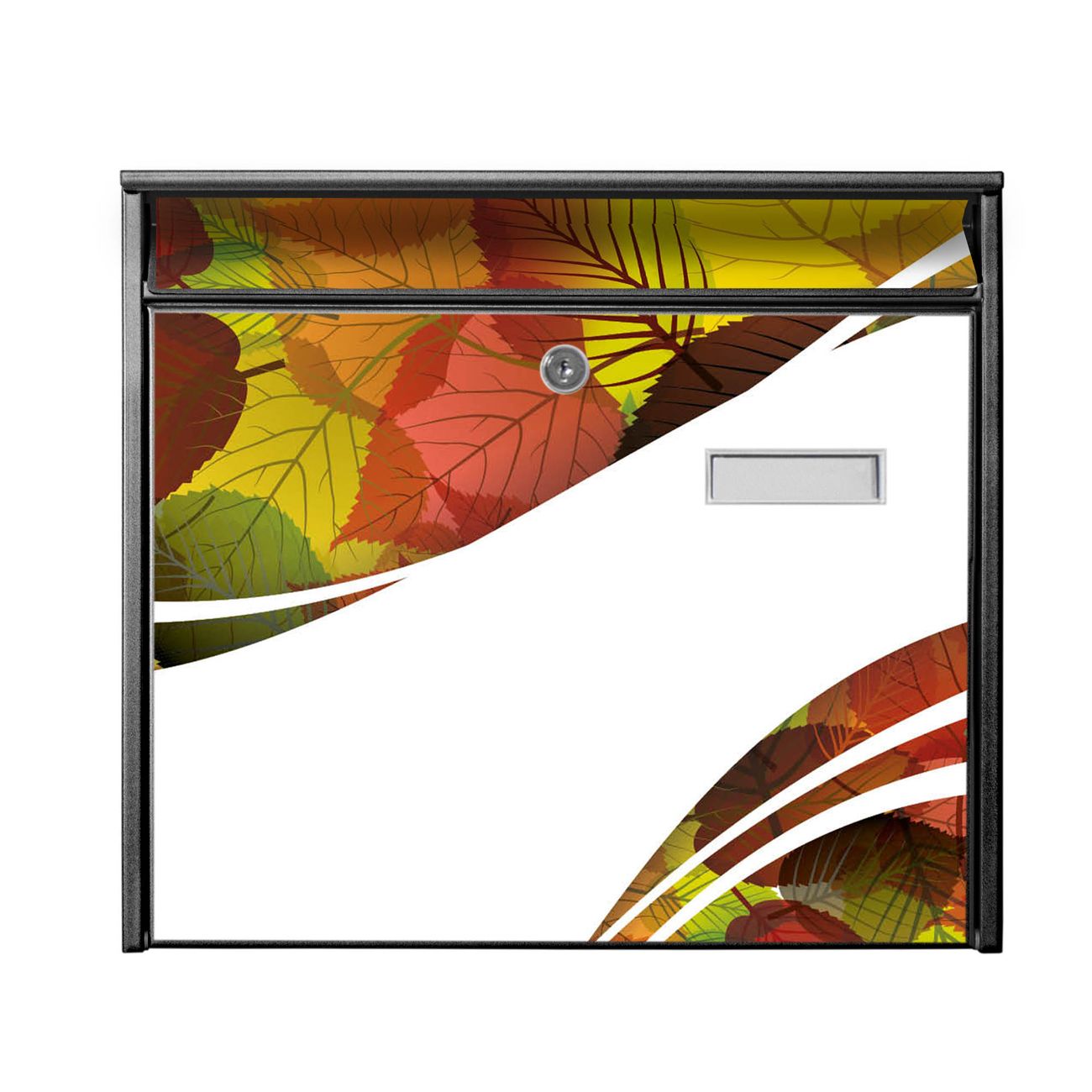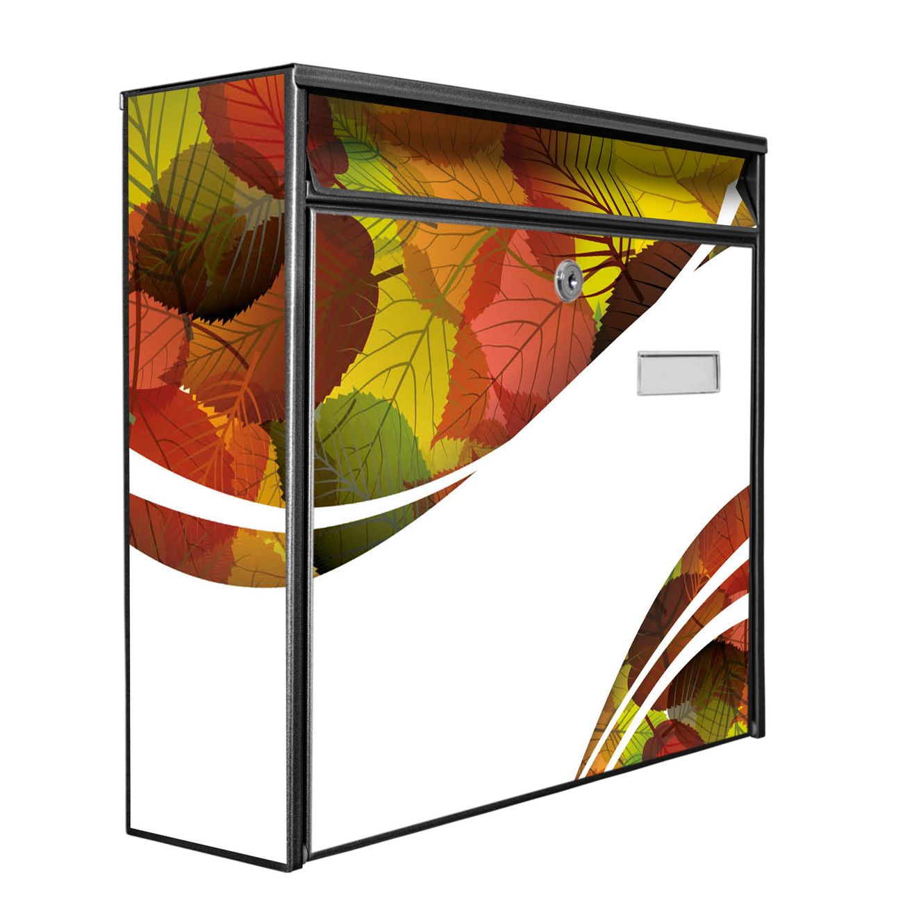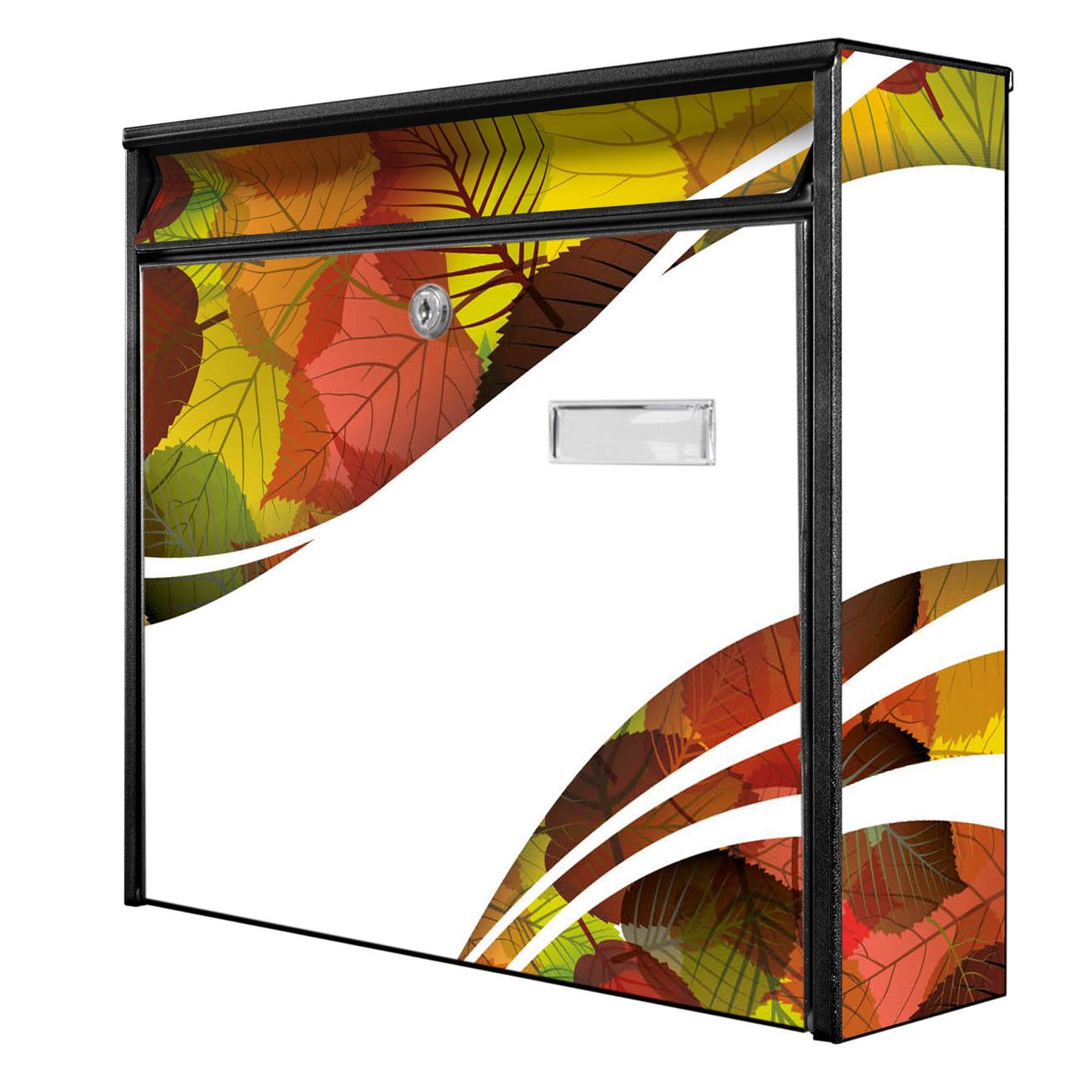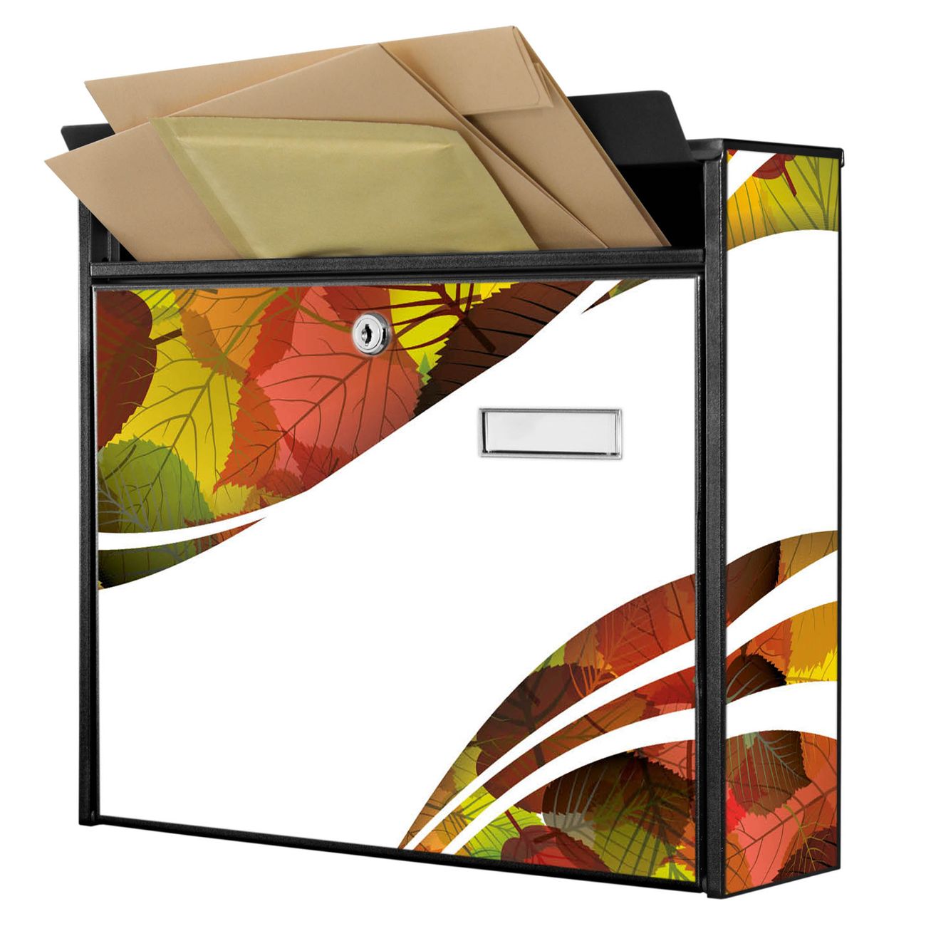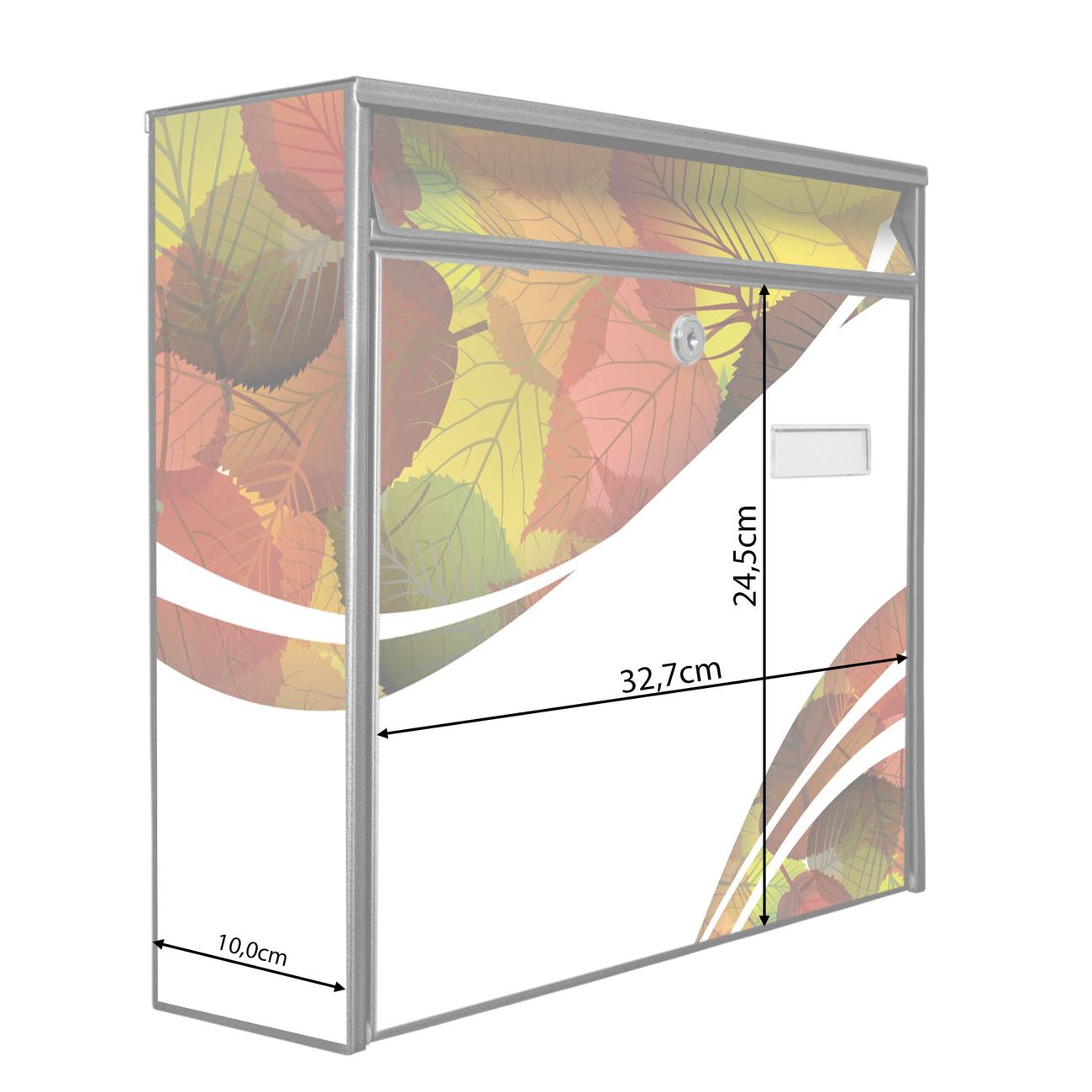 Der Burg Wächter Mail Briefkasten mit Motiv Herbstlaub bietet Ihnen mit seinem Fassungsvermögen genügend Platz auch für große A4 Sendungen. Auf Wunsch können Sie bei uns den passenden Standfuß kaufen und so aus dem Wandbriefkasten einen Standbriefkasten machen. Wir bieten Ihnen ebenfalls Namensschilder, bereits beschriftet oder frei zu beschriften, und verschiedene selbst gestaltete Bitte-Keine-Werbung-Aufkleber.