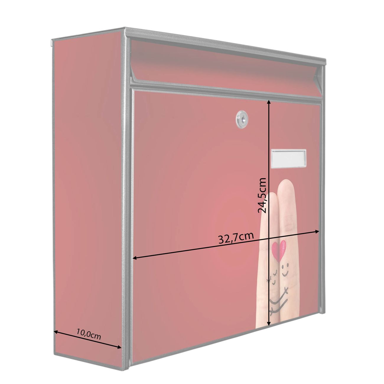 Die Größe des Briefkastens ist 36 x 32 x 10cm (BxHxT) groß. Das Motiv besteht aus einer wetter- und UV-festen Folie, die mit einem Schutzlaminat überzogen ist und Ihren Briefkasten zusätzlich vor Kratzern schützt. Sie erhalten 2 Schlüssel sowie das Montagematerial.