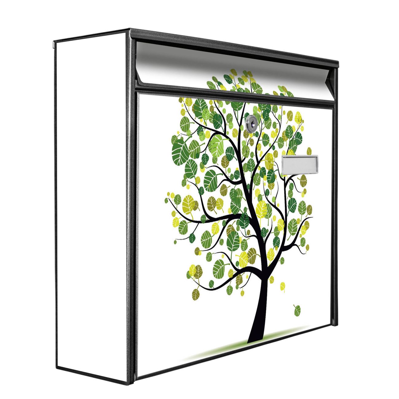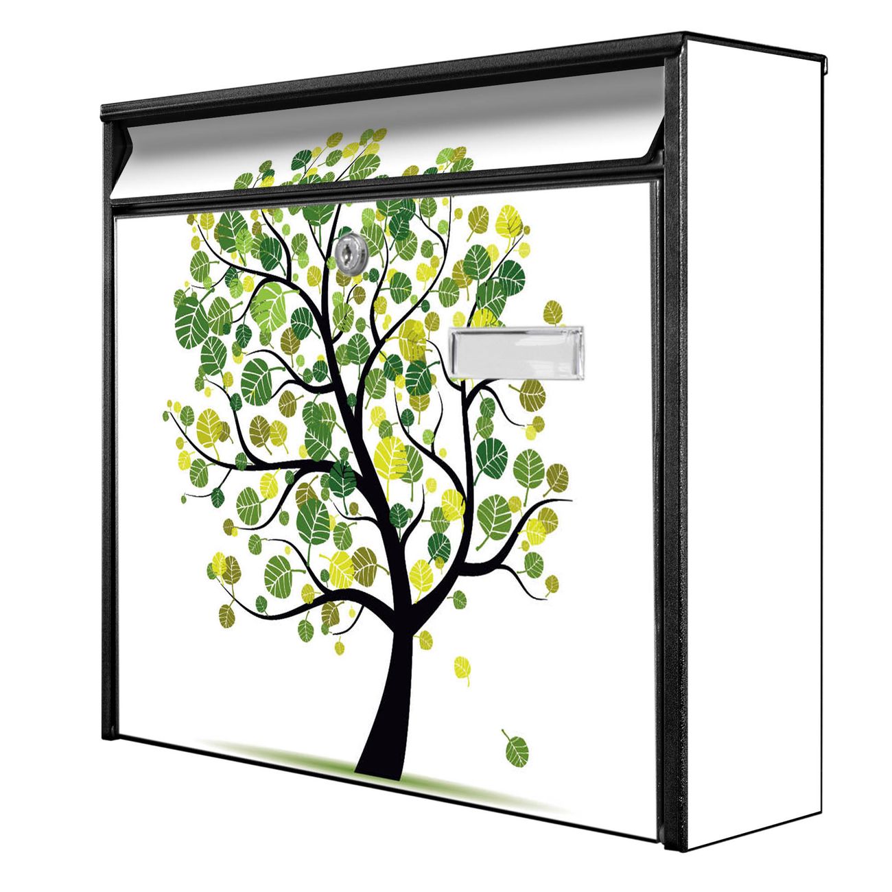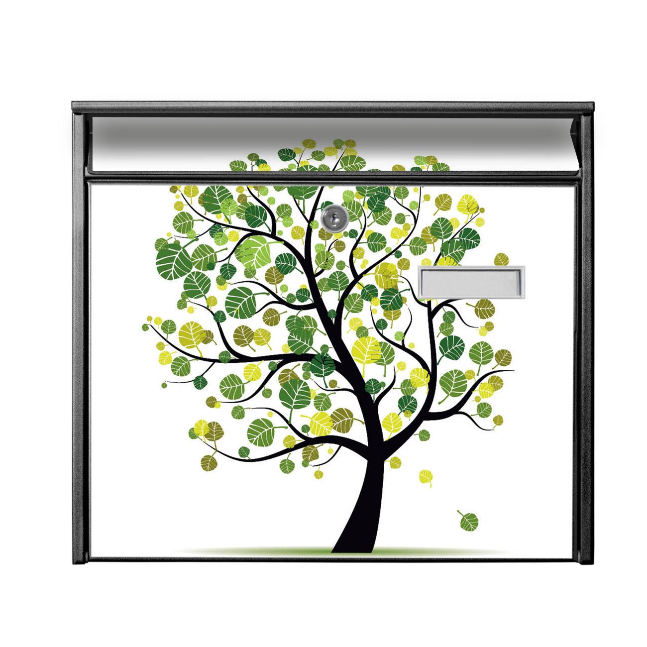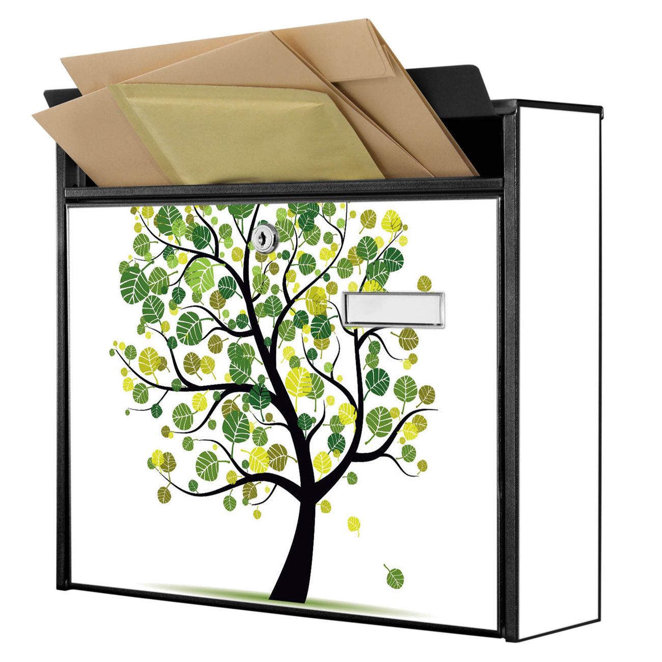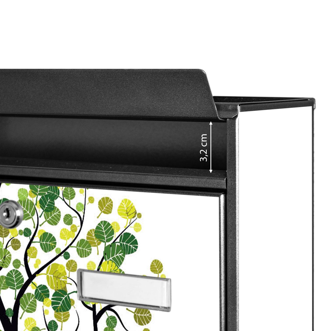 Der Burg Wächter Mail Briefkasten mit Motiv Laubzauberbaum bietet Ihnen mit seinem Fassungsvermögen genügend Platz auch für große A4 Sendungen. Auf Wunsch können Sie bei uns den passenden Standfuß kaufen und so aus dem Wandbriefkasten einen Standbriefkasten machen. Wir bieten Ihnen ebenfalls Namensschilder, bereits beschriftet oder frei zu beschriften, und verschiedene selbst gestaltete Bitte-Keine-Werbung-Aufkleber.