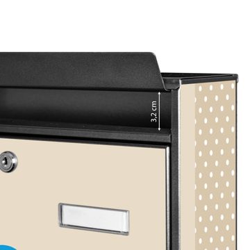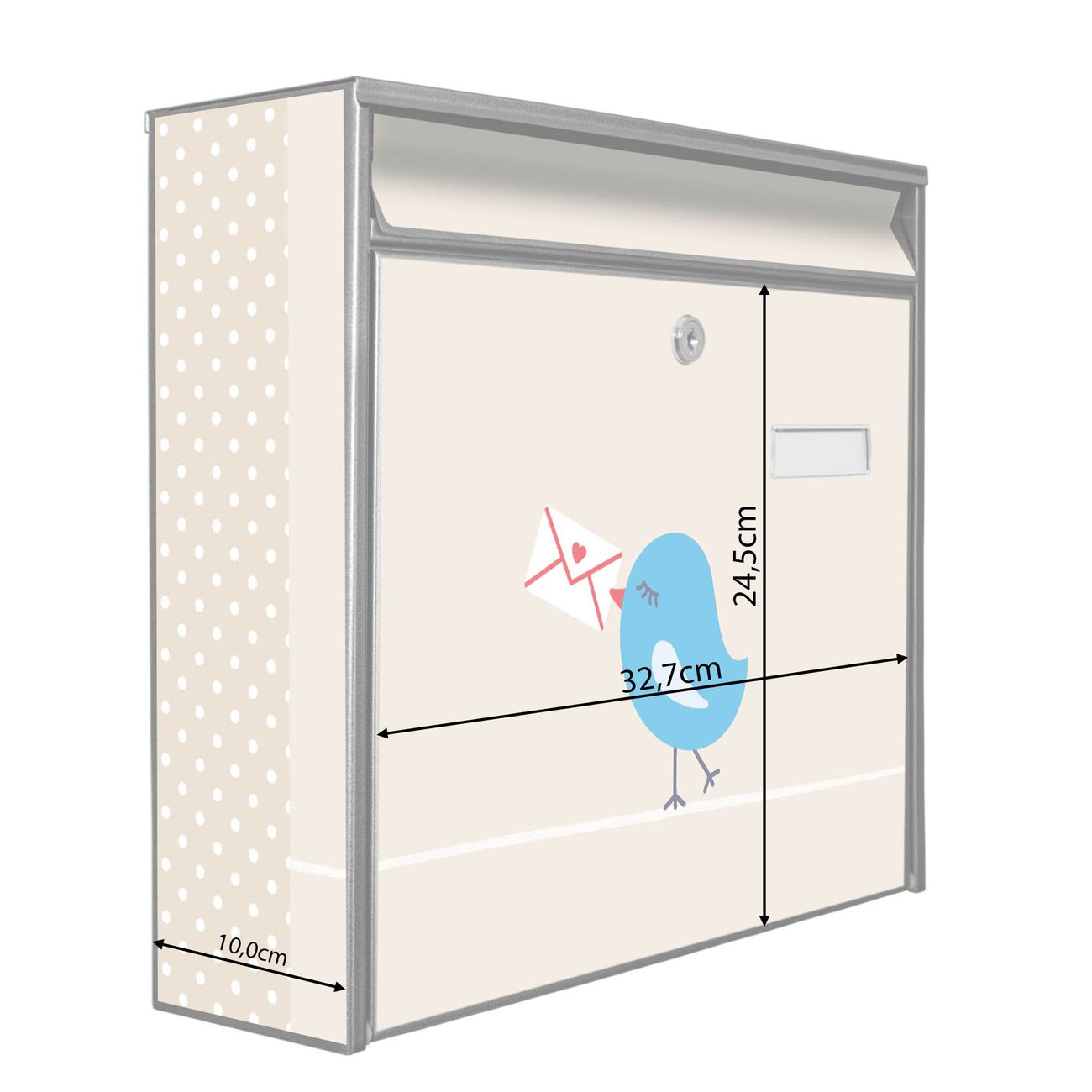 Die Größe des Briefkastens ist 36 x 32 x 10cm (BxHxT) groß. Das Motiv besteht aus einer wetter- und UV-festen Folie, die mit einem Schutzlaminat überzogen ist und Ihren Briefkasten zusätzlich vor Kratzern schützt. Sie erhalten 2 Schlüssel sowie das Montagematerial.