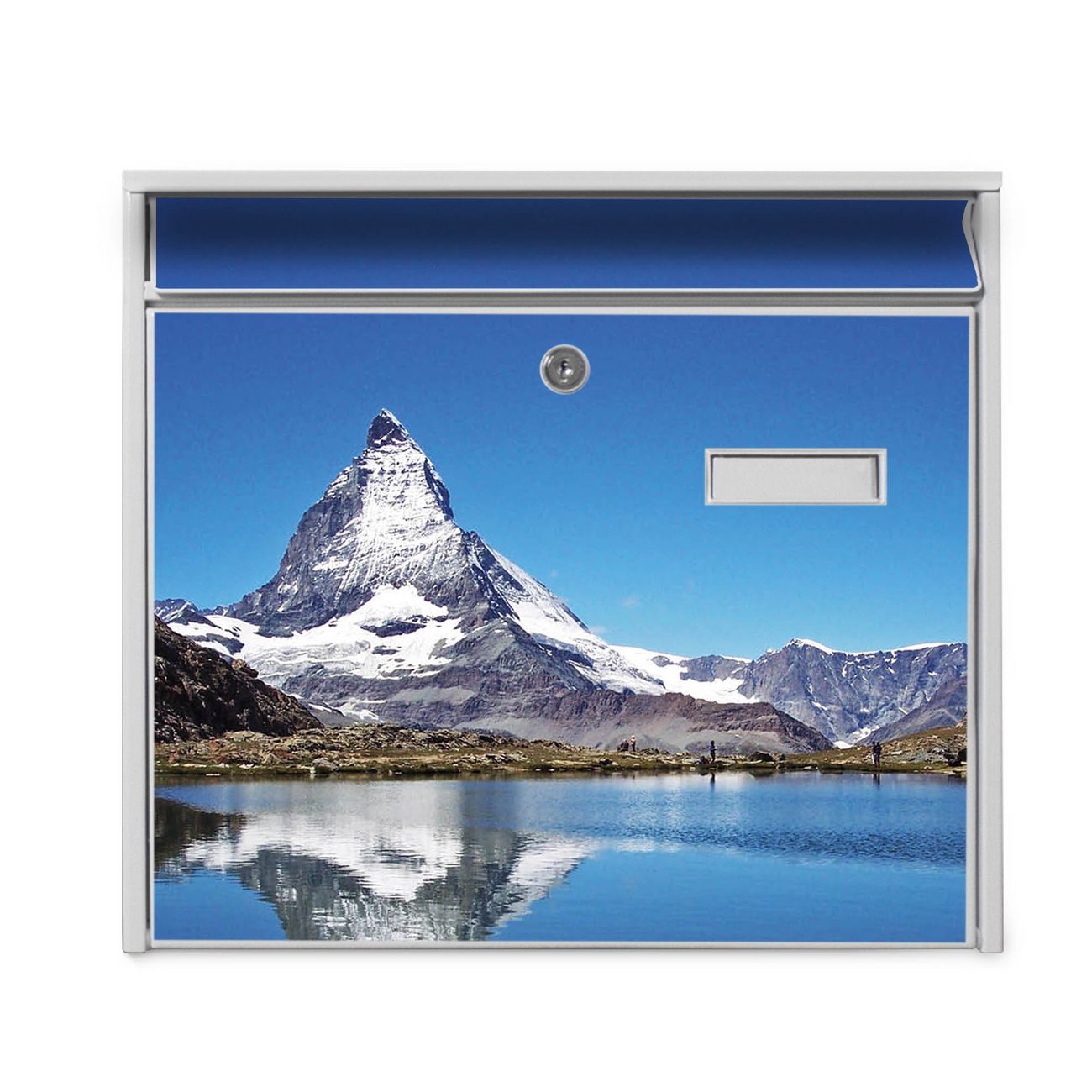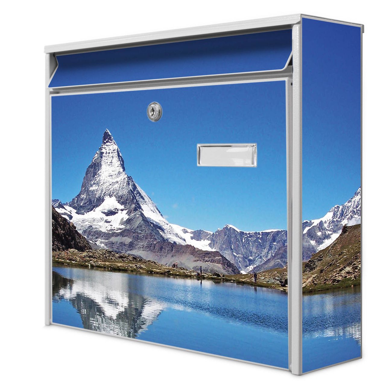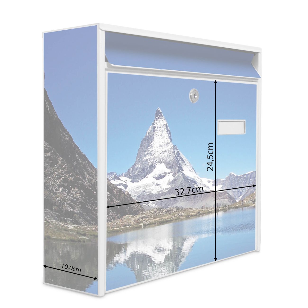 Der Postkasten mit Motiv Matterhorn hat ein sehr ansprechendes und zeitloses Design. Heben Sie Sich von der tristen grauen Masse ab, ohne auf Funktionalität zu verzichten. Die weite Öffnung ohne scharfe Kanten ermöglicht eine einfache Handhabung beim Entnehmen der Post. Die Größe bietet genügend Platz für Sendungen aller Art, der Einwurf fasst auch größere A4 Sendungen. Ihr Burg-Wächter Motivbriefkasten wird in Sachsen in einer kleinen Manufaktur von Hand veredelt. Die Motivfolie ist lösungsmittelfrei und schutzlaminiert, dies sorgt für einen langen Halt. Wir legen großen Wert auf die Verbindung von Funktionalität und Design.