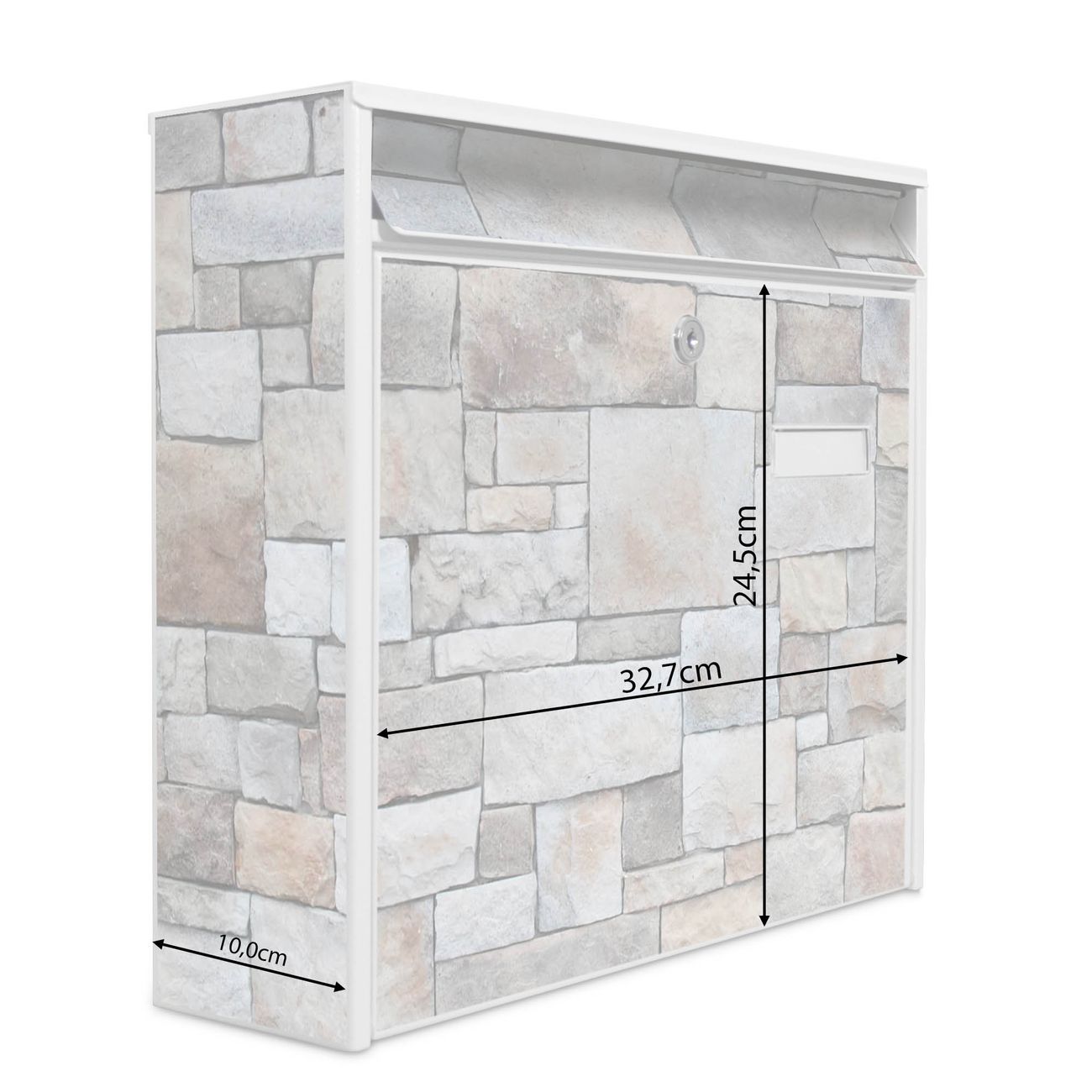 Der Burg Wächter Mail Briefkasten mit Motiv Natursteinmauer bietet Ihnen mit seinem Fassungsvermögen genügend Platz auch für große A4 Sendungen. Auf Wunsch können Sie bei uns den passenden Standfuß kaufen und so aus dem Wandbriefkasten einen Standbriefkasten machen. Wir bieten Ihnen ebenfalls Namensschilder, bereits beschriftet oder frei zu beschriften, und verschiedene selbst gestaltete Bitte-Keine-Werbung-Aufkleber.