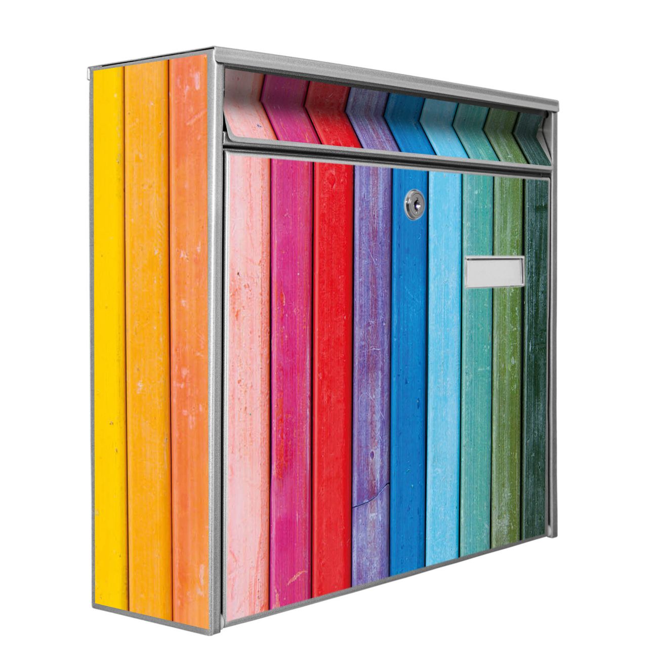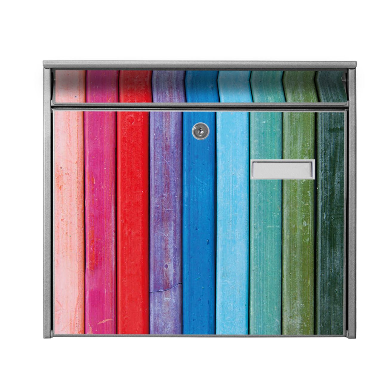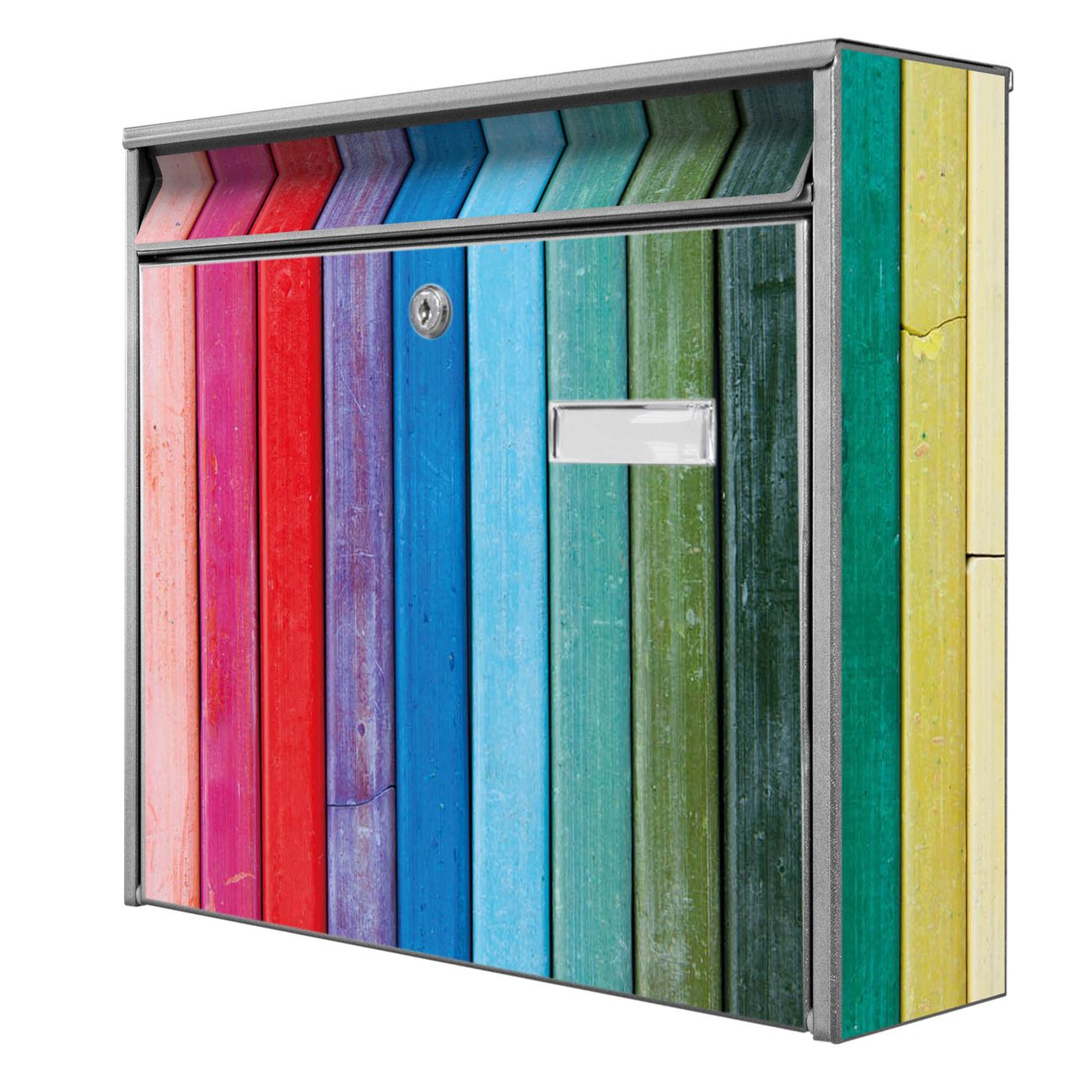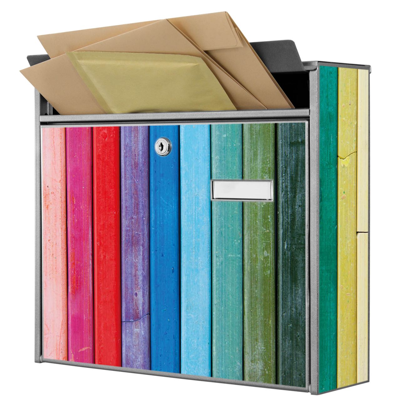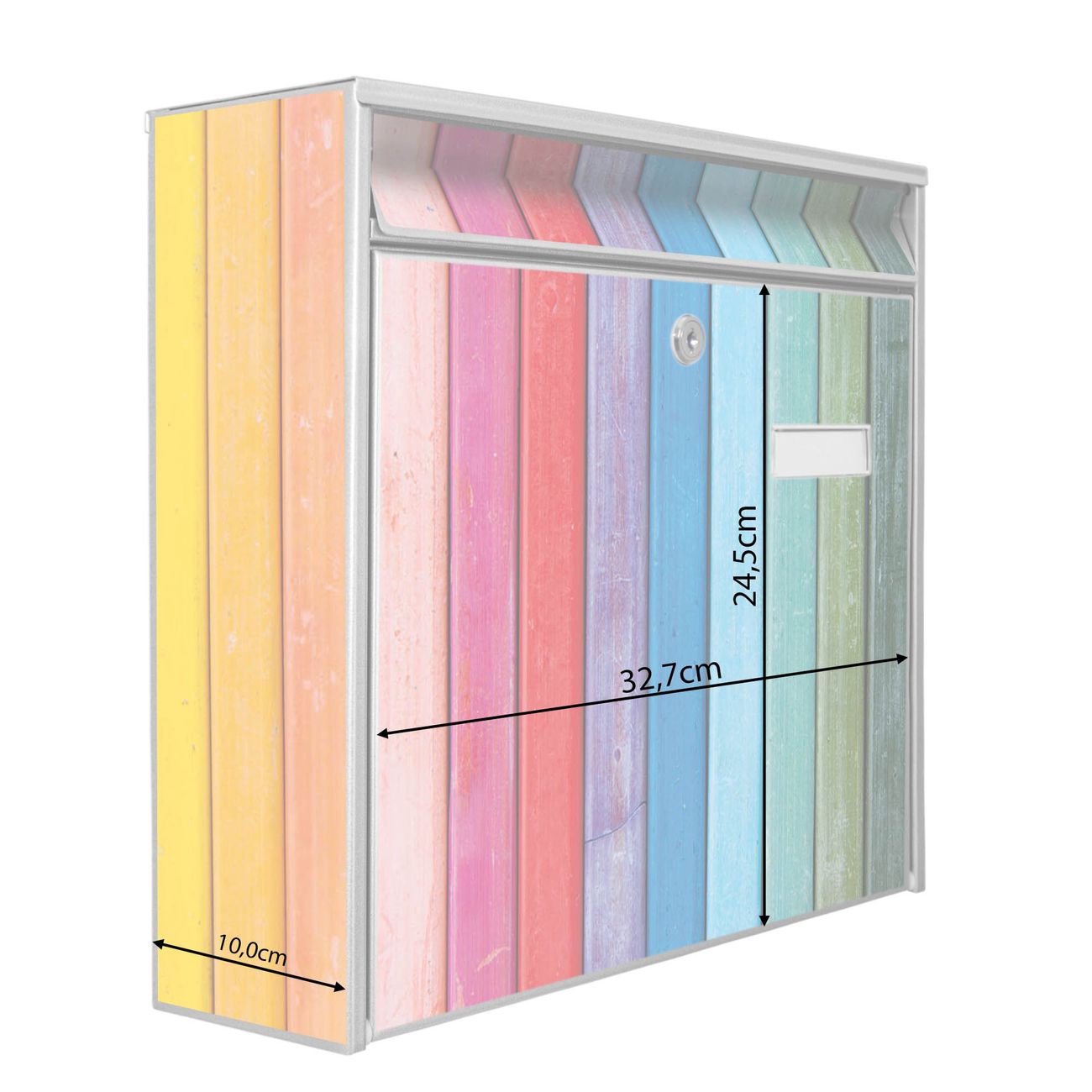 Der Burg Wächter Mail Briefkasten mit Motiv Regenbogenfarben bietet Ihnen mit seinem Fassungsvermögen genügend Platz auch für große A4 Sendungen. Auf Wunsch können Sie bei uns den passenden Standfuß kaufen und so aus dem Wandbriefkasten einen Standbriefkasten machen. Wir bieten Ihnen ebenfalls Namensschilder, bereits beschriftet oder frei zu beschriften, und verschiedene selbst gestaltete Bitte-Keine-Werbung-Aufkleber.