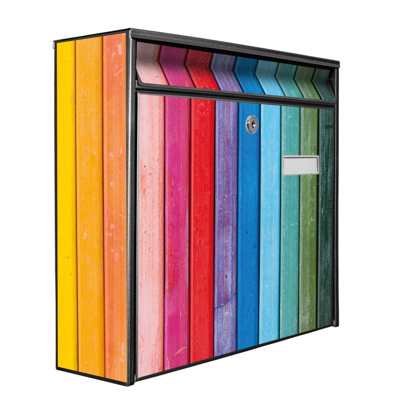 Der Burg Wächter Mail Briefkasten mit Motiv Regenbogenfarben bietet Ihnen mit seinem Fassungsvermögen genügend Platz auch für große A4 Sendungen. Auf Wunsch können Sie bei uns den passenden Standfuß kaufen und so aus dem Wandbriefkasten einen Standbriefkasten machen. Wir bieten Ihnen ebenfalls Namensschilder, bereits beschriftet oder frei zu beschriften, und verschiedene selbst gestaltete Bitte-Keine-Werbung-Aufkleber.