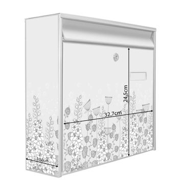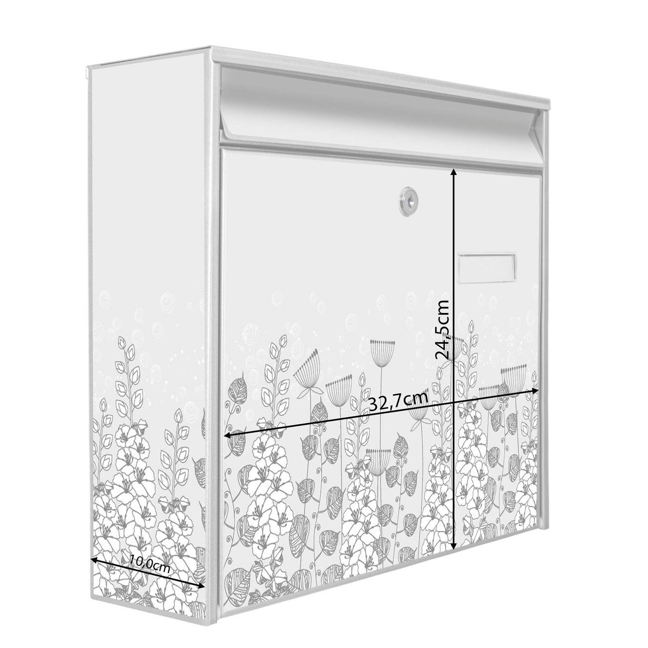 Die Größe des Briefkastens ist 36 x 32 x 10cm (BxHxT) groß. Das Motiv besteht aus einer wetter- und UV-festen Folie, die mit einem Schutzlaminat überzogen ist und Ihren Briefkasten zusätzlich vor Kratzern schützt. Sie erhalten 2 Schlüssel sowie das Montagematerial.
