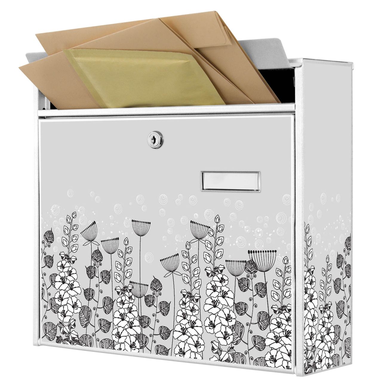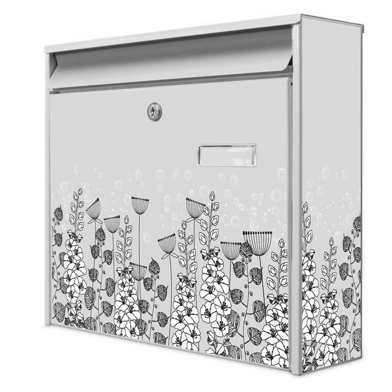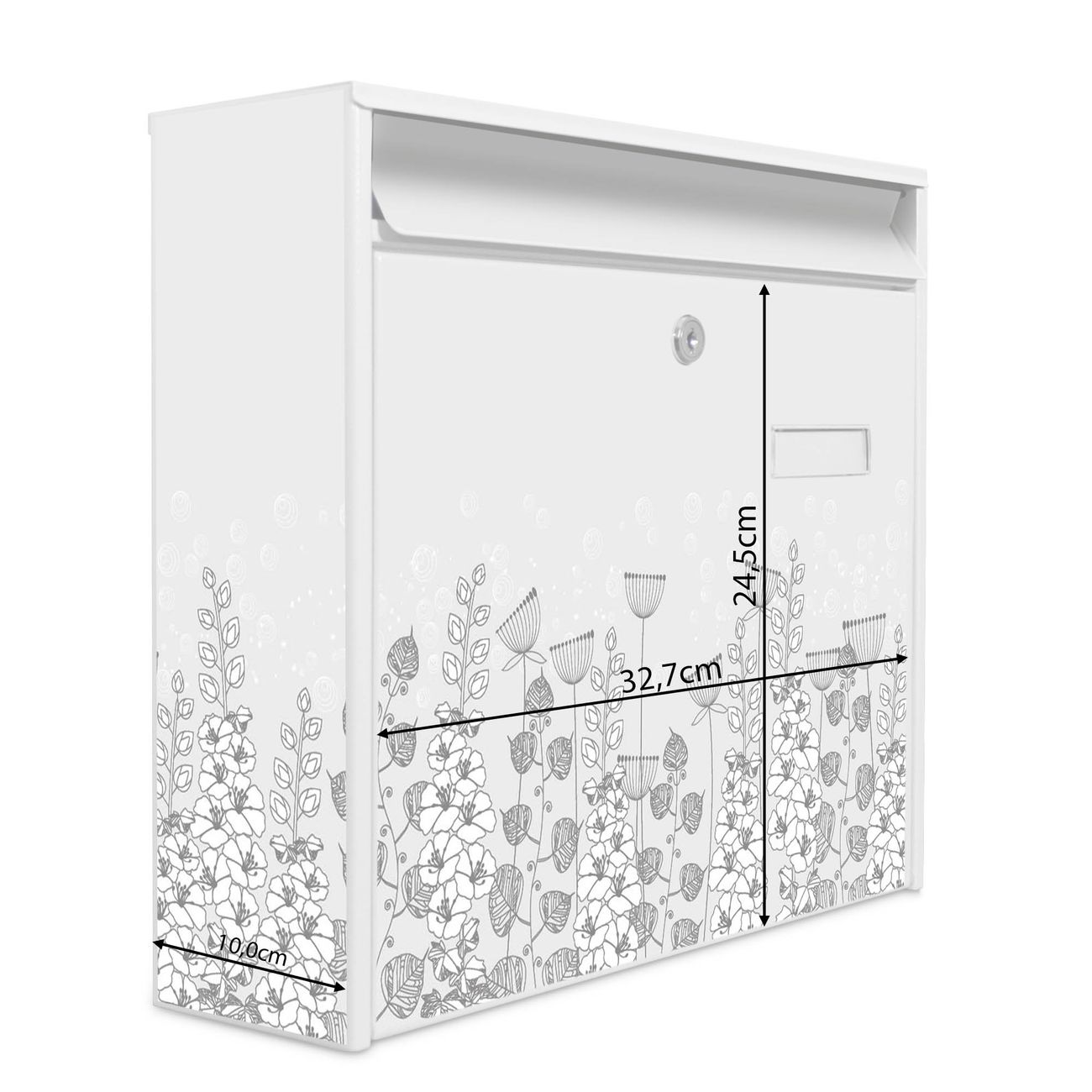 Die Größe des Briefkastens ist 36 x 32 x 10cm (BxHxT) groß. Das Motiv besteht aus einer wetter- und UV-festen Folie, die mit einem Schutzlaminat überzogen ist und Ihren Briefkasten zusätzlich vor Kratzern schützt. Sie erhalten 2 Schlüssel sowie das Montagematerial.