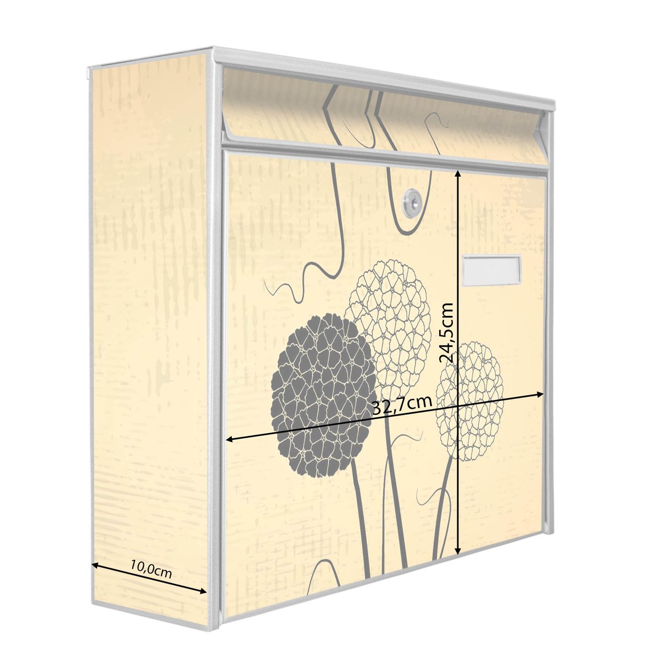 Die Größe des Briefkastens ist 36 x 32 x 10cm (BxHxT) groß. Das Motiv besteht aus einer wetter- und UV-festen Folie, die mit einem Schutzlaminat überzogen ist und Ihren Briefkasten zusätzlich vor Kratzern schützt. Sie erhalten 2 Schlüssel sowie das Montagematerial.