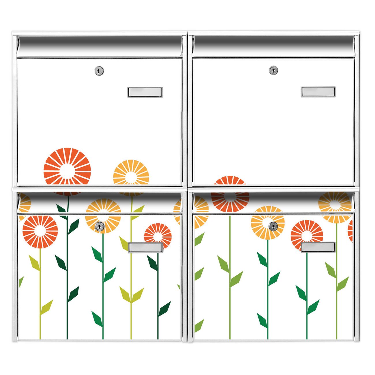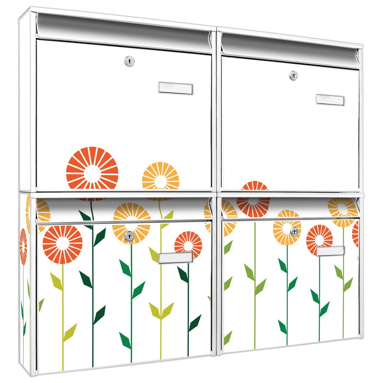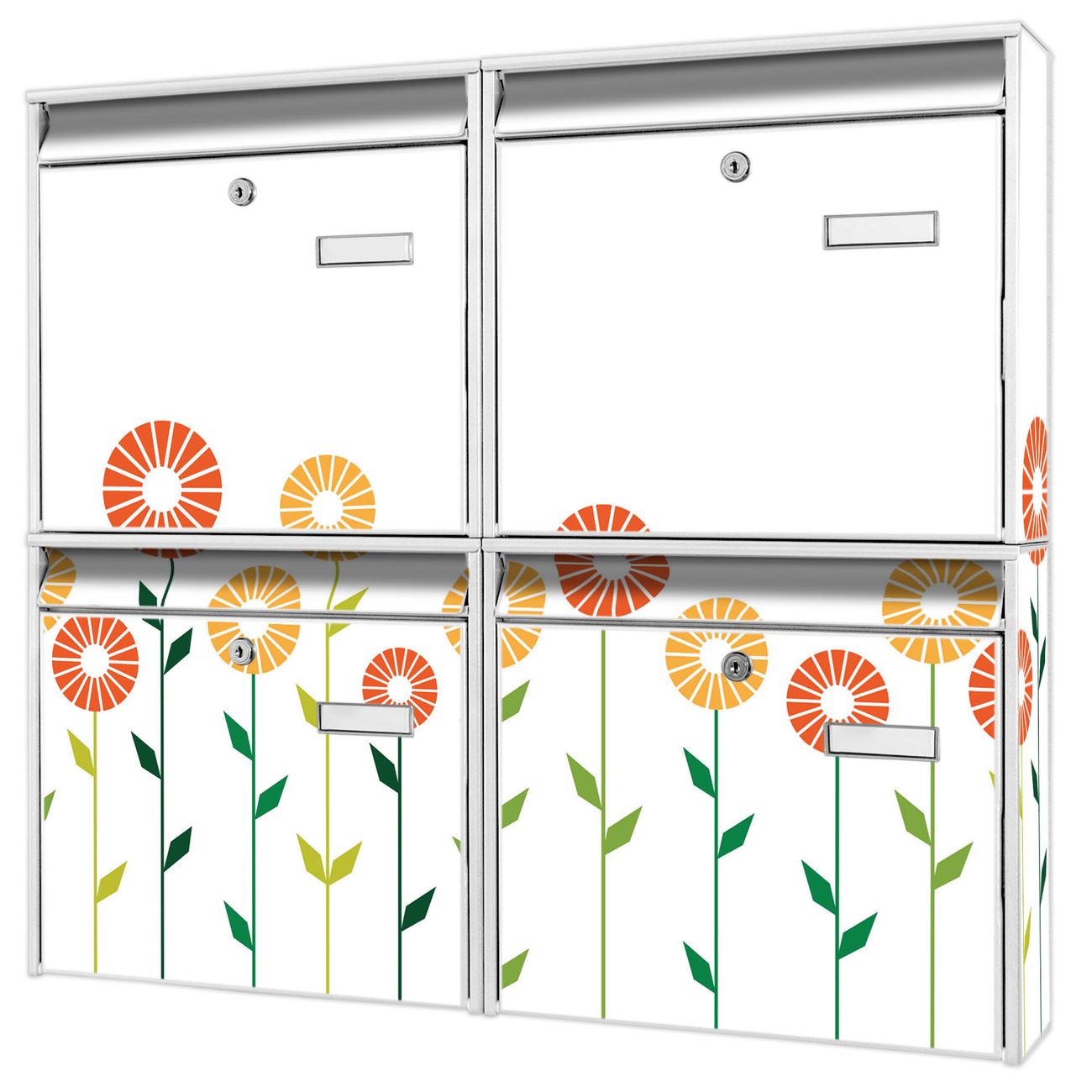 FUNKTION: Die Burg-Wächter Briefkastenanlage mit Motiv Abstrakte Margeriten bietet Ihnen ausreichend Fassungsvermögen um auch A4 und C4 Sendungen zu empfangen. Das integrierte Namensschild lässt sich individuell beschriften. Wählen Sie aus den Grundfarben weiß, silber und schwarz. DESIGN: Die 4 Briefkästen haben ein ansprechendes und zeitloses Design, ohne dabei auf Funktionalität zu verzichten. Das Material ist sehr stabil, wetterfest und rostfrei. Durch das Motiv Abstrakte Margeriten werden die Postkästen zu einem Blickfang. DETAILS: Die Postkästen bestehen aus verzinktem Stahl der zusätzlich mit Klarlack versiegelt wurde. Die Kästen sind gesamt 64,5cm hoch, 72,5cm breit und 10cm tief. Das Motiv besteht aus einer wetter- und UV-festen Folie, die Ihren Briefkasten zusätzlich vor Kratzern schützt. Die Postkästen werden mit Montagematerial, je einem Namensschild und je zwei Schlüsseln geliefert. NUTZEN: Das Briefkastenset eignet sich für die Wandmontage, die Größe bietet genügend Platz für Sendungen aller Art. Das zeitlose Design sowie die stabile Bauart bieten Ihnen einen treuen Begleiter für Ihre Post. BANJADO: