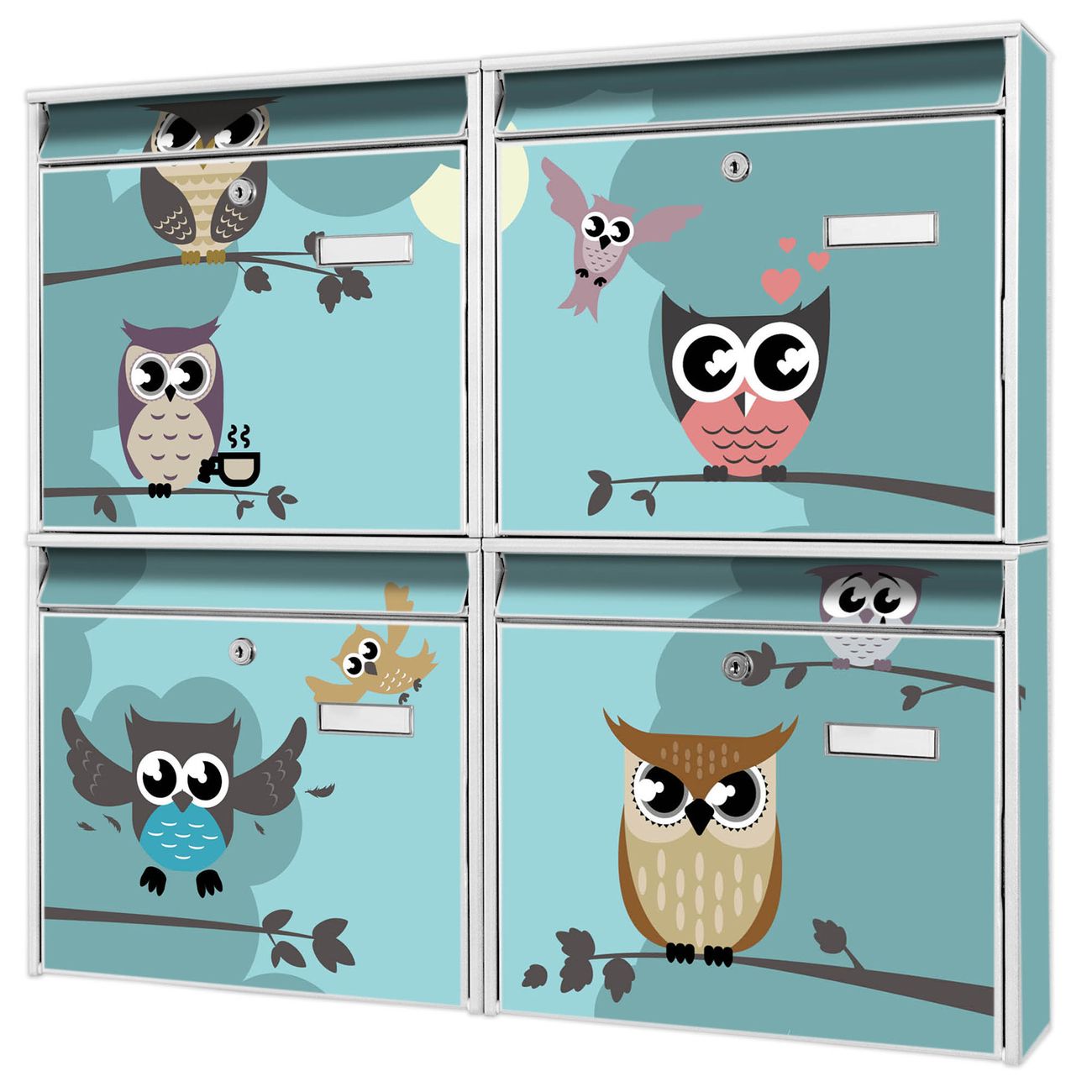 FUNKTION: Die Burg-Wächter Briefkastenanlage mit Motiv Acht Eulen bietet Ihnen ausreichend Fassungsvermögen um auch A4 und C4 Sendungen zu empfangen. Das integrierte Namensschild lässt sich individuell beschriften. Wählen Sie aus den Grundfarben weiß, silber und schwarz. DESIGN: Die 4 Briefkästen haben ein ansprechendes und zeitloses Design, ohne dabei auf Funktionalität zu verzichten. Das Material ist sehr stabil, wetterfest und rostfrei. Durch das Motiv Acht Eulen werden die Postkästen zu einem Blickfang. DETAILS: Die Postkästen bestehen aus verzinktem Stahl der zusätzlich mit Klarlack versiegelt wurde. Die Kästen sind gesamt 64,5cm hoch, 72,5cm breit und 10cm tief. Das Motiv besteht aus einer wetter- und UV-festen Folie, die Ihren Briefkasten zusätzlich vor Kratzern schützt. Die Postkästen werden mit Montagematerial, je einem Namensschild und je zwei Schlüsseln geliefert. NUTZEN: Das Briefkastenset eignet sich für die Wandmontage, die Größe bietet genügend Platz für Sendungen aller Art. Das zeitlose Design sowie die stabile Bauart bieten Ihnen einen treuen Begleiter für Ihre Post. BANJADO: