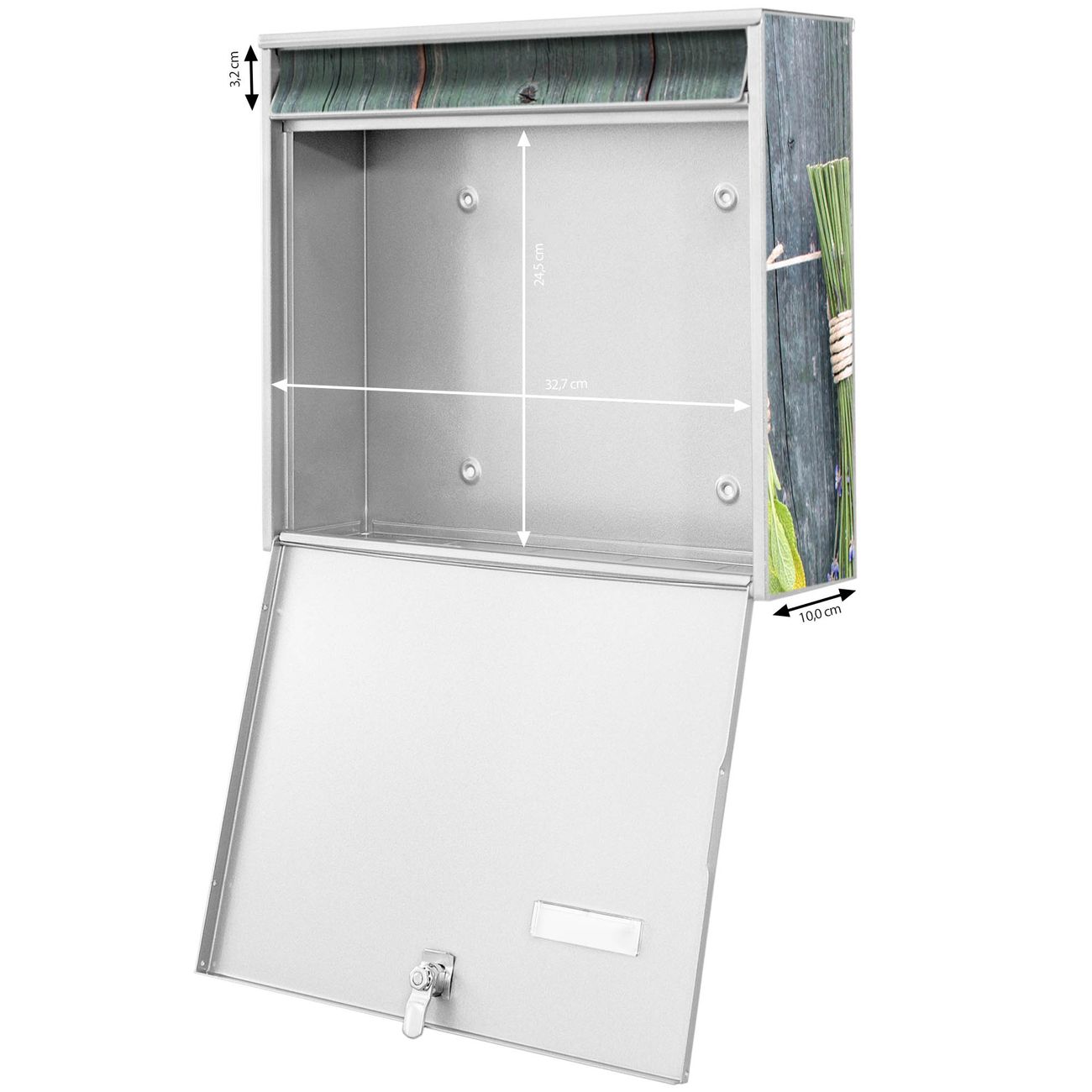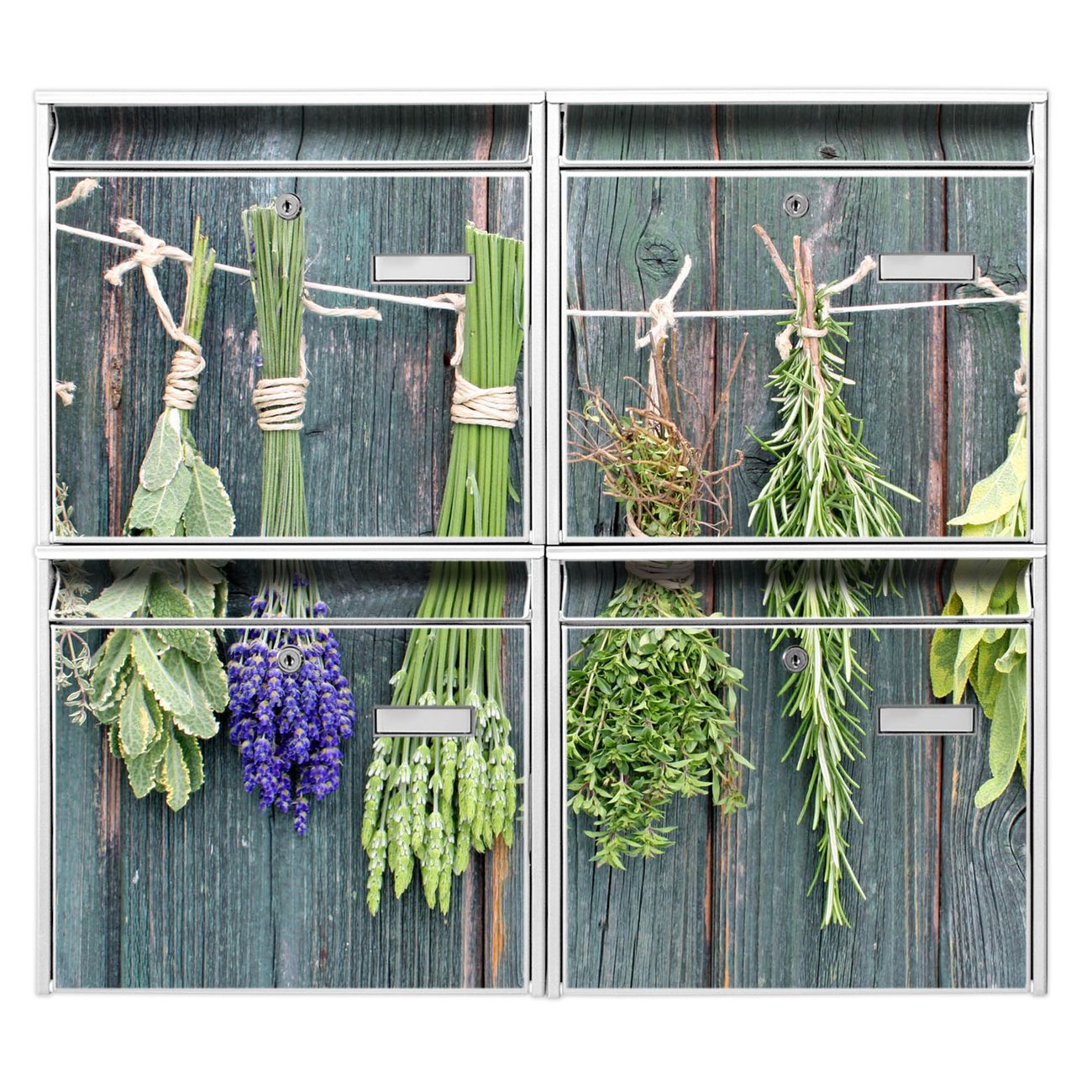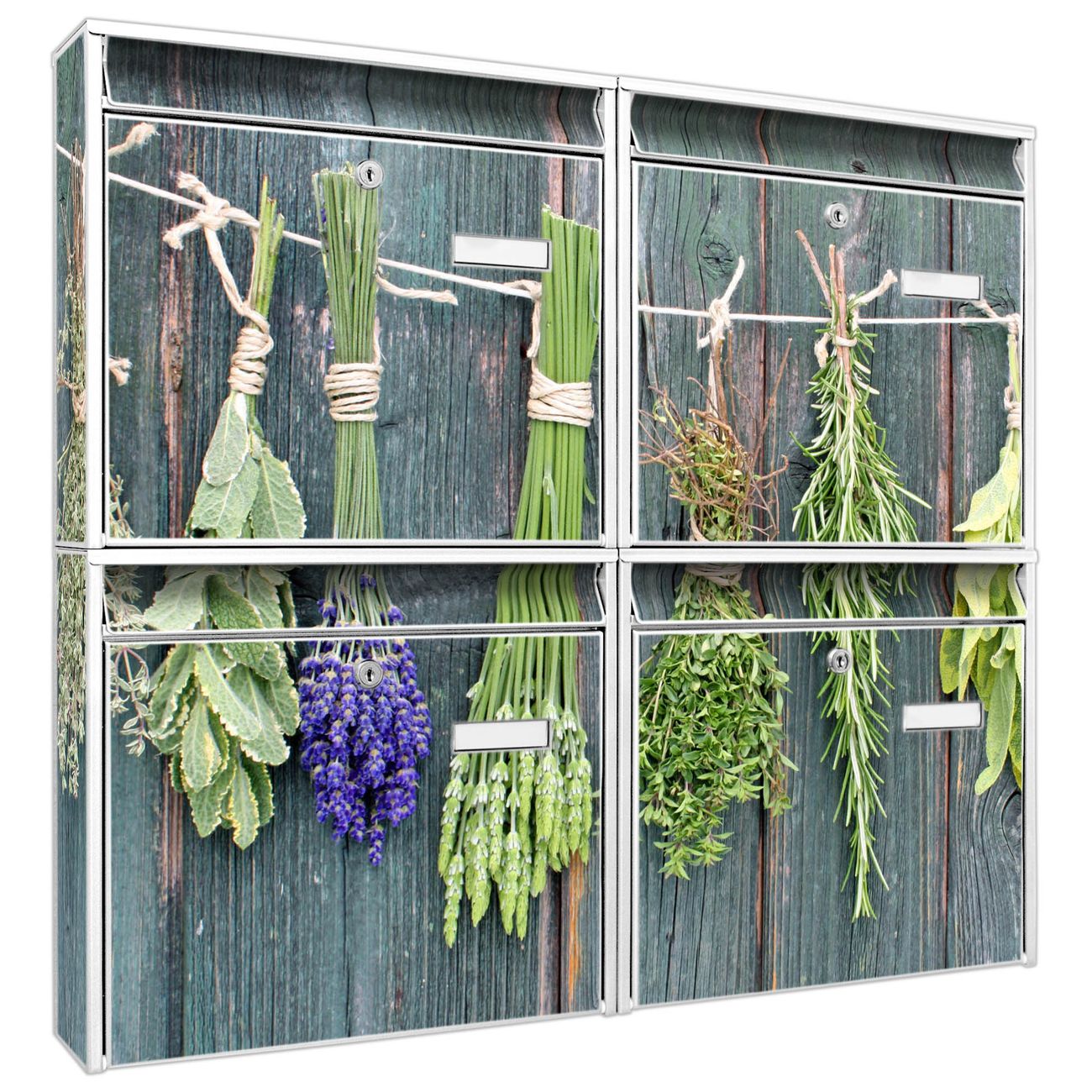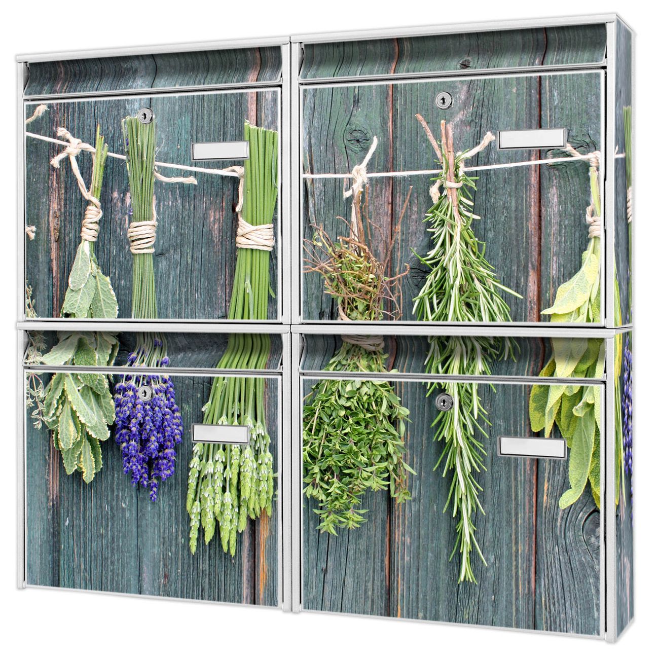 FUNKTION: Die Burg-Wächter Briefkastenanlage mit Motiv Acht Kräuter bietet Ihnen ausreichend Fassungsvermögen um auch A4 und C4 Sendungen zu empfangen. Das integrierte Namensschild lässt sich individuell beschriften. Wählen Sie aus den Grundfarben weiß, silber und schwarz. DESIGN: Die 4 Briefkästen haben ein ansprechendes und zeitloses Design, ohne dabei auf Funktionalität zu verzichten. Das Material ist sehr stabil, wetterfest und rostfrei. Durch das Motiv Acht Kräuter werden die Postkästen zu einem Blickfang. DETAILS: Die Postkästen bestehen aus verzinktem Stahl der zusätzlich mit Klarlack versiegelt wurde. Die Kästen sind gesamt 64,5cm hoch, 72,5cm breit und 10cm tief. Das Motiv besteht aus einer wetter- und UV-festen Folie, die Ihren Briefkasten zusätzlich vor Kratzern schützt. Die Postkästen werden mit Montagematerial, je einem Namensschild und je zwei Schlüsseln geliefert. NUTZEN: Das Briefkastenset eignet sich für die Wandmontage, die Größe bietet genügend Platz für Sendungen aller Art. Das zeitlose Design sowie die stabile Bauart bieten Ihnen einen treuen Begleiter für Ihre Post. BANJADO: