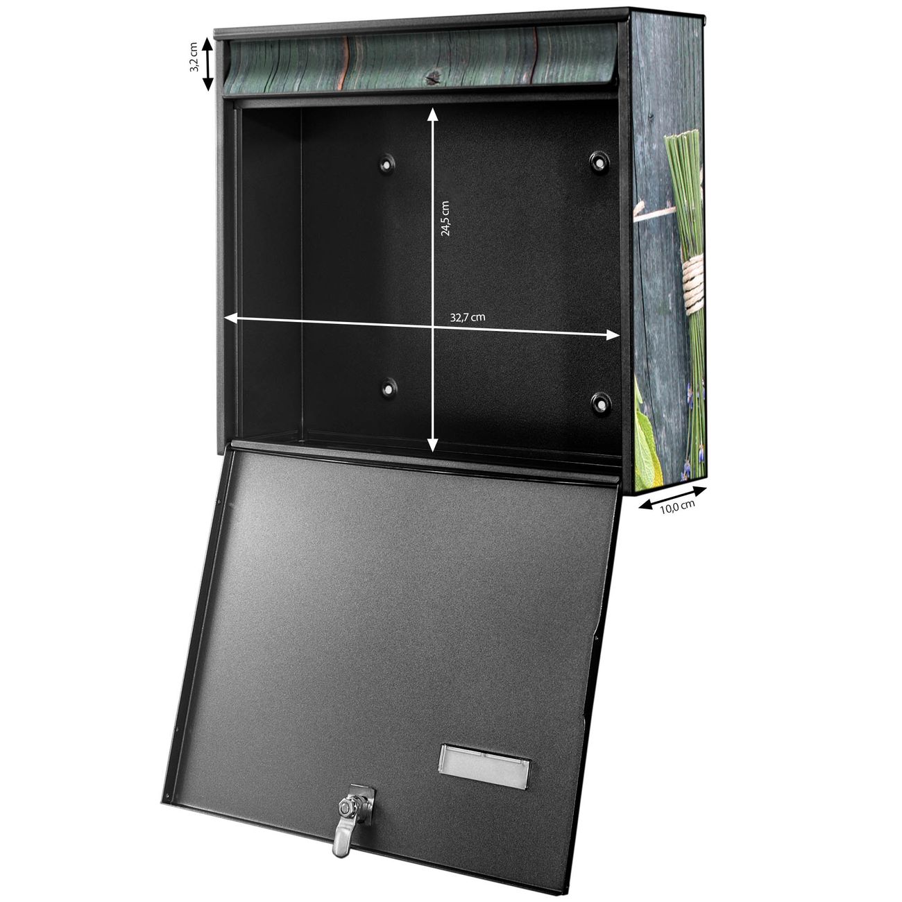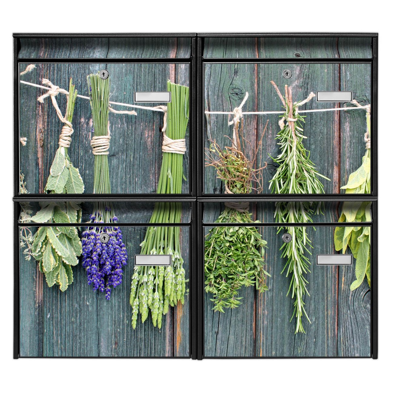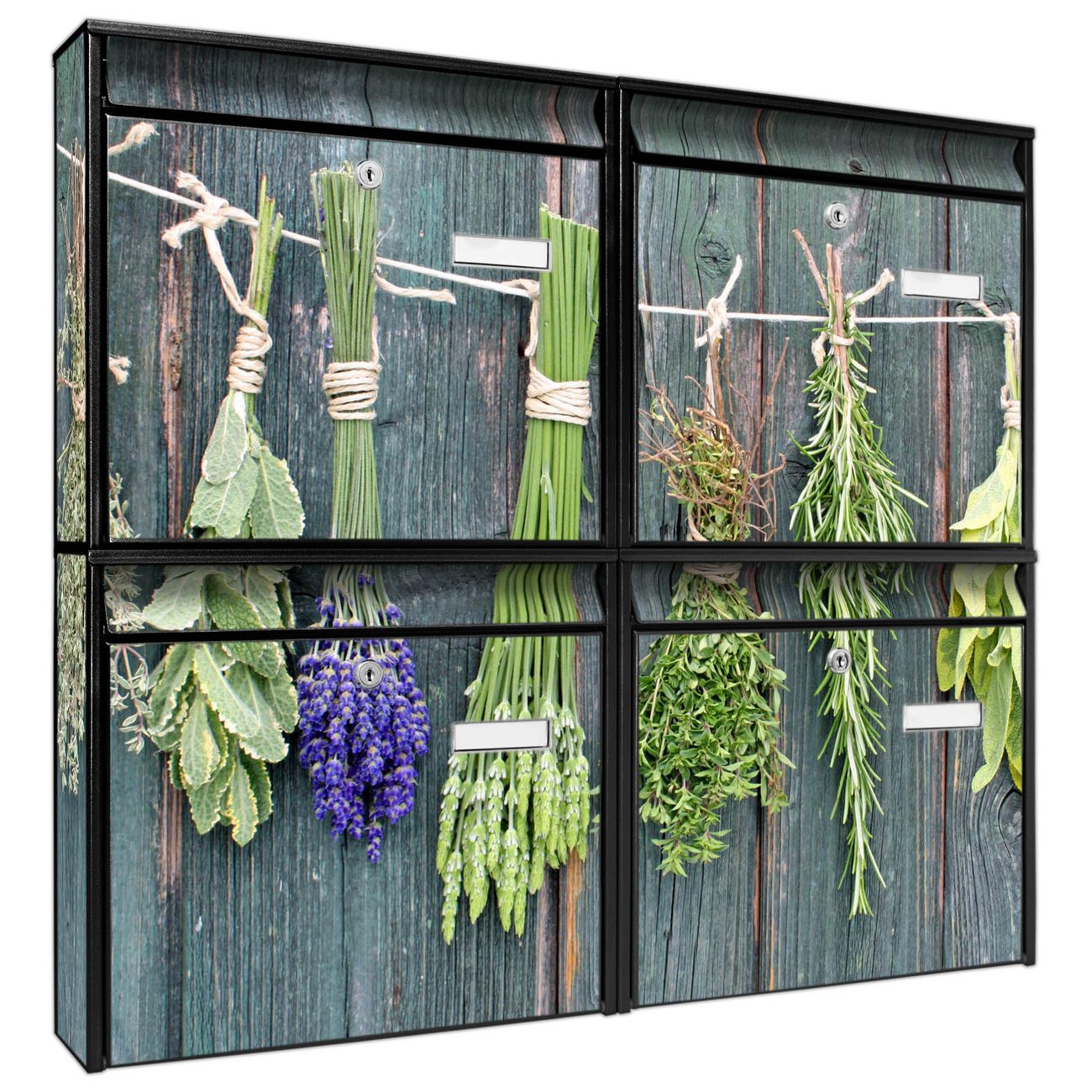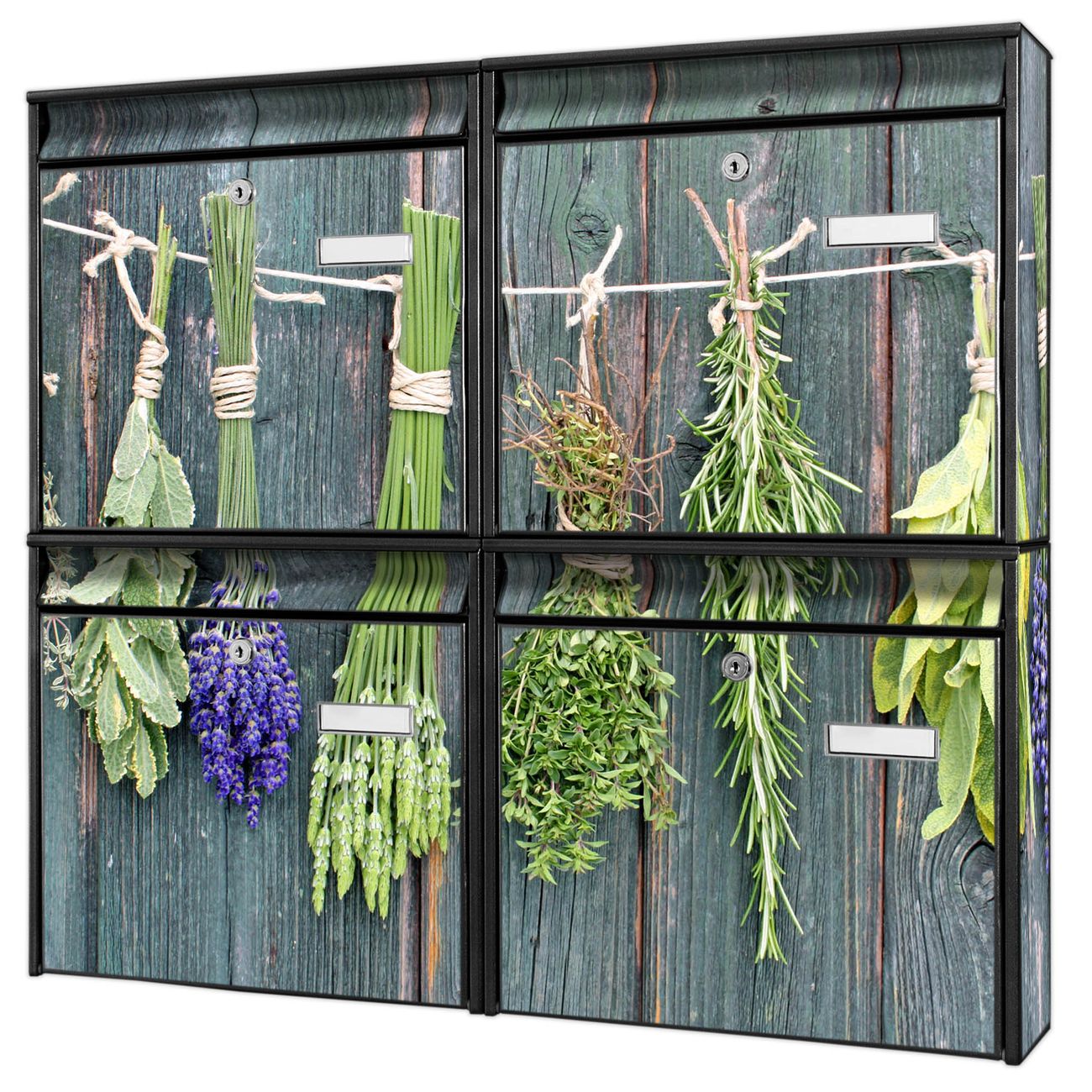 FUNKTION: Die Burg-Wächter Briefkastenanlage mit Motiv Acht Kräuter bietet Ihnen ausreichend Fassungsvermögen um auch A4 und C4 Sendungen zu empfangen. Das integrierte Namensschild lässt sich individuell beschriften. Wählen Sie aus den Grundfarben weiß, silber und schwarz. DESIGN: Die 4 Briefkästen haben ein ansprechendes und zeitloses Design, ohne dabei auf Funktionalität zu verzichten. Das Material ist sehr stabil, wetterfest und rostfrei. Durch das Motiv Acht Kräuter werden die Postkästen zu einem Blickfang. DETAILS: Die Postkästen bestehen aus verzinktem Stahl der zusätzlich mit Klarlack versiegelt wurde. Die Kästen sind gesamt 64,5cm hoch, 72,5cm breit und 10cm tief. Das Motiv besteht aus einer wetter- und UV-festen Folie, die Ihren Briefkasten zusätzlich vor Kratzern schützt. Die Postkästen werden mit Montagematerial, je einem Namensschild und je zwei Schlüsseln geliefert. NUTZEN: Das Briefkastenset eignet sich für die Wandmontage, die Größe bietet genügend Platz für Sendungen aller Art. Das zeitlose Design sowie die stabile Bauart bieten Ihnen einen treuen Begleiter für Ihre Post. BANJADO: