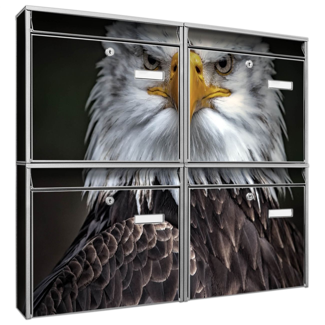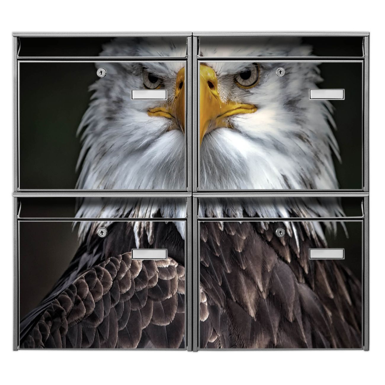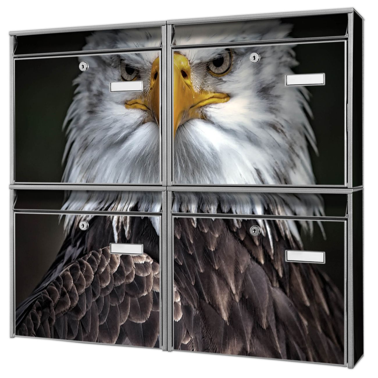FUNKTION: Die Burg-Wächter Briefkastenanlage mit Motiv Adler bietet Ihnen ausreichend Fassungsvermögen um auch A4 und C4 Sendungen zu empfangen. Das integrierte Namensschild lässt sich individuell beschriften. Wählen Sie aus den Grundfarben weiß, silber und schwarz. DESIGN: Die 4 Briefkästen haben ein ansprechendes und zeitloses Design, ohne dabei auf Funktionalität zu verzichten. Das Material ist sehr stabil, wetterfest und rostfrei. Durch das Motiv Adler werden die Postkästen zu einem Blickfang. DETAILS: Die Postkästen bestehen aus verzinktem Stahl der zusätzlich mit Klarlack versiegelt wurde. Die Kästen sind gesamt 64,5cm hoch, 72,5cm breit und 10cm tief. Das Motiv besteht aus einer wetter- und UV-festen Folie, die Ihren Briefkasten zusätzlich vor Kratzern schützt. Die Postkästen werden mit Montagematerial, je einem Namensschild und je zwei Schlüsseln geliefert. NUTZEN: Das Briefkastenset eignet sich für die Wandmontage, die Größe bietet genügend Platz für Sendungen aller Art. Das zeitlose Design sowie die stabile Bauart bieten Ihnen einen treuen Begleiter für Ihre Post. BANJADO: