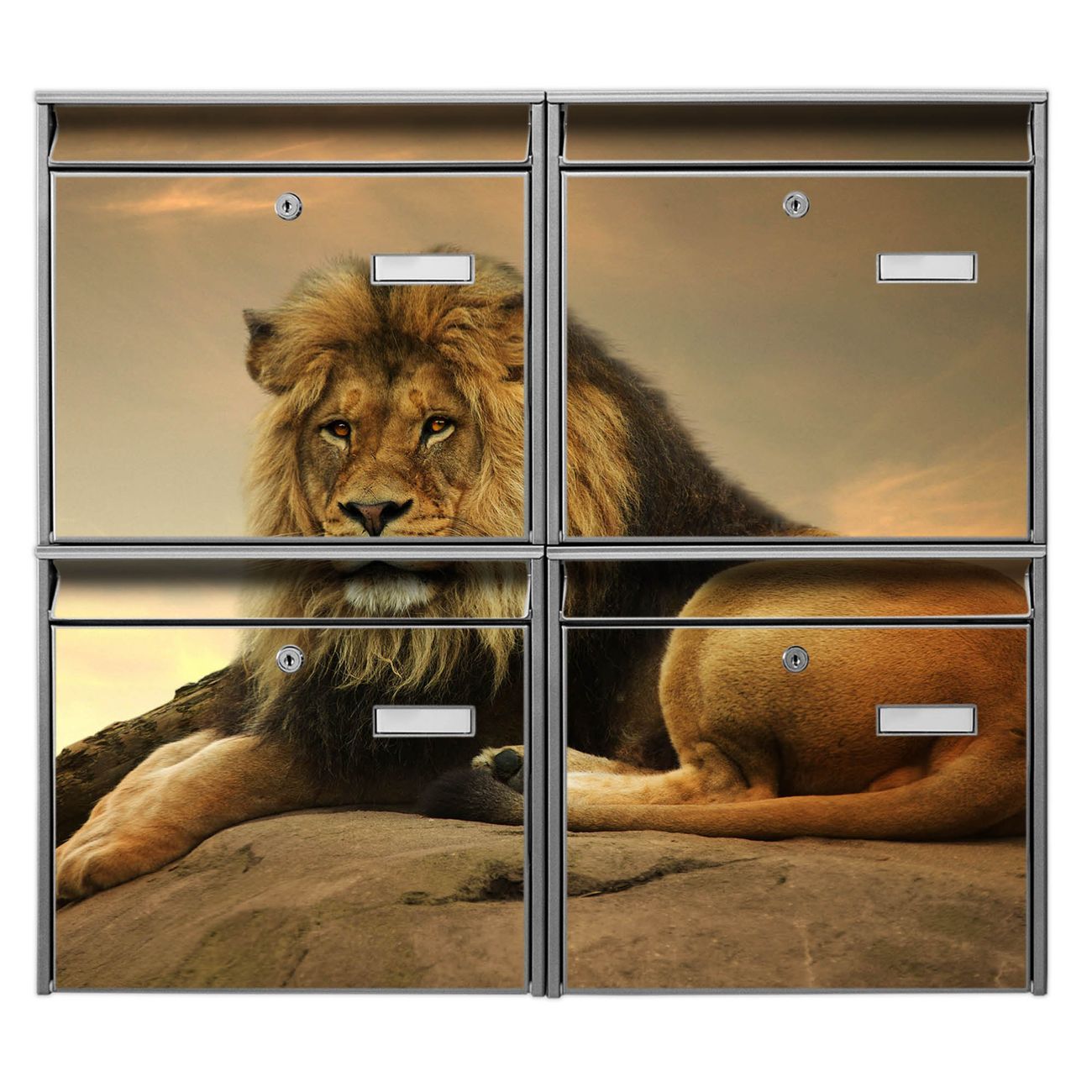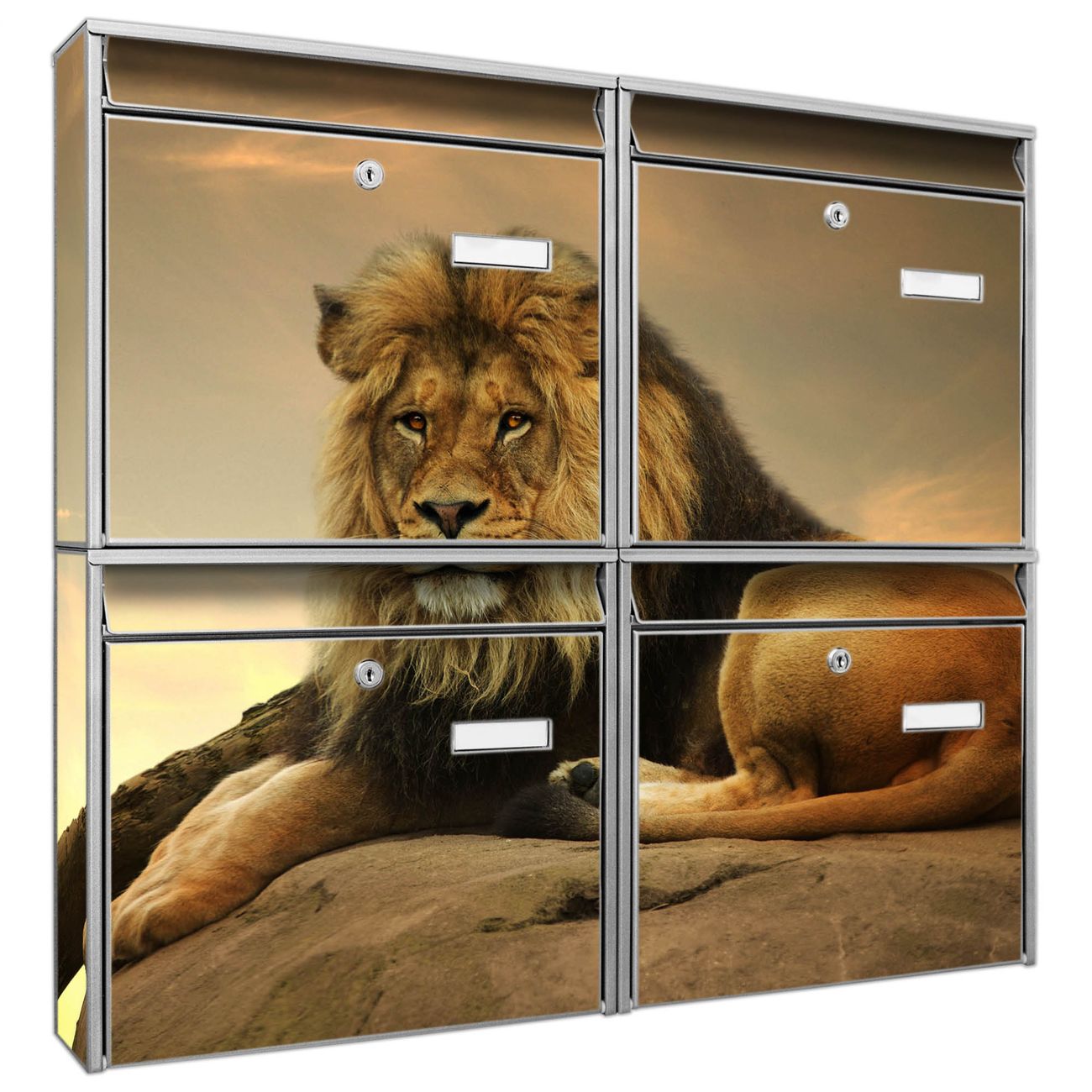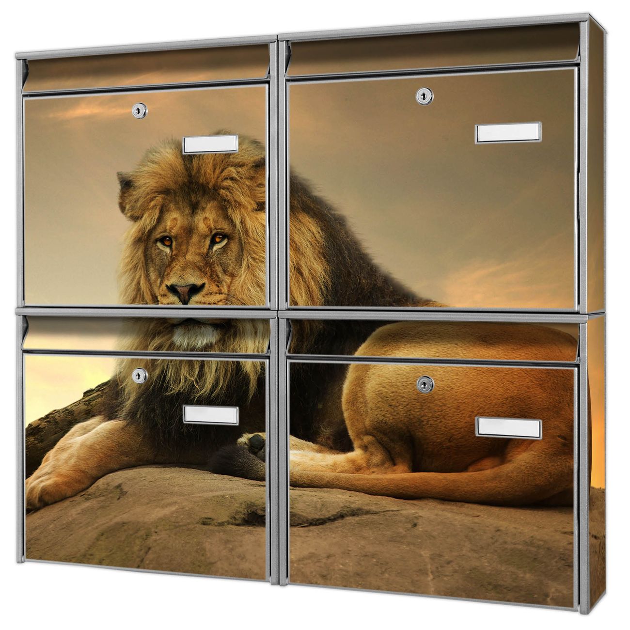 FUNKTION: Die Burg-Wächter Briefkastenanlage mit Motiv Adrian bietet Ihnen ausreichend Fassungsvermögen um auch A4 und C4 Sendungen zu empfangen. Das integrierte Namensschild lässt sich individuell beschriften. Wählen Sie aus den Grundfarben weiß, silber und schwarz. DESIGN: Die 4 Briefkästen haben ein ansprechendes und zeitloses Design, ohne dabei auf Funktionalität zu verzichten. Das Material ist sehr stabil, wetterfest und rostfrei. Durch das Motiv Adrian werden die Postkästen zu einem Blickfang. DETAILS: Die Postkästen bestehen aus verzinktem Stahl der zusätzlich mit Klarlack versiegelt wurde. Die Kästen sind gesamt 64,5cm hoch, 72,5cm breit und 10cm tief. Das Motiv besteht aus einer wetter- und UV-festen Folie, die Ihren Briefkasten zusätzlich vor Kratzern schützt. Die Postkästen werden mit Montagematerial, je einem Namensschild und je zwei Schlüsseln geliefert. NUTZEN: Das Briefkastenset eignet sich für die Wandmontage, die Größe bietet genügend Platz für Sendungen aller Art. Das zeitlose Design sowie die stabile Bauart bieten Ihnen einen treuen Begleiter für Ihre Post. BANJADO: