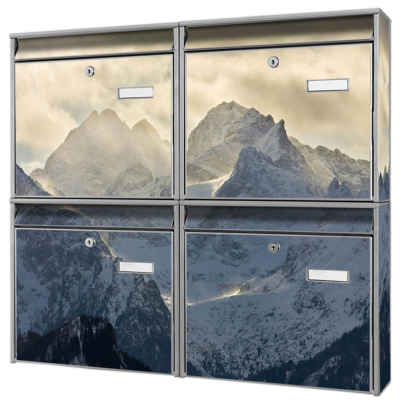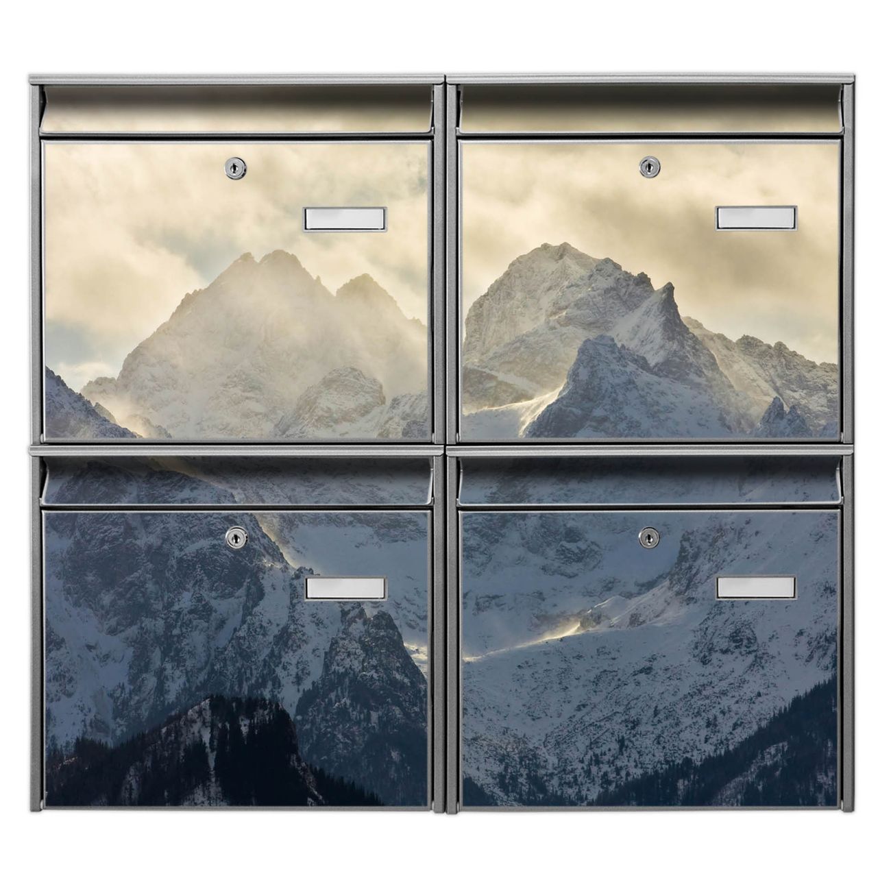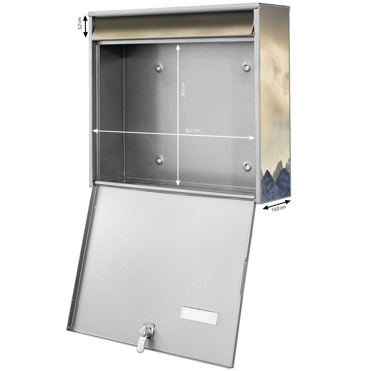 FUNKTION: Die Burg-Wächter Briefkastenanlage mit Motiv Alpen im Sonnenschein bietet Ihnen ausreichend Fassungsvermögen um auch A4 und C4 Sendungen zu empfangen. Das integrierte Namensschild lässt sich individuell beschriften. Wählen Sie aus den Grundfarben weiß, silber und schwarz. DESIGN: Die 4 Briefkästen haben ein ansprechendes und zeitloses Design, ohne dabei auf Funktionalität zu verzichten. Das Material ist sehr stabil, wetterfest und rostfrei. Durch das Motiv Alpen im Sonnenschein werden die Postkästen zu einem Blickfang. DETAILS: Die Postkästen bestehen aus verzinktem Stahl der zusätzlich mit Klarlack versiegelt wurde. Die Kästen sind gesamt 64,5cm hoch, 72,5cm breit und 10cm tief. Das Motiv besteht aus einer wetter- und UV-festen Folie, die Ihren Briefkasten zusätzlich vor Kratzern schützt. Die Postkästen werden mit Montagematerial, je einem Namensschild und je zwei Schlüsseln geliefert. NUTZEN: Das Briefkastenset eignet sich für die Wandmontage, die Größe bietet genügend Platz für Sendungen aller Art. Das zeitlose Design sowie die stabile Bauart bieten Ihnen einen treuen Begleiter für Ihre Post. BANJADO: