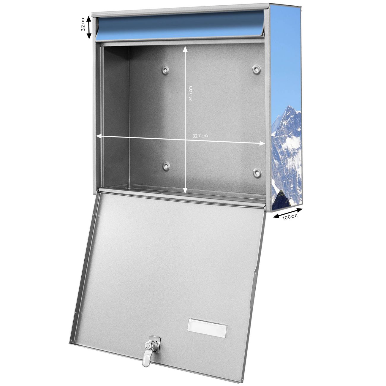 FUNKTION: Die Burg-Wächter Briefkastenanlage mit Motiv Alpen bietet Ihnen ausreichend Fassungsvermögen um auch A4 und C4 Sendungen zu empfangen. Das integrierte Namensschild lässt sich individuell beschriften. Wählen Sie aus den Grundfarben weiß, silber und schwarz. DESIGN: Die 4 Briefkästen haben ein ansprechendes und zeitloses Design, ohne dabei auf Funktionalität zu verzichten. Das Material ist sehr stabil, wetterfest und rostfrei. Durch das Motiv Alpen werden die Postkästen zu einem Blickfang. DETAILS: Die Postkästen bestehen aus verzinktem Stahl der zusätzlich mit Klarlack versiegelt wurde. Die Kästen sind gesamt 64,5cm hoch, 72,5cm breit und 10cm tief. Das Motiv besteht aus einer wetter- und UV-festen Folie, die Ihren Briefkasten zusätzlich vor Kratzern schützt. Die Postkästen werden mit Montagematerial, je einem Namensschild und je zwei Schlüsseln geliefert. NUTZEN: Das Briefkastenset eignet sich für die Wandmontage, die Größe bietet genügend Platz für Sendungen aller Art. Das zeitlose Design sowie die stabile Bauart bieten Ihnen einen treuen Begleiter für Ihre Post. BANJADO: