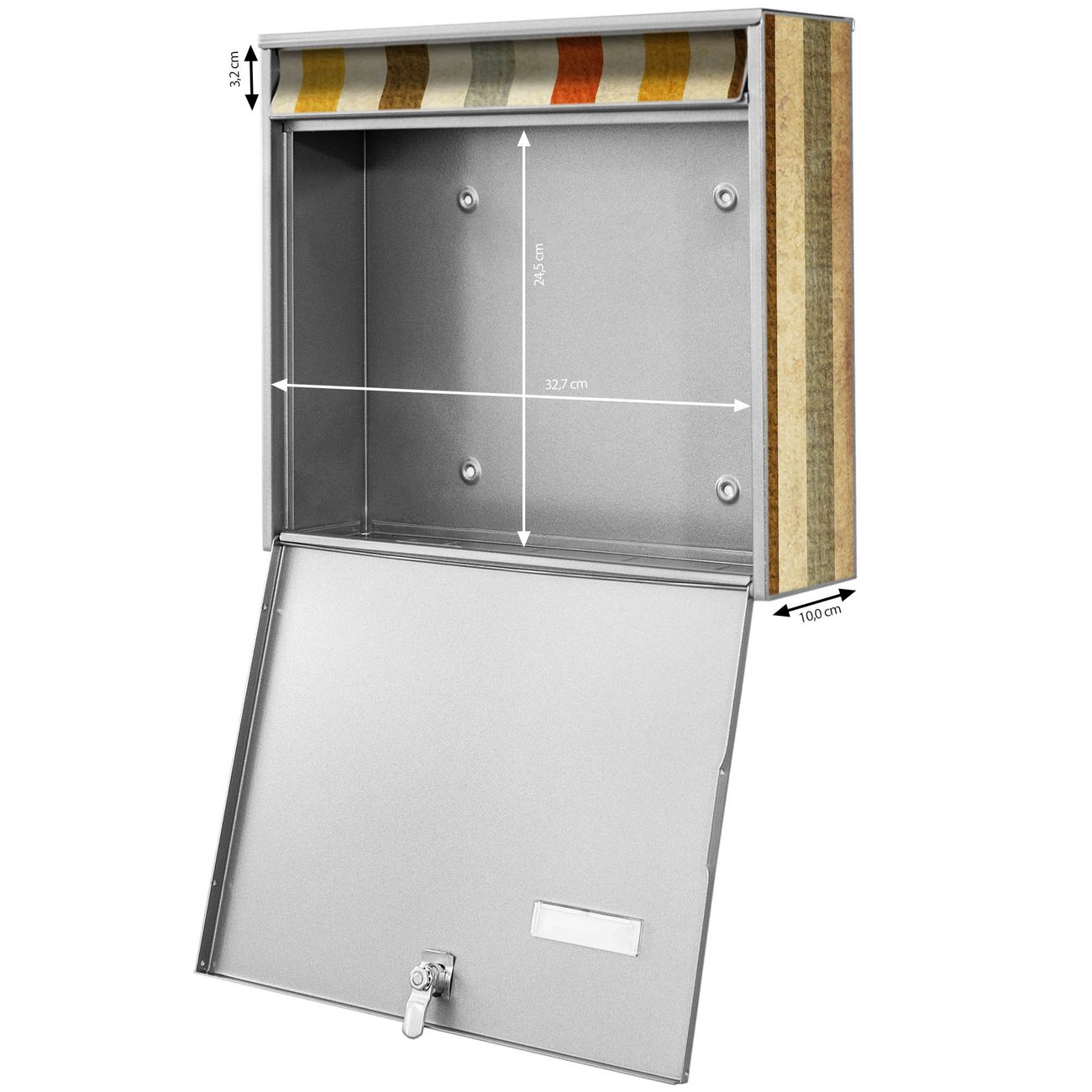 FUNKTION: Die Burg-Wächter Briefkastenanlage mit Motiv Alte Streifen bietet Ihnen ausreichend Fassungsvermögen um auch A4 und C4 Sendungen zu empfangen. Das integrierte Namensschild lässt sich individuell beschriften. Wählen Sie aus den Grundfarben weiß, silber und schwarz. DESIGN: Die 4 Briefkästen haben ein ansprechendes und zeitloses Design, ohne dabei auf Funktionalität zu verzichten. Das Material ist sehr stabil, wetterfest und rostfrei. Durch das Motiv Alte Streifen werden die Postkästen zu einem Blickfang. DETAILS: Die Postkästen bestehen aus verzinktem Stahl der zusätzlich mit Klarlack versiegelt wurde. Die Kästen sind gesamt 64,5cm hoch, 72,5cm breit und 10cm tief. Das Motiv besteht aus einer wetter- und UV-festen Folie, die Ihren Briefkasten zusätzlich vor Kratzern schützt. Die Postkästen werden mit Montagematerial, je einem Namensschild und je zwei Schlüsseln geliefert. NUTZEN: Das Briefkastenset eignet sich für die Wandmontage, die Größe bietet genügend Platz für Sendungen aller Art. Das zeitlose Design sowie die stabile Bauart bieten Ihnen einen treuen Begleiter für Ihre Post. BANJADO:
