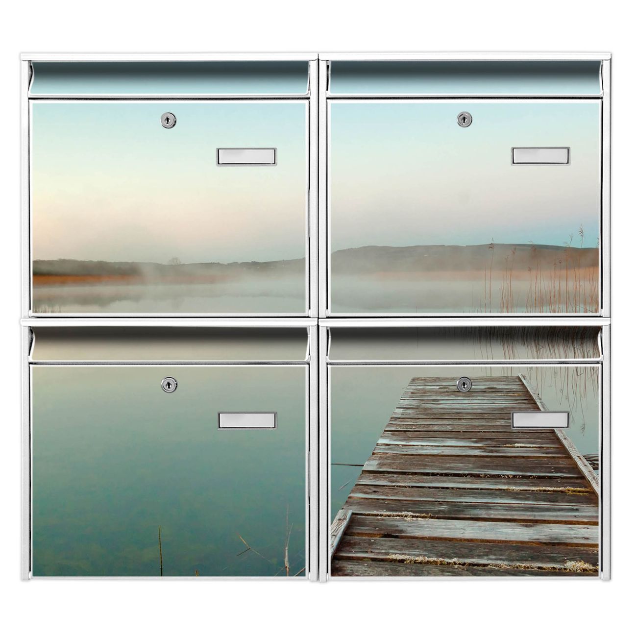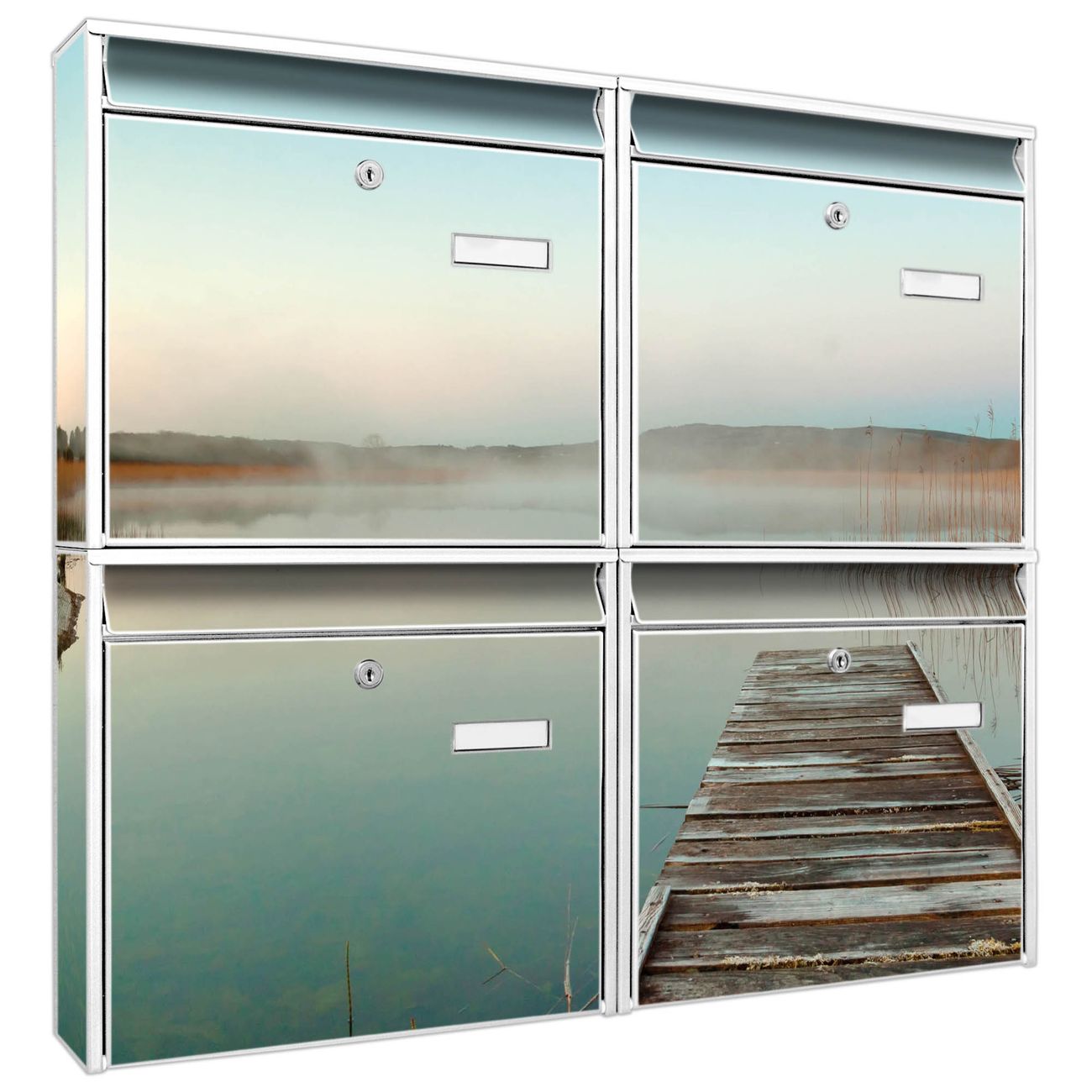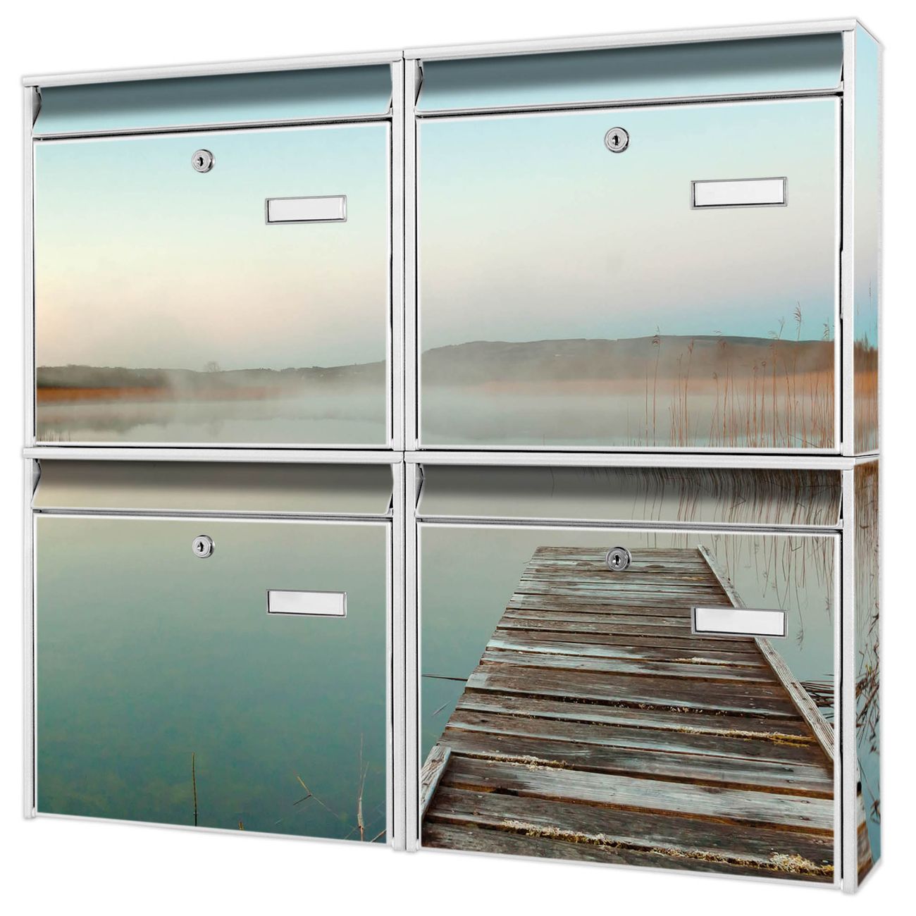 FUNKTION: Die Burg-Wächter Briefkastenanlage mit Motiv Alter Steg bietet Ihnen ausreichend Fassungsvermögen um auch A4 und C4 Sendungen zu empfangen. Das integrierte Namensschild lässt sich individuell beschriften. Wählen Sie aus den Grundfarben weiß, silber und schwarz. DESIGN: Die 4 Briefkästen haben ein ansprechendes und zeitloses Design, ohne dabei auf Funktionalität zu verzichten. Das Material ist sehr stabil, wetterfest und rostfrei. Durch das Motiv Alter Steg werden die Postkästen zu einem Blickfang. DETAILS: Die Postkästen bestehen aus verzinktem Stahl der zusätzlich mit Klarlack versiegelt wurde. Die Kästen sind gesamt 64,5cm hoch, 72,5cm breit und 10cm tief. Das Motiv besteht aus einer wetter- und UV-festen Folie, die Ihren Briefkasten zusätzlich vor Kratzern schützt. Die Postkästen werden mit Montagematerial, je einem Namensschild und je zwei Schlüsseln geliefert. NUTZEN: Das Briefkastenset eignet sich für die Wandmontage, die Größe bietet genügend Platz für Sendungen aller Art. Das zeitlose Design sowie die stabile Bauart bieten Ihnen einen treuen Begleiter für Ihre Post. BANJADO: