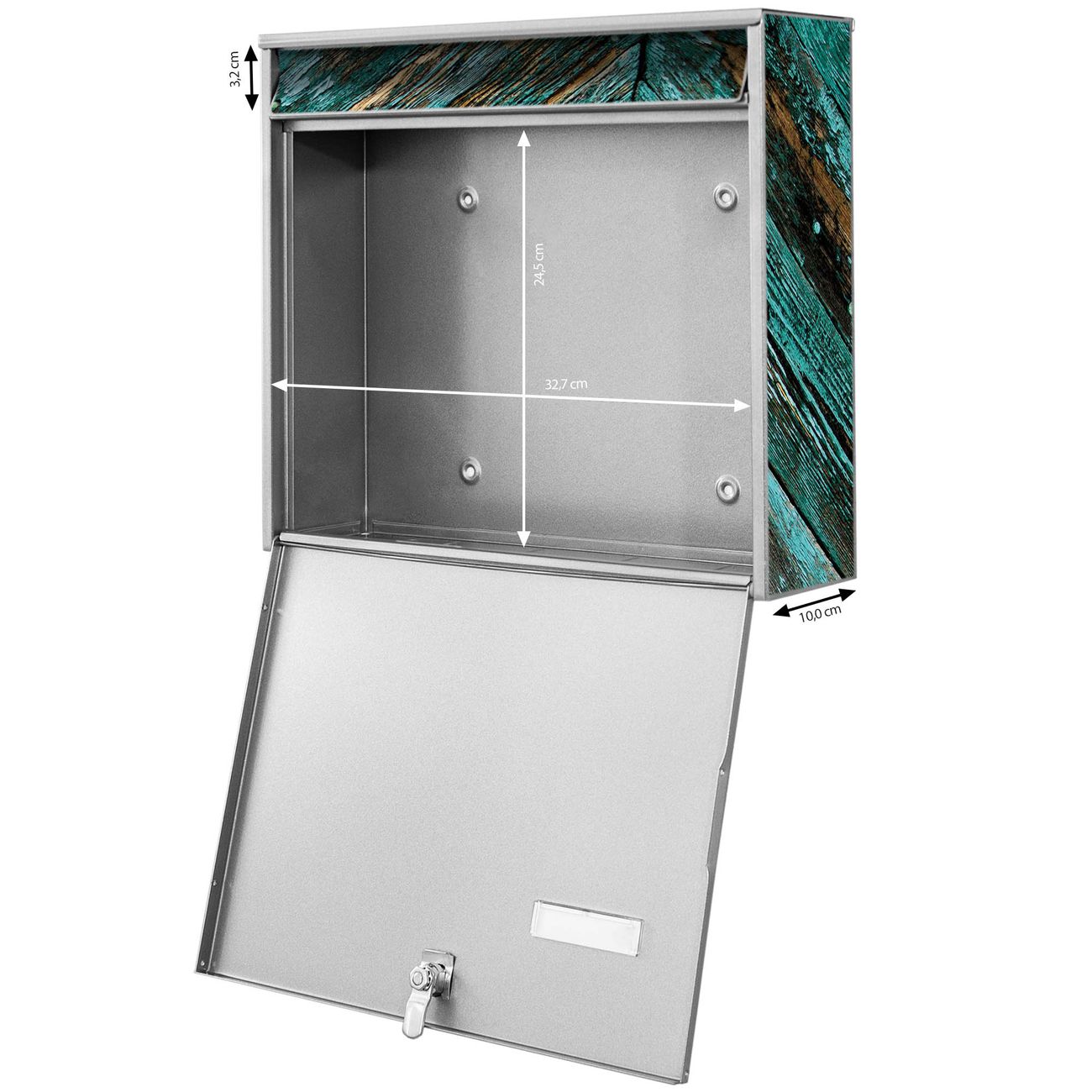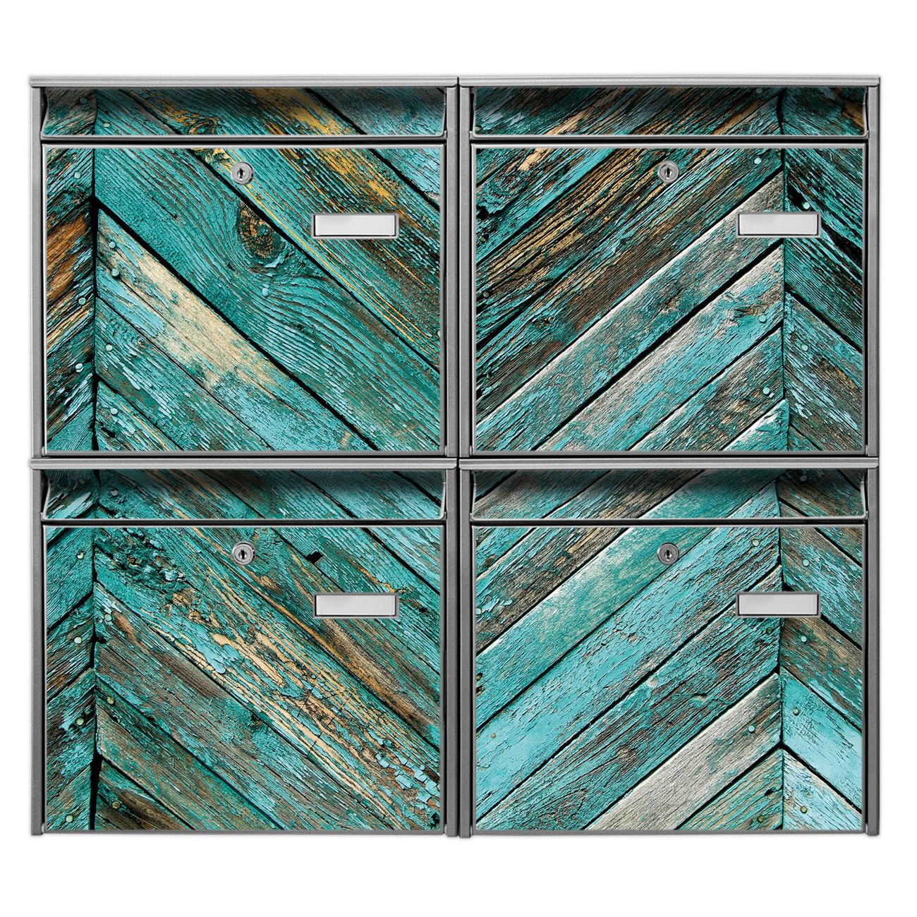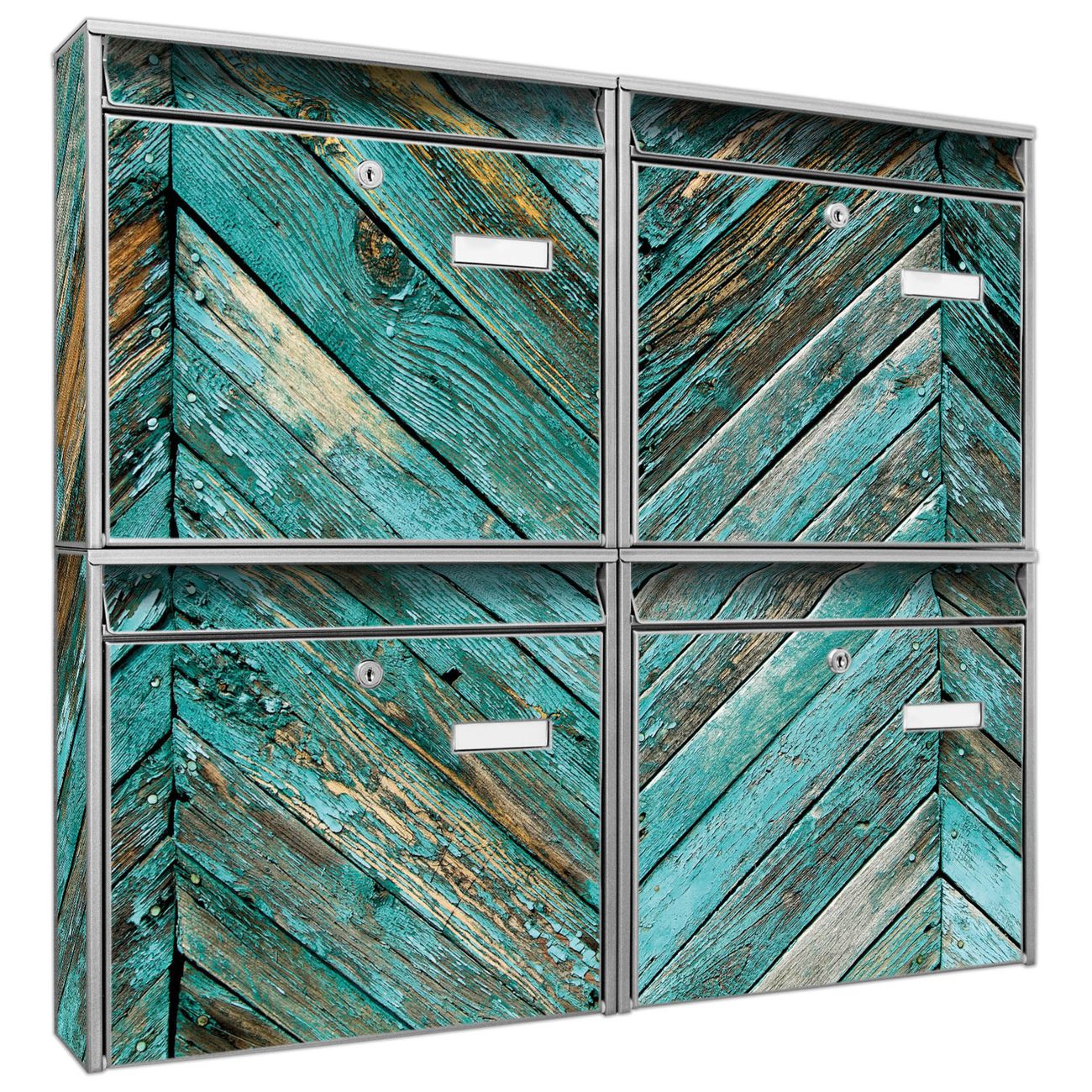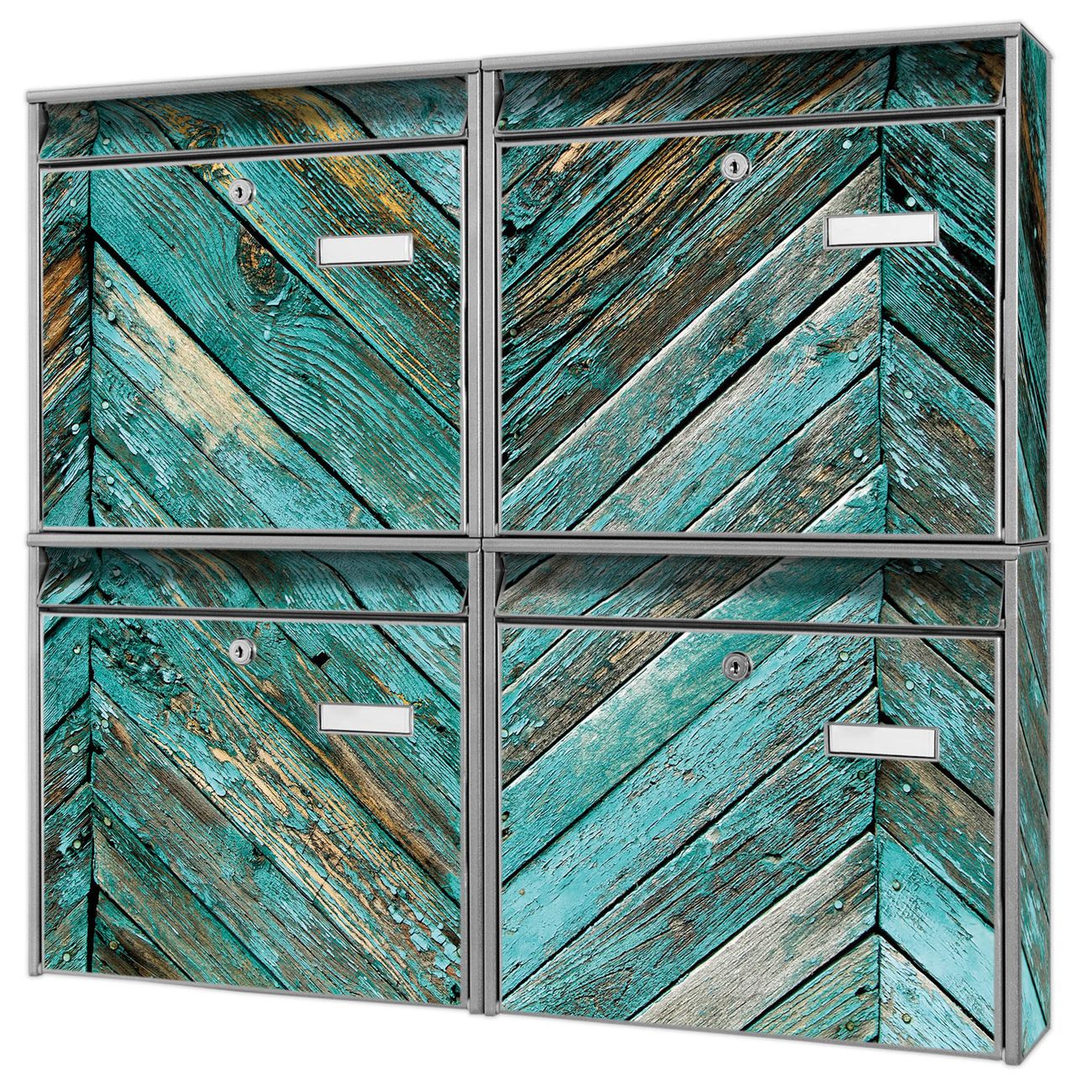 FUNKTION: Die Burg-Wächter Briefkastenanlage mit Motiv Altes Holz Blau bietet Ihnen ausreichend Fassungsvermögen um auch A4 und C4 Sendungen zu empfangen. Das integrierte Namensschild lässt sich individuell beschriften. Wählen Sie aus den Grundfarben weiß, silber und schwarz. DESIGN: Die 4 Briefkästen haben ein ansprechendes und zeitloses Design, ohne dabei auf Funktionalität zu verzichten. Das Material ist sehr stabil, wetterfest und rostfrei. Durch das Motiv Altes Holz Blau werden die Postkästen zu einem Blickfang. DETAILS: Die Postkästen bestehen aus verzinktem Stahl der zusätzlich mit Klarlack versiegelt wurde. Die Kästen sind gesamt 64,5cm hoch, 72,5cm breit und 10cm tief. Das Motiv besteht aus einer wetter- und UV-festen Folie, die Ihren Briefkasten zusätzlich vor Kratzern schützt. Die Postkästen werden mit Montagematerial, je einem Namensschild und je zwei Schlüsseln geliefert. NUTZEN: Das Briefkastenset eignet sich für die Wandmontage, die Größe bietet genügend Platz für Sendungen aller Art. Das zeitlose Design sowie die stabile Bauart bieten Ihnen einen treuen Begleiter für Ihre Post. BANJADO: