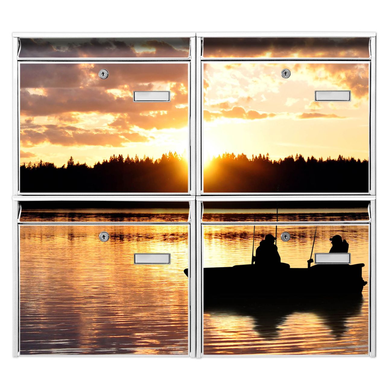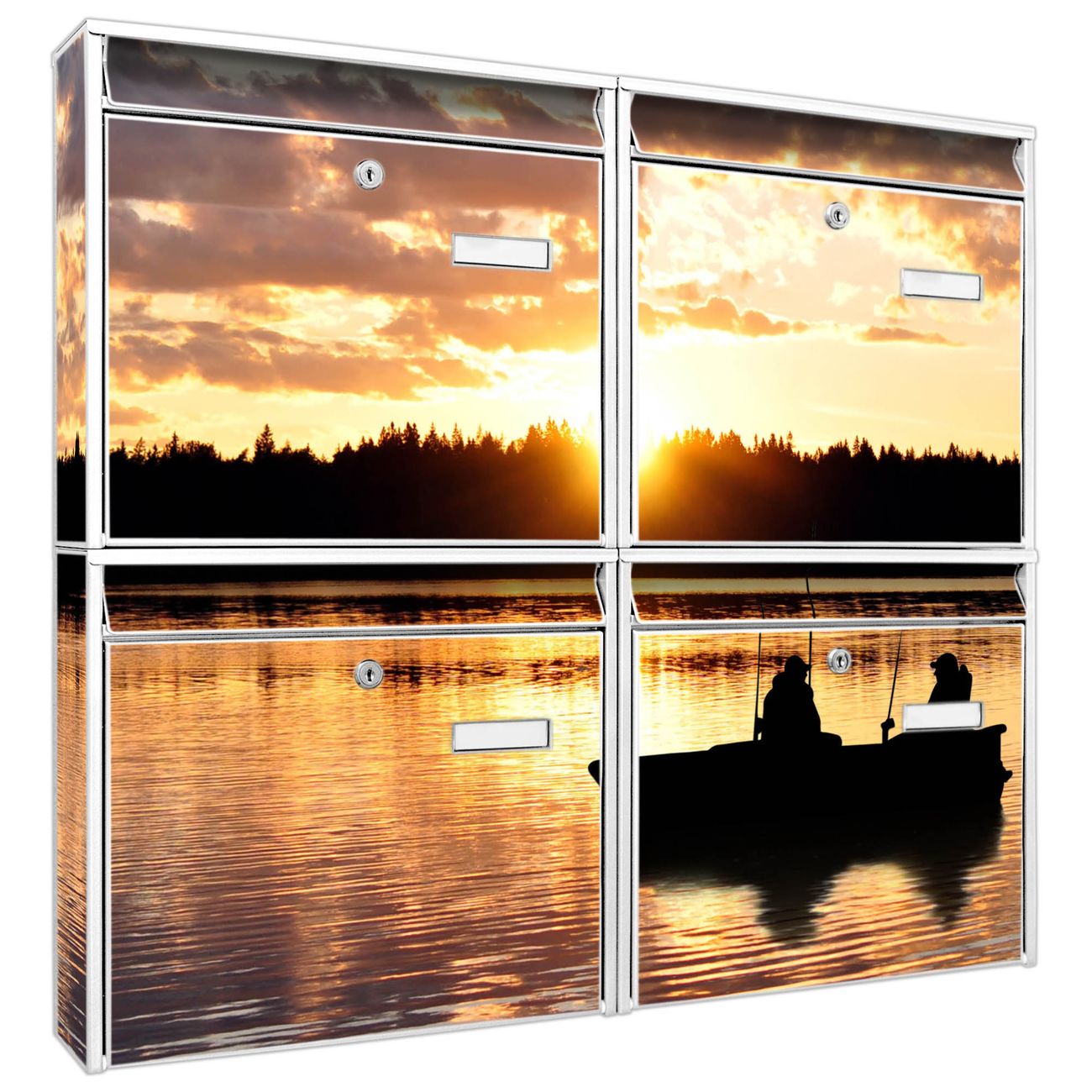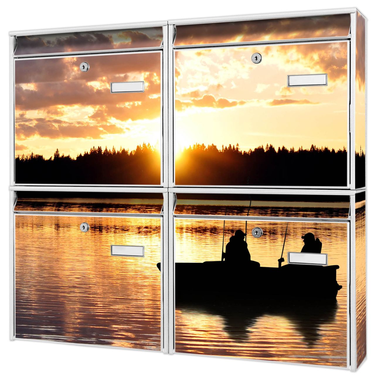 FUNKTION: Die Burg-Wächter Briefkastenanlage mit Motiv Angler bietet Ihnen ausreichend Fassungsvermögen um auch A4 und C4 Sendungen zu empfangen. Das integrierte Namensschild lässt sich individuell beschriften. Wählen Sie aus den Grundfarben weiß, silber und schwarz. DESIGN: Die 4 Briefkästen haben ein ansprechendes und zeitloses Design, ohne dabei auf Funktionalität zu verzichten. Das Material ist sehr stabil, wetterfest und rostfrei. Durch das Motiv Angler werden die Postkästen zu einem Blickfang. DETAILS: Die Postkästen bestehen aus verzinktem Stahl der zusätzlich mit Klarlack versiegelt wurde. Die Kästen sind gesamt 64,5cm hoch, 72,5cm breit und 10cm tief. Das Motiv besteht aus einer wetter- und UV-festen Folie, die Ihren Briefkasten zusätzlich vor Kratzern schützt. Die Postkästen werden mit Montagematerial, je einem Namensschild und je zwei Schlüsseln geliefert. NUTZEN: Das Briefkastenset eignet sich für die Wandmontage, die Größe bietet genügend Platz für Sendungen aller Art. Das zeitlose Design sowie die stabile Bauart bieten Ihnen einen treuen Begleiter für Ihre Post. BANJADO: