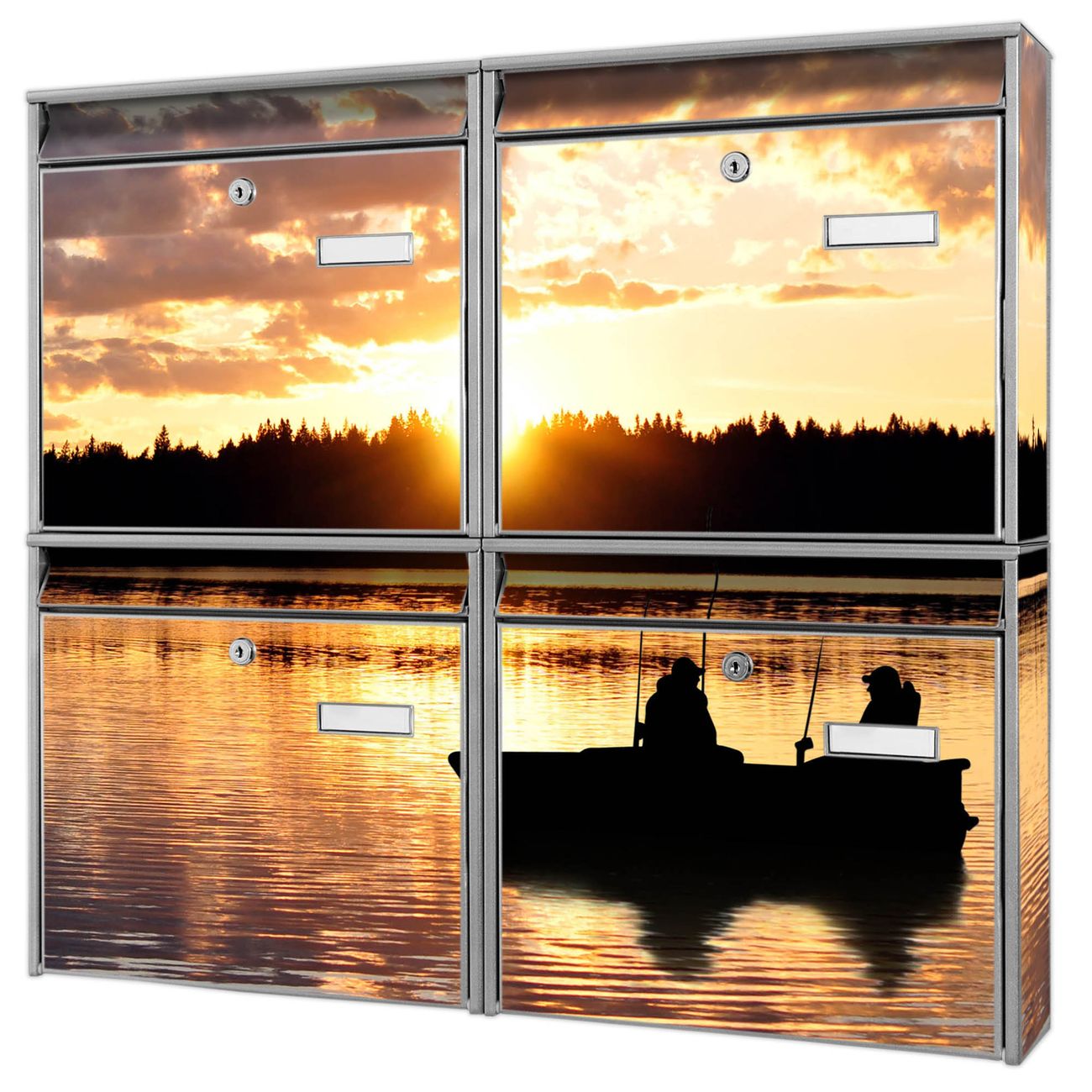 FUNKTION: Die Burg-Wächter Briefkastenanlage mit Motiv Angler bietet Ihnen ausreichend Fassungsvermögen um auch A4 und C4 Sendungen zu empfangen. Das integrierte Namensschild lässt sich individuell beschriften. Wählen Sie aus den Grundfarben weiß, silber und schwarz. DESIGN: Die 4 Briefkästen haben ein ansprechendes und zeitloses Design, ohne dabei auf Funktionalität zu verzichten. Das Material ist sehr stabil, wetterfest und rostfrei. Durch das Motiv Angler werden die Postkästen zu einem Blickfang. DETAILS: Die Postkästen bestehen aus verzinktem Stahl der zusätzlich mit Klarlack versiegelt wurde. Die Kästen sind gesamt 64,5cm hoch, 72,5cm breit und 10cm tief. Das Motiv besteht aus einer wetter- und UV-festen Folie, die Ihren Briefkasten zusätzlich vor Kratzern schützt. Die Postkästen werden mit Montagematerial, je einem Namensschild und je zwei Schlüsseln geliefert. NUTZEN: Das Briefkastenset eignet sich für die Wandmontage, die Größe bietet genügend Platz für Sendungen aller Art. Das zeitlose Design sowie die stabile Bauart bieten Ihnen einen treuen Begleiter für Ihre Post. BANJADO:
