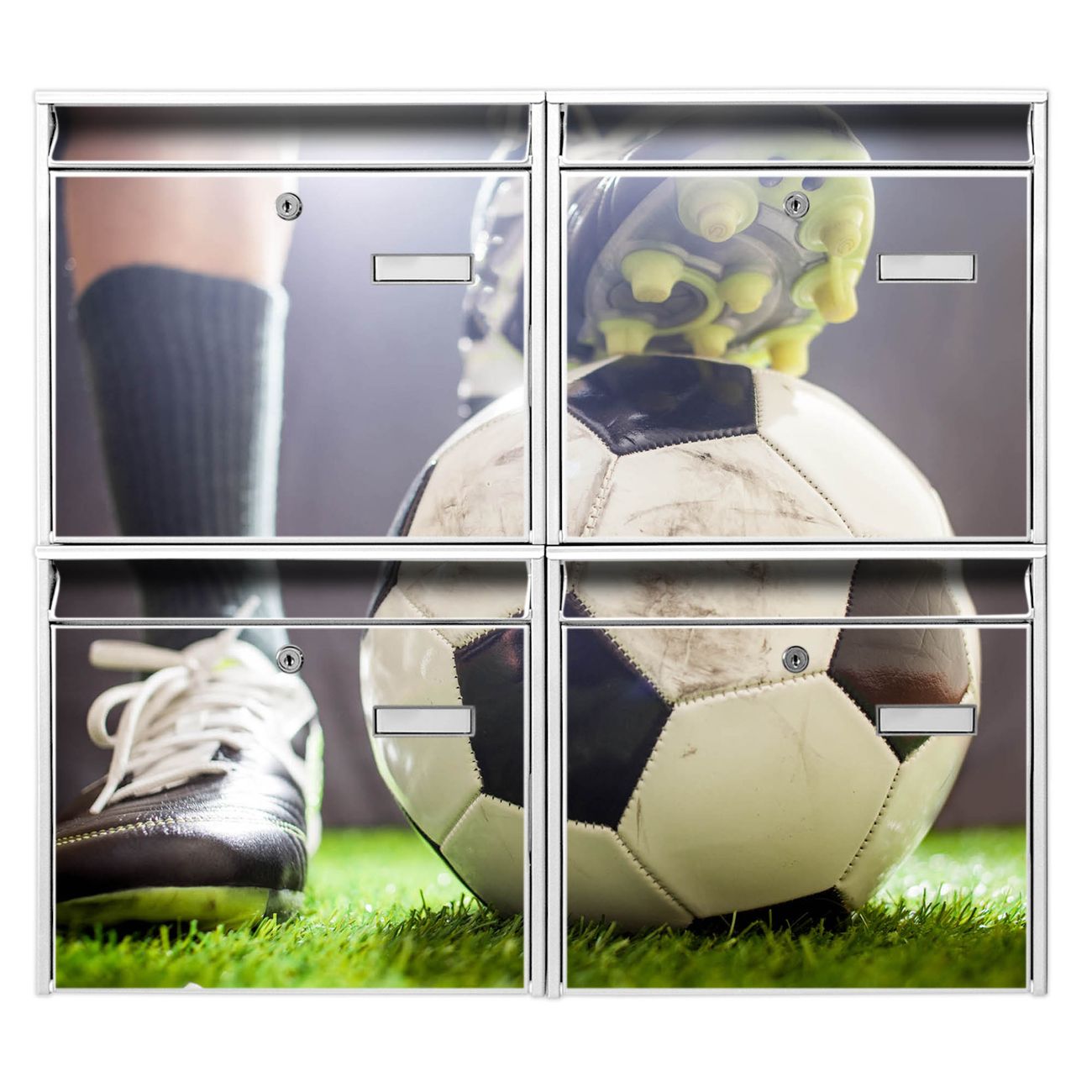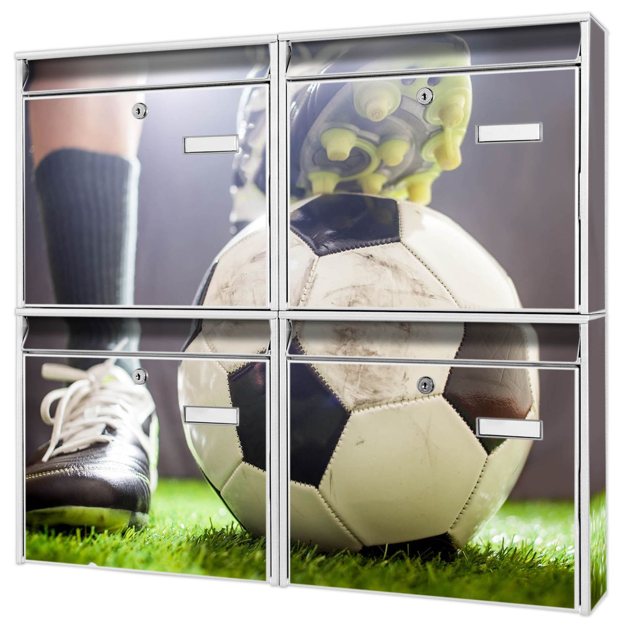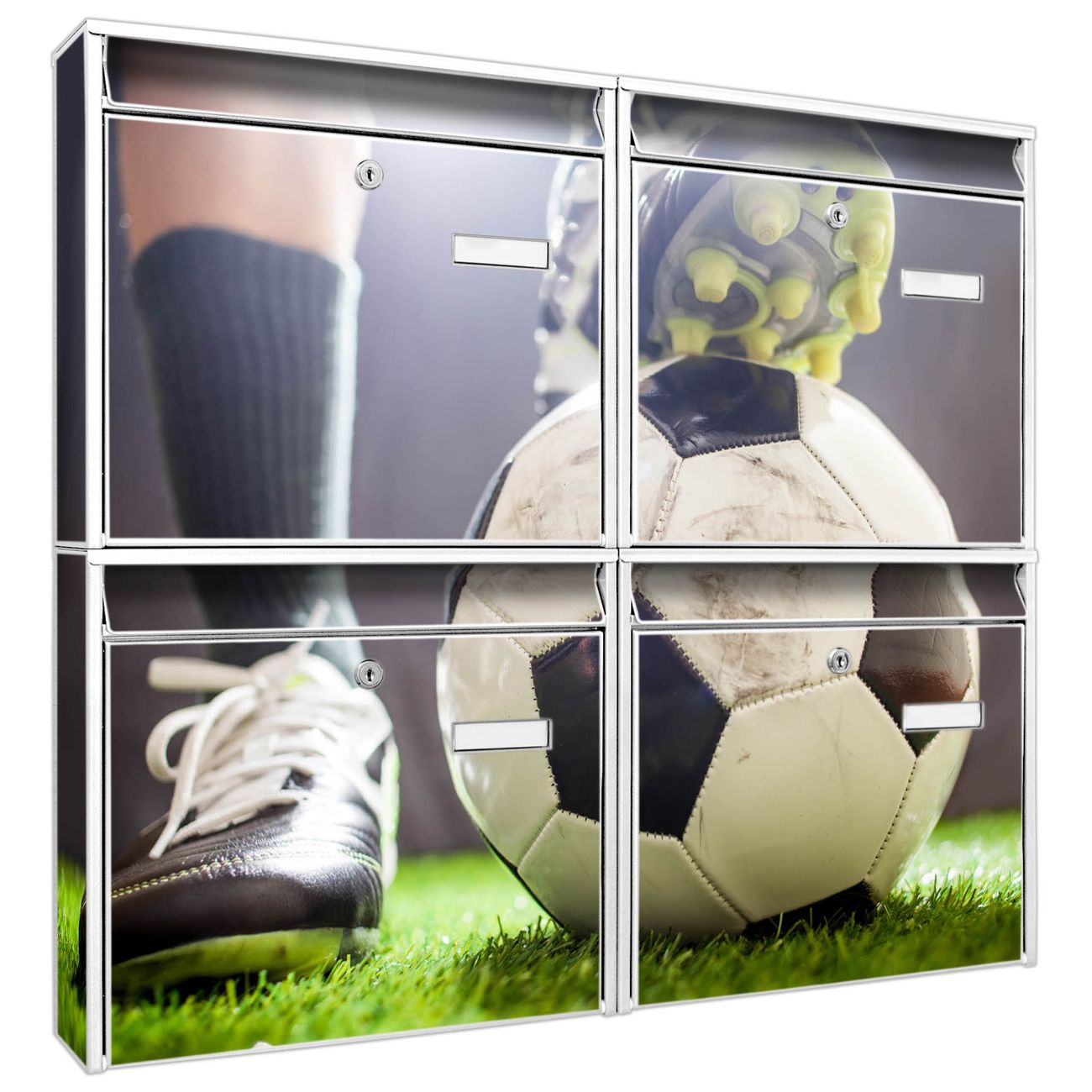 FUNKTION: Die Burg-Wächter Briefkastenanlage mit Motiv Anpfiff bietet Ihnen ausreichend Fassungsvermögen um auch A4 und C4 Sendungen zu empfangen. Das integrierte Namensschild lässt sich individuell beschriften. Wählen Sie aus den Grundfarben weiß, silber und schwarz. DESIGN: Die 4 Briefkästen haben ein ansprechendes und zeitloses Design, ohne dabei auf Funktionalität zu verzichten. Das Material ist sehr stabil, wetterfest und rostfrei. Durch das Motiv Anpfiff werden die Postkästen zu einem Blickfang. DETAILS: Die Postkästen bestehen aus verzinktem Stahl der zusätzlich mit Klarlack versiegelt wurde. Die Kästen sind gesamt 64,5cm hoch, 72,5cm breit und 10cm tief. Das Motiv besteht aus einer wetter- und UV-festen Folie, die Ihren Briefkasten zusätzlich vor Kratzern schützt. Die Postkästen werden mit Montagematerial, je einem Namensschild und je zwei Schlüsseln geliefert. NUTZEN: Das Briefkastenset eignet sich für die Wandmontage, die Größe bietet genügend Platz für Sendungen aller Art. Das zeitlose Design sowie die stabile Bauart bieten Ihnen einen treuen Begleiter für Ihre Post. BANJADO: