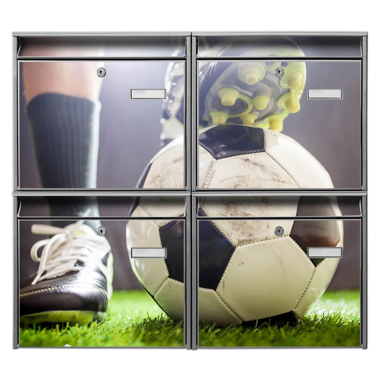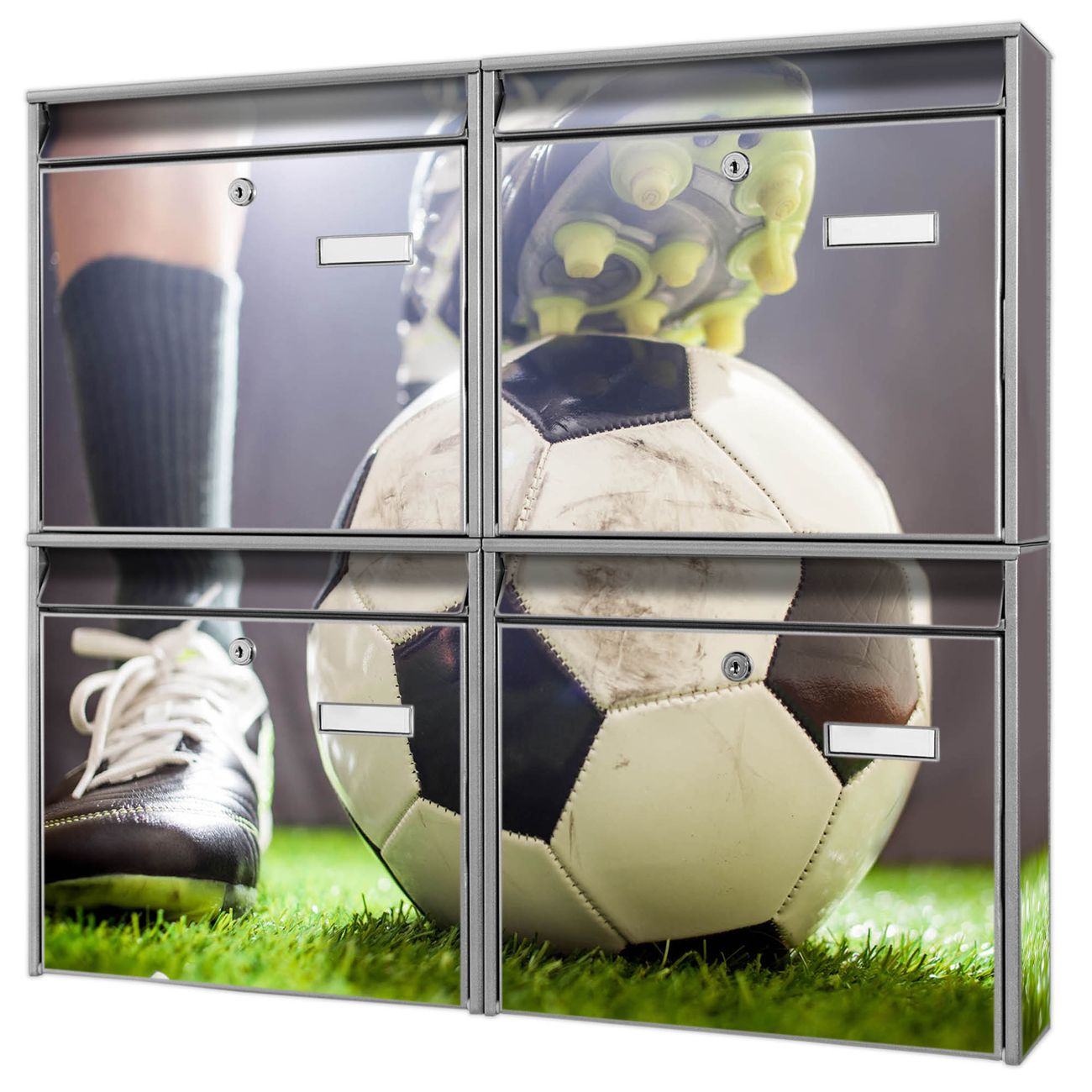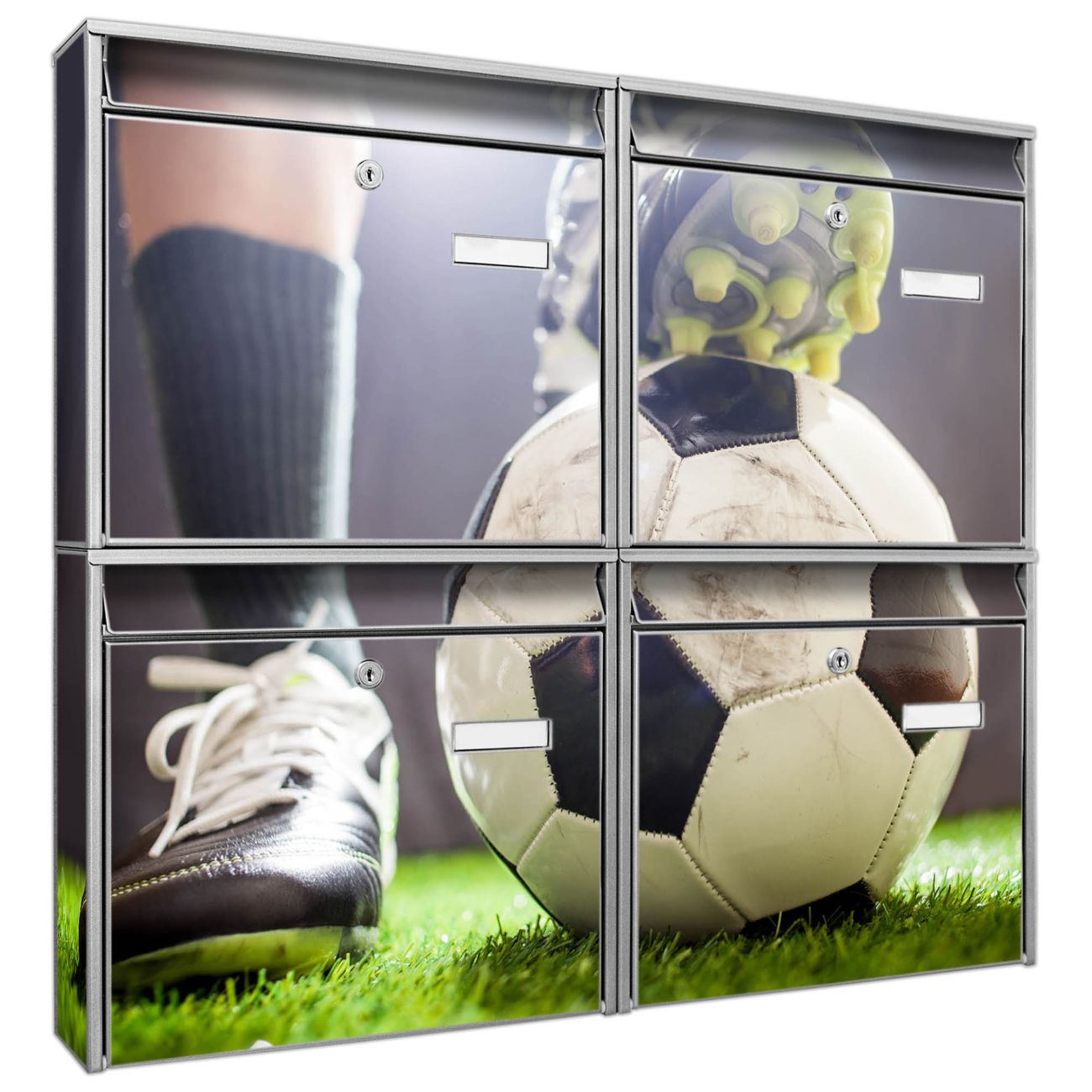 FUNKTION: Die Burg-Wächter Briefkastenanlage mit Motiv Anpfiff bietet Ihnen ausreichend Fassungsvermögen um auch A4 und C4 Sendungen zu empfangen. Das integrierte Namensschild lässt sich individuell beschriften. Wählen Sie aus den Grundfarben weiß, silber und schwarz. DESIGN: Die 4 Briefkästen haben ein ansprechendes und zeitloses Design, ohne dabei auf Funktionalität zu verzichten. Das Material ist sehr stabil, wetterfest und rostfrei. Durch das Motiv Anpfiff werden die Postkästen zu einem Blickfang. DETAILS: Die Postkästen bestehen aus verzinktem Stahl der zusätzlich mit Klarlack versiegelt wurde. Die Kästen sind gesamt 64,5cm hoch, 72,5cm breit und 10cm tief. Das Motiv besteht aus einer wetter- und UV-festen Folie, die Ihren Briefkasten zusätzlich vor Kratzern schützt. Die Postkästen werden mit Montagematerial, je einem Namensschild und je zwei Schlüsseln geliefert. NUTZEN: Das Briefkastenset eignet sich für die Wandmontage, die Größe bietet genügend Platz für Sendungen aller Art. Das zeitlose Design sowie die stabile Bauart bieten Ihnen einen treuen Begleiter für Ihre Post. BANJADO: