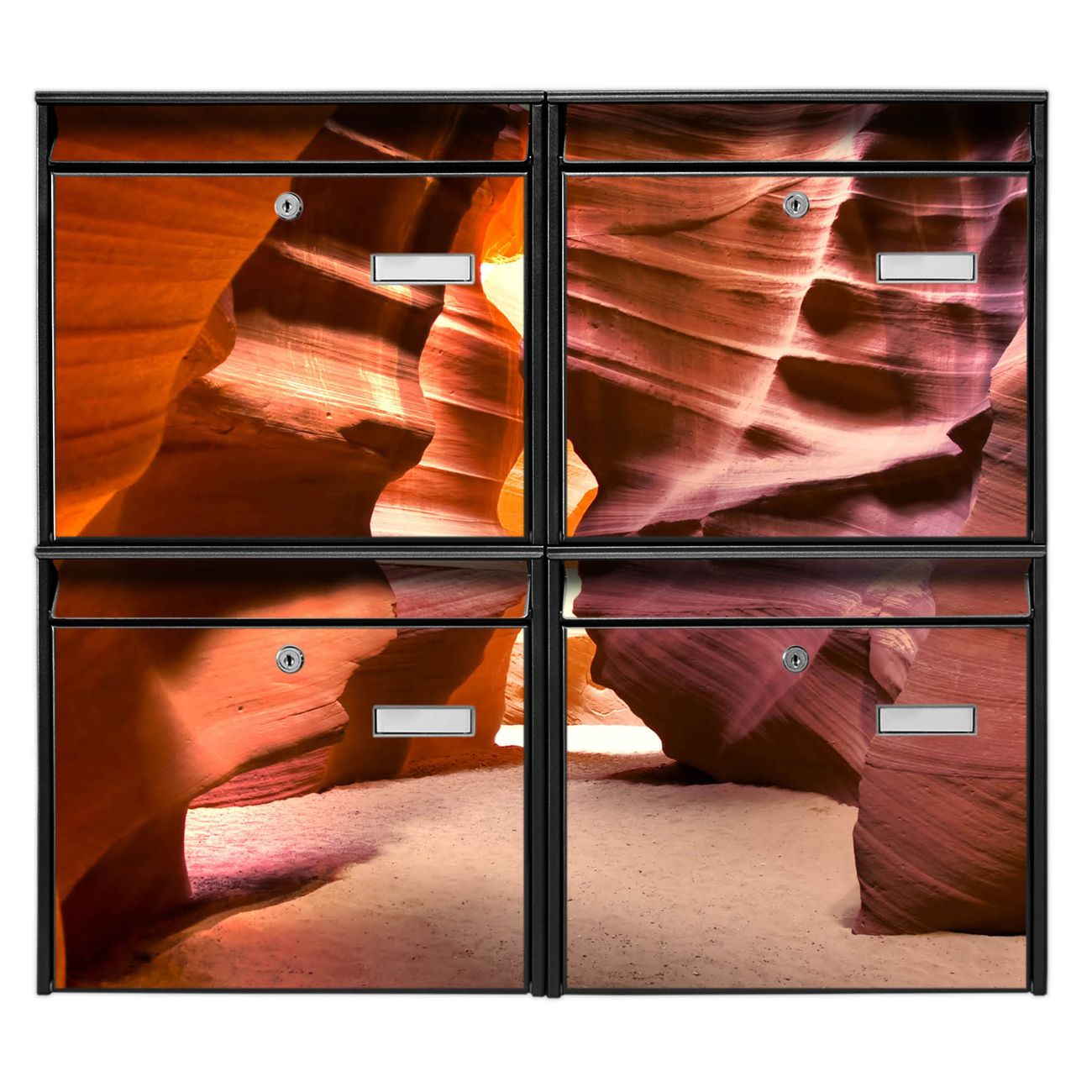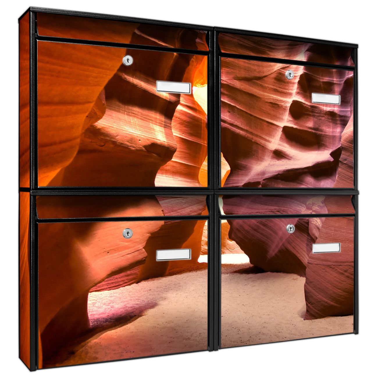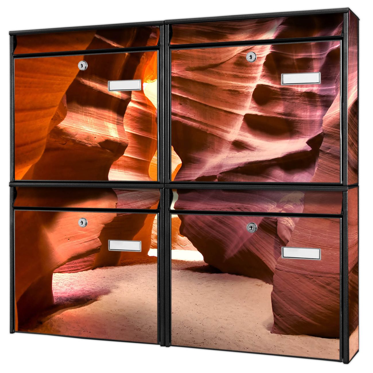 FUNKTION: Die Burg-Wächter Briefkastenanlage mit Motiv Antelope Canyon bietet Ihnen ausreichend Fassungsvermögen um auch A4 und C4 Sendungen zu empfangen. Das integrierte Namensschild lässt sich individuell beschriften. Wählen Sie aus den Grundfarben weiß, silber und schwarz. DESIGN: Die 4 Briefkästen haben ein ansprechendes und zeitloses Design, ohne dabei auf Funktionalität zu verzichten. Das Material ist sehr stabil, wetterfest und rostfrei. Durch das Motiv Antelope Canyon werden die Postkästen zu einem Blickfang. DETAILS: Die Postkästen bestehen aus verzinktem Stahl der zusätzlich mit Klarlack versiegelt wurde. Die Kästen sind gesamt 64,5cm hoch, 72,5cm breit und 10cm tief. Das Motiv besteht aus einer wetter- und UV-festen Folie, die Ihren Briefkasten zusätzlich vor Kratzern schützt. Die Postkästen werden mit Montagematerial, je einem Namensschild und je zwei Schlüsseln geliefert. NUTZEN: Das Briefkastenset eignet sich für die Wandmontage, die Größe bietet genügend Platz für Sendungen aller Art. Das zeitlose Design sowie die stabile Bauart bieten Ihnen einen treuen Begleiter für Ihre Post. BANJADO: